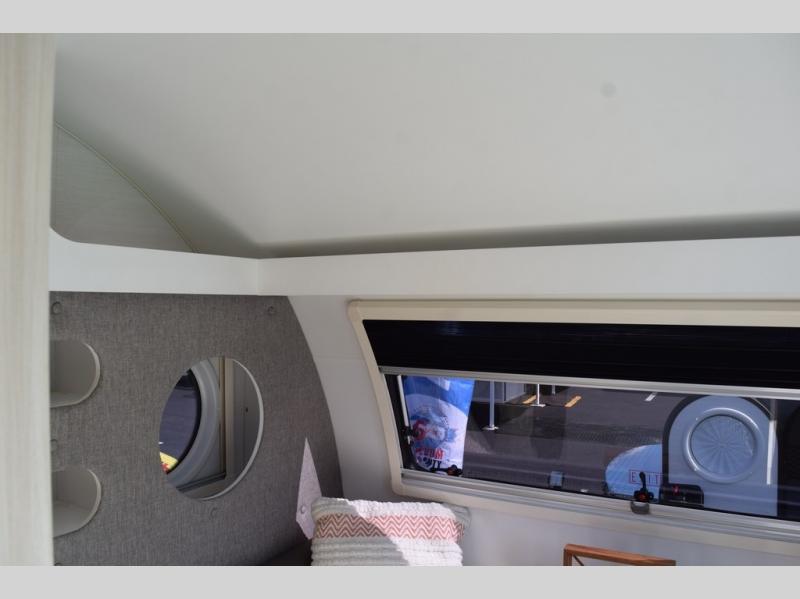 This teardrop trailer offers sleeping space for three with two sleeping areas; one up front and one in the rear. The dinette allows you to eat and relax during the day, and at night this space becomes sleeping space for one. And if you're needing even more sleeping space, you can choose the optional bunk floorplan! The queen-size sleeping area is located on the opposite side with the wet bath in between for convenience for all. The galley kitchen will give the cook a place to make warm meals and store leftovers in the 4.6 cu. ft. 12V compressor refrigerator. Everyone can watch the 24" TV through the Bluetooth media center before bedtime, or in the morning as you all plan your next activity. And the Alde central heating/hot water system, as well as central air conditioning will keep you comfortable wherever you set up. An optional Black Canyon Upgrade is available with an additional 310-watt solar panel, holding tank heaters, underglow lights, and an XL diamond plate storage tub.