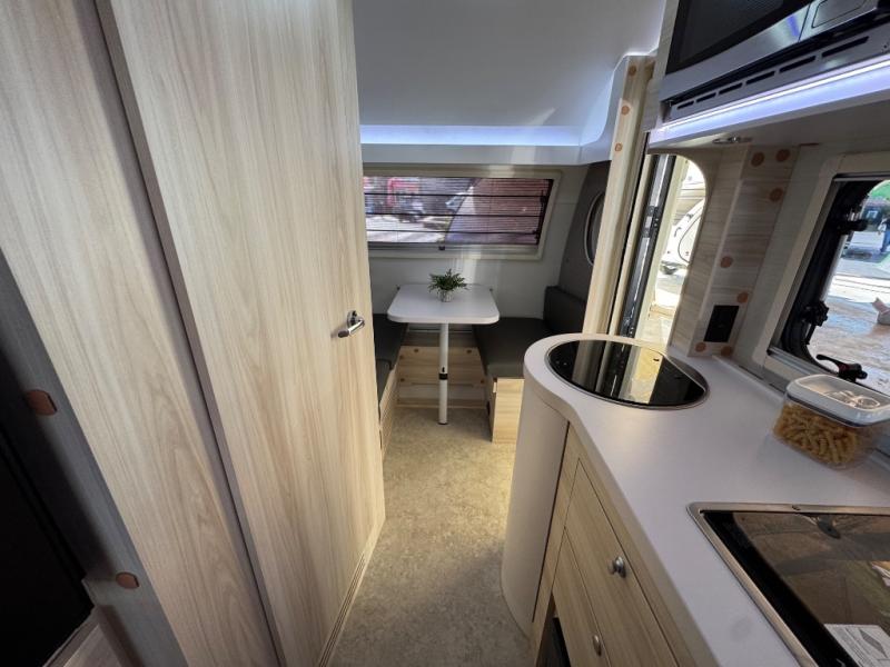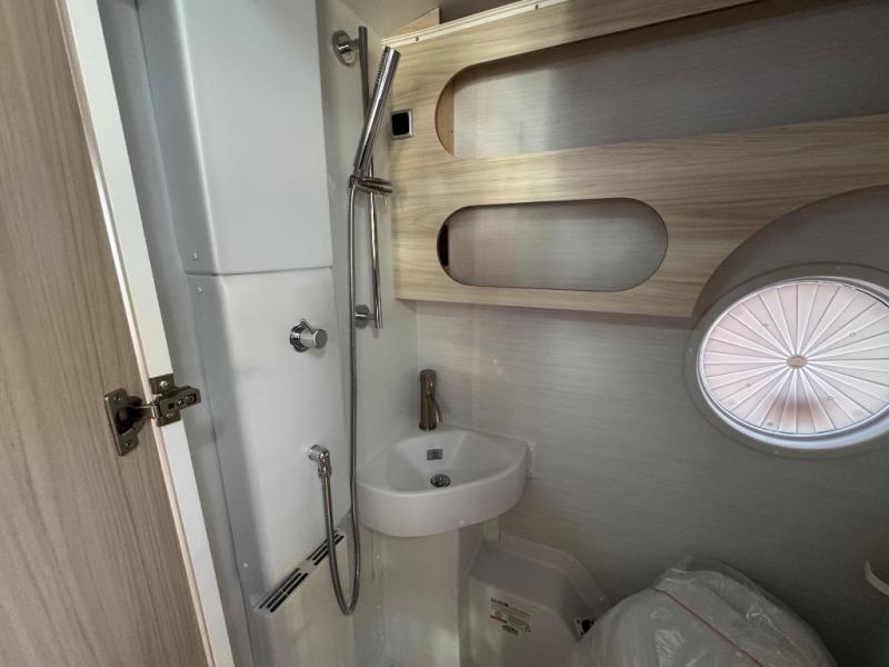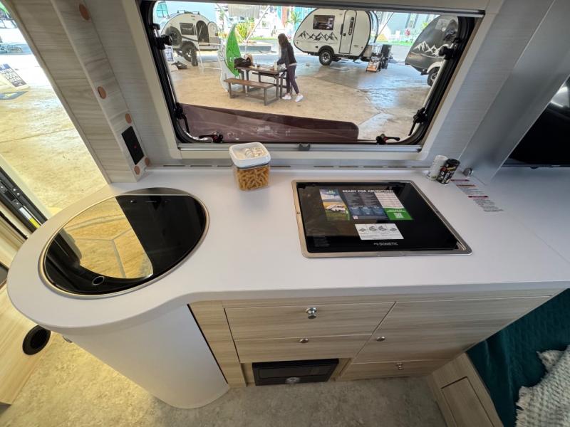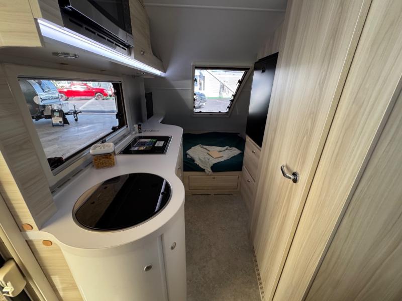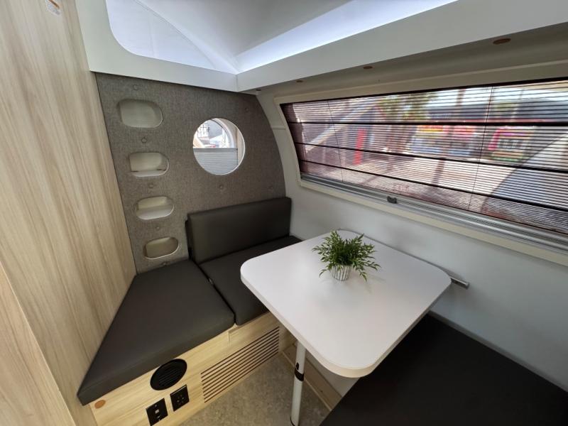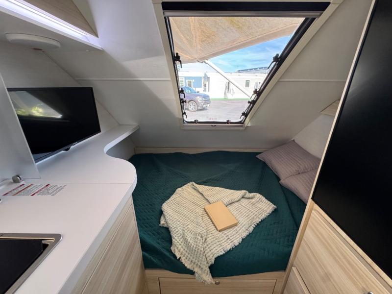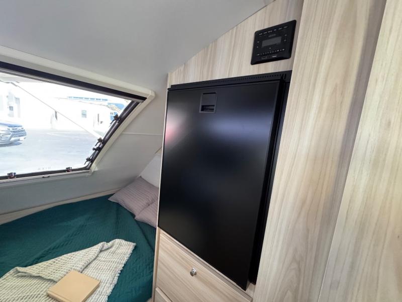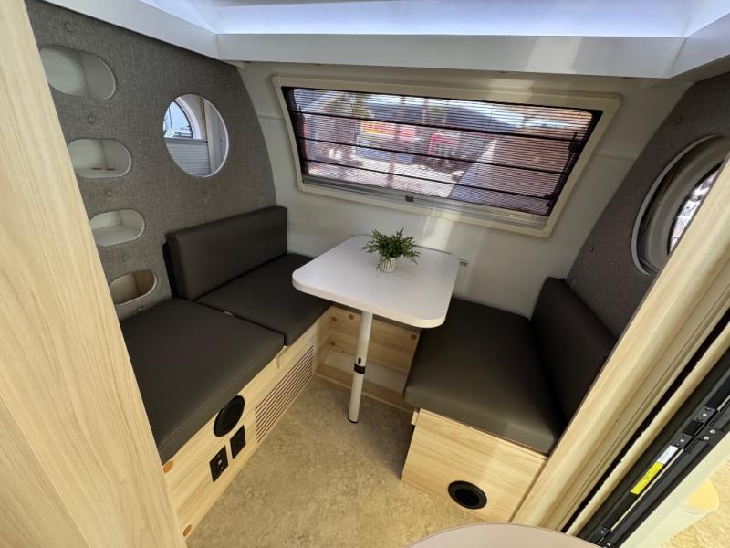 This teardrop trailer offers sleeping space for three with two sleeping areas; one up front and one in the rear. The dinette allows you to eat and relax during the day, and at night this space becomes sleeping space for one. And if you're needing even more sleeping space, you can choose the optional bunk floorplan! The queen-size sleeping area is located on the opposite side with the wet bath in between for convenience for all. The galley kitchen will give the cook a place to make warm meals and store leftovers in the 4.6 cu. ft. 12V compressor refrigerator. Everyone can watch the 24" TV through the Bluetooth media center before bedtime, or in the morning as you all plan your next activity. And the Alde central heating/hot water system, as well as central air conditioning will keep you comfortable wherever you set up. An optional Black Canyon Upgrade is available with an additional 310-watt solar panel, holding tank heaters, underglow lights, and an XL diamond plate storage tub.