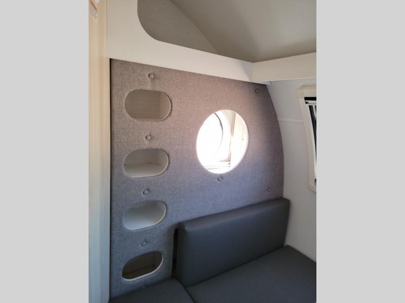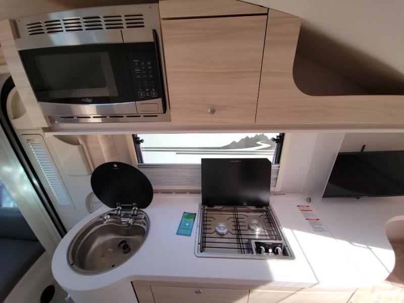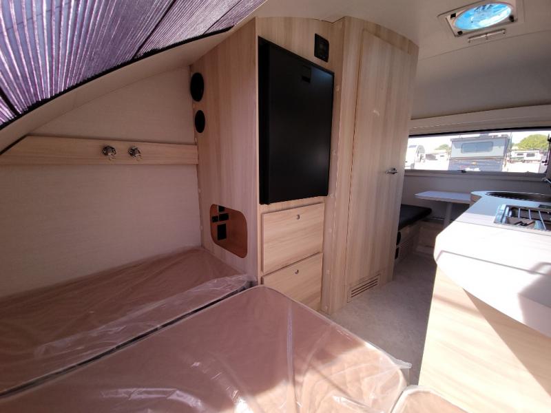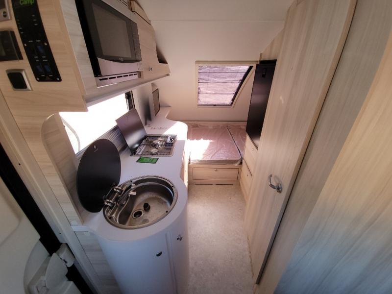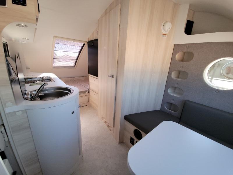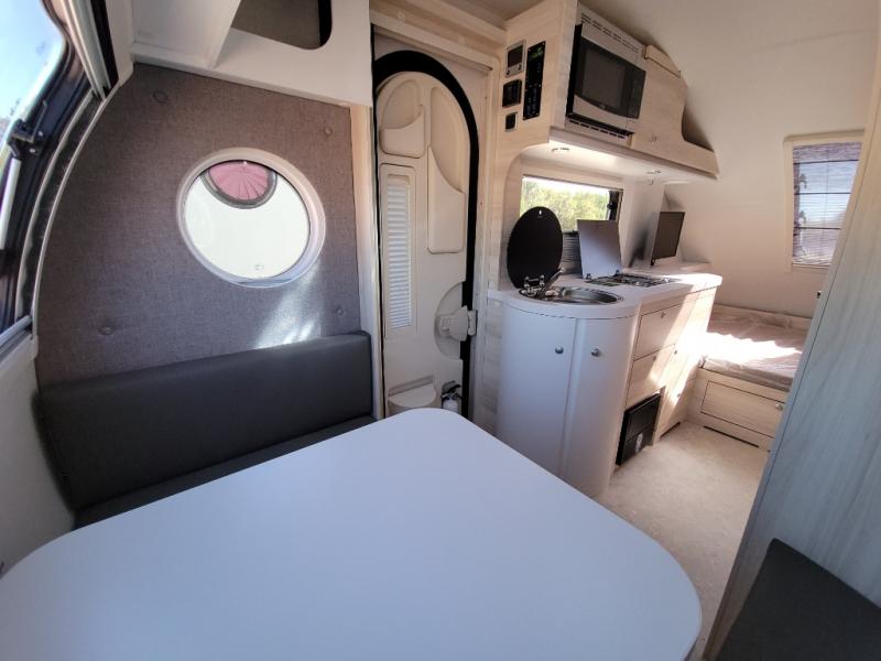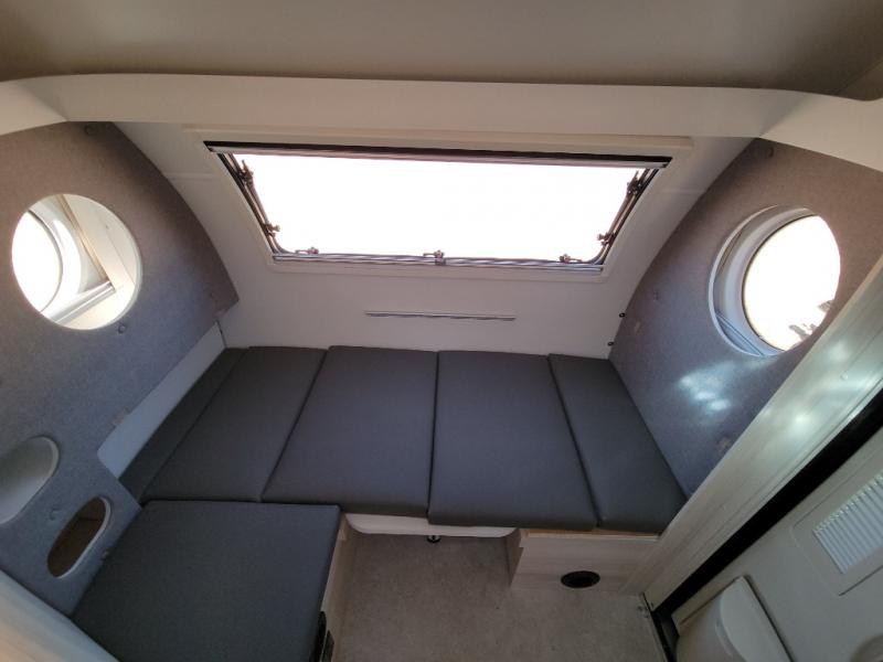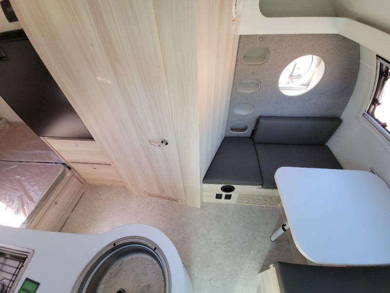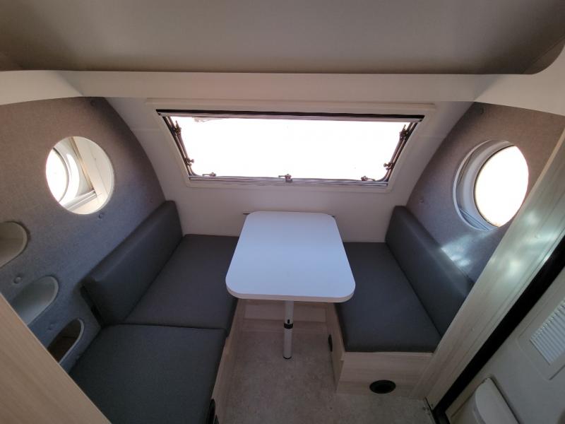 This teardrop trailer offers sleeping space for three with two sleeping areas; one up front and one in the rear. The dinette allows you to eat and relax during the day, and at night this space becomes sleeping space for one. And if you're needing even more sleeping space, you can choose the optional bunk floorplan! The queen-size sleeping area is located on the opposite side with the wet bath in between for convenience for all. The galley kitchen will give the cook a place to make warm meals and store leftovers in the 4.6 cu. ft. 12V compressor refrigerator. Everyone can watch the 24" TV through the Bluetooth media center before bedtime, or in the morning as you all plan your next activity. And the Alde central heating/hot water system, as well as central air conditioning will keep you comfortable where ever you set up. The Black Canyon optional package will have a dry tongue weight of 380 lbs., and a total gross dry weight of 2,946 lbs. The optional Classic package will have a tongue weight will be 355 lbs. and the total gross weight will be 2,915 lbs.