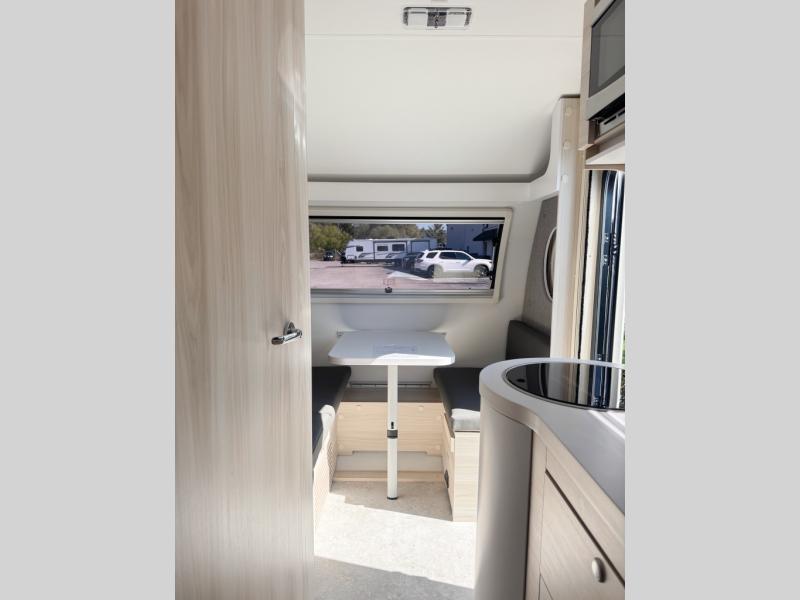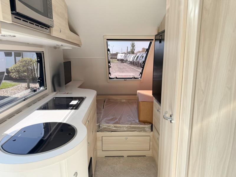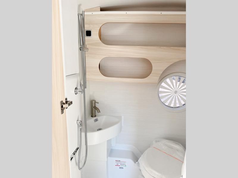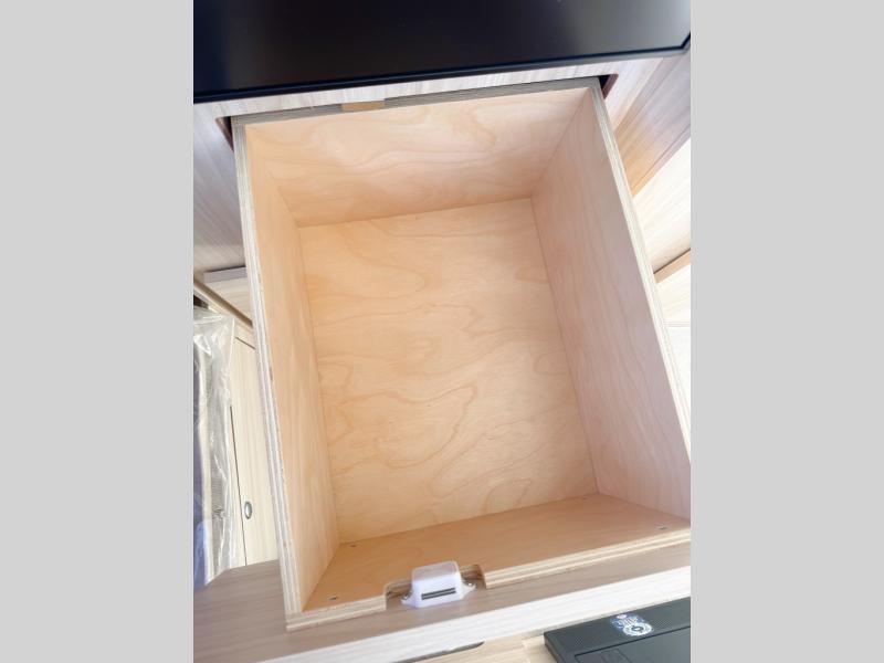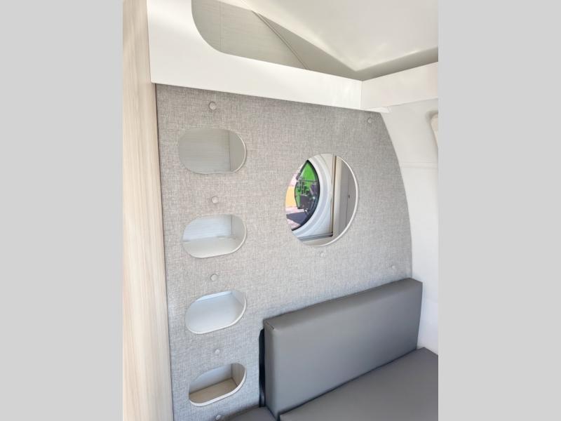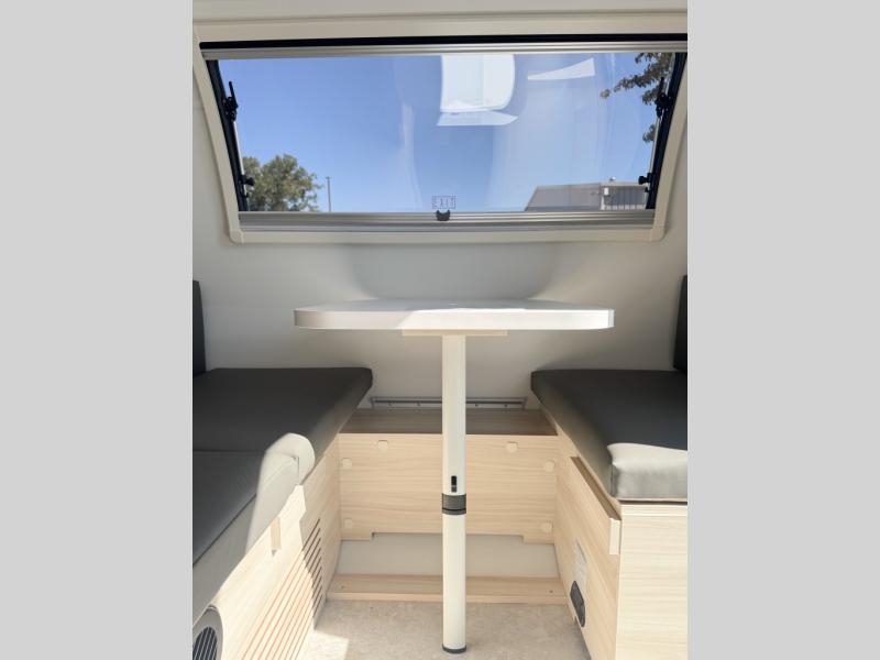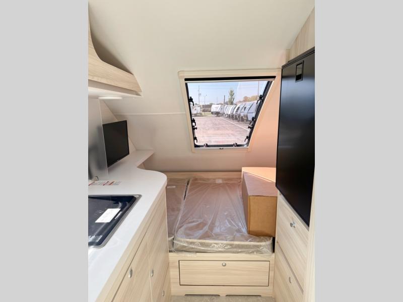 This teardrop trailer offers sleeping space for three with two sleeping areas; one up front and one in the rear. The dinette allows you to eat and relax during the day, and at night this space becomes sleeping space for one. And if you're needing even more sleeping space, you can choose the optional bunk floorplan! The queen-size sleeping area is located on the opposite side with the wet bath in between for convenience for all. The galley kitchen will give the cook a place to make warm meals and store leftovers in the 4.6 cu. ft. 12V compressor refrigerator. Everyone can watch the 24" TV through the Bluetooth media center before bedtime, or in the morning as you all plan your next activity. And the Alde central heating/hot water system, as well as central air conditioning will keep you comfortable wherever you set up. An optional Black Canyon Upgrade is available with an additional 310-watt solar panel, holding tank heaters, underglow lights, and an XL diamond plate storage tub.