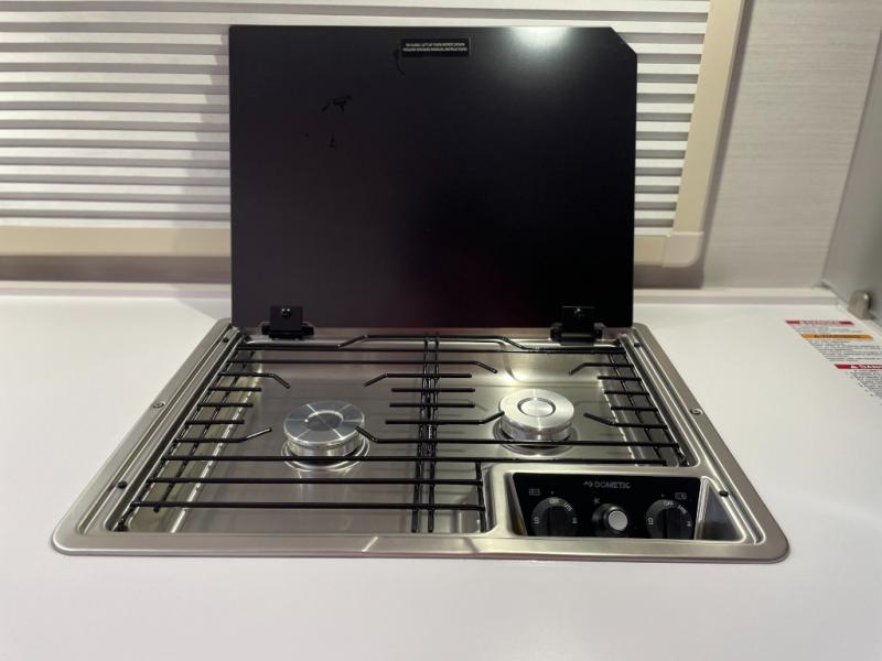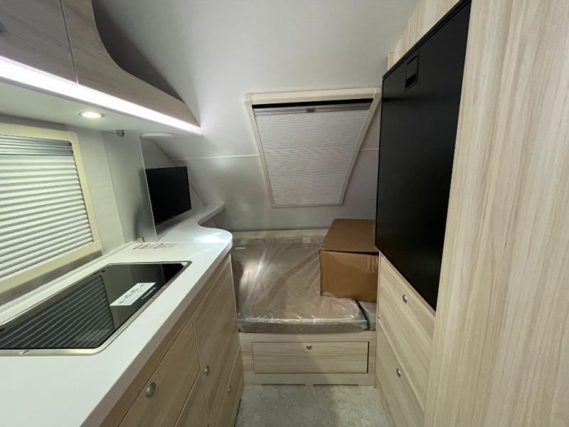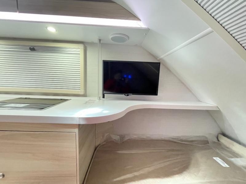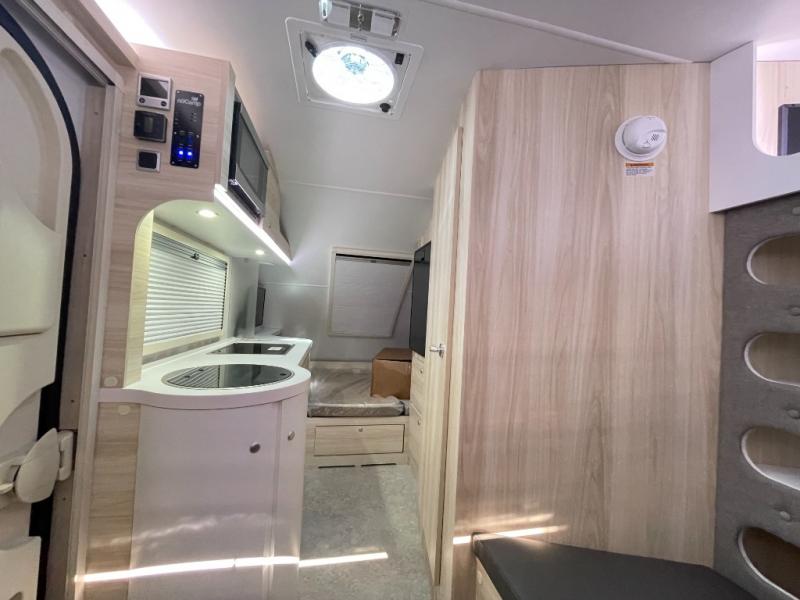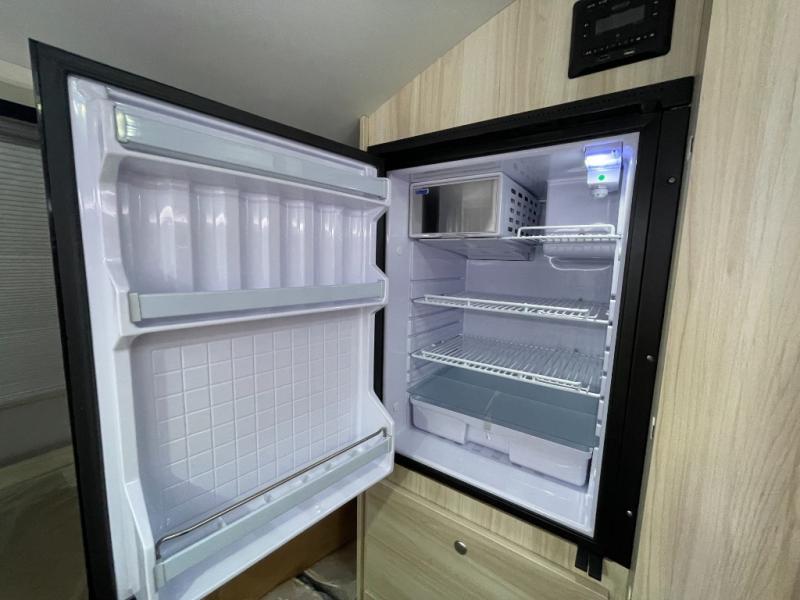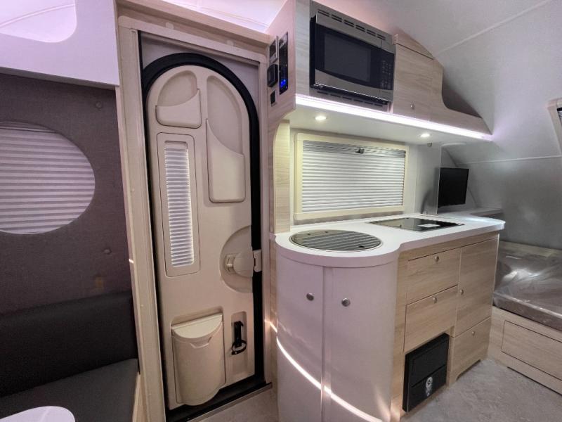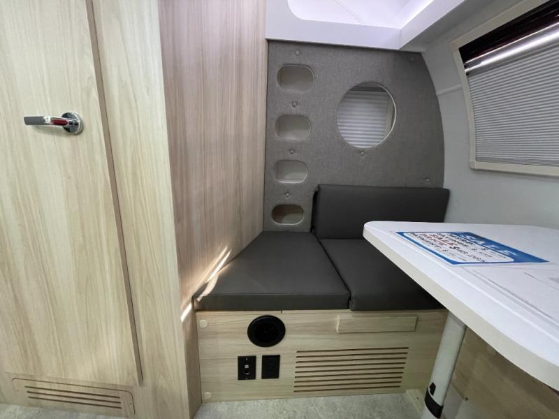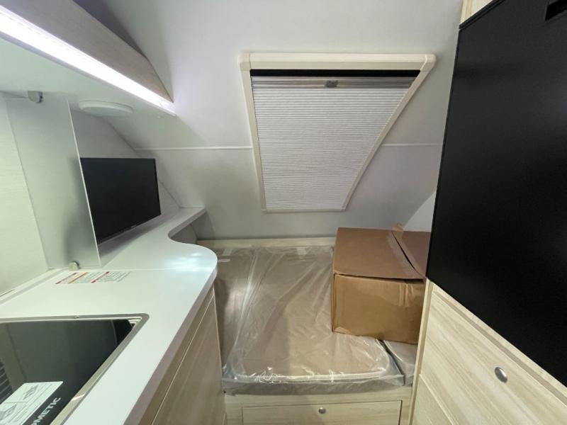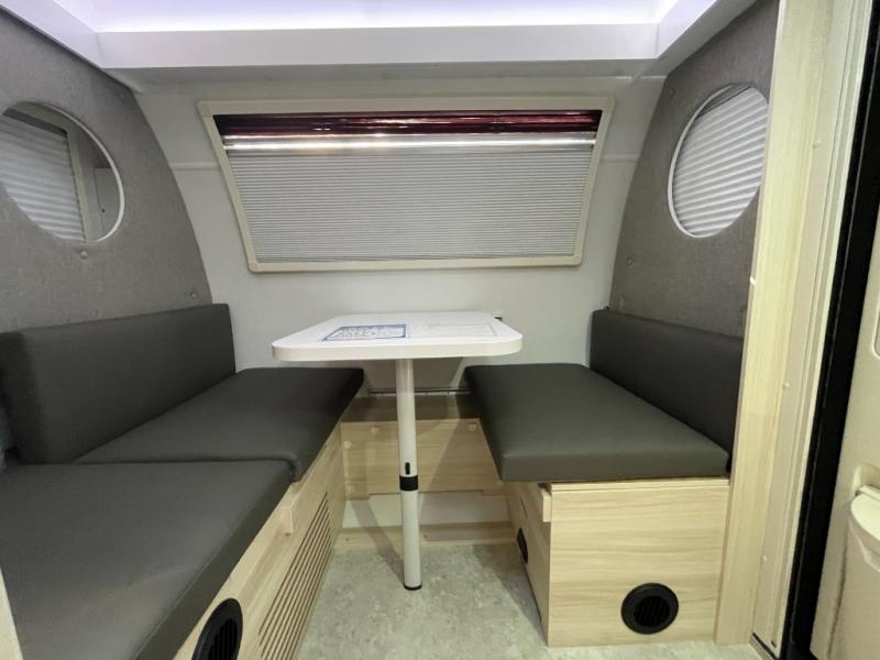 This teardrop trailer offers sleeping space for three with two sleeping areas; one up front and one in the rear. The dinette allows you to eat and relax during the day, and at night this space becomes sleeping space for one. And if you're needing even more sleeping space, you can choose the optional bunk floorplan! The queen-size sleeping area is located on the opposite side with the wet bath in between for convenience for all. The galley kitchen will give the cook a place to make warm meals and store leftovers in the 4.6 cu. ft. 12V compressor refrigerator. Everyone can watch the 24" TV through the Bluetooth media center before bedtime, or in the morning as you all plan your next activity. And the Alde central heating/hot water system, as well as central air conditioning will keep you comfortable wherever you set up. An optional Black Canyon Upgrade is available with an additional 310-watt solar panel, holding tank heaters, underglow lights, and an XL diamond plate storage tub.