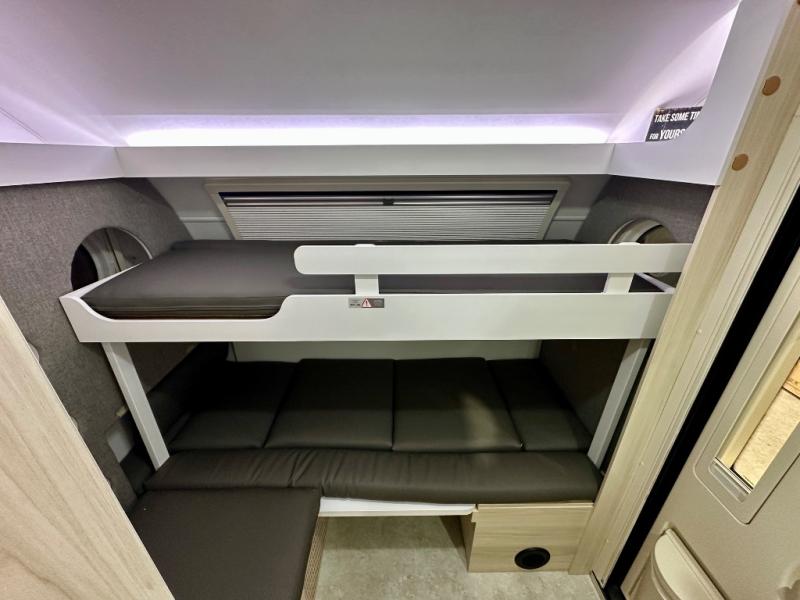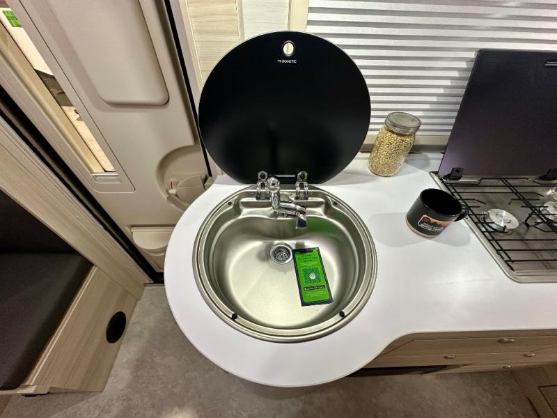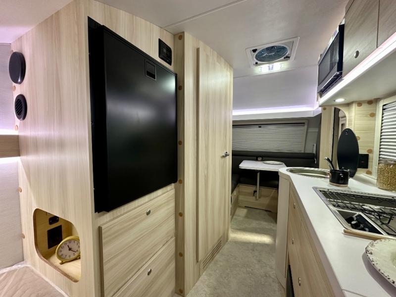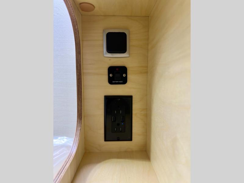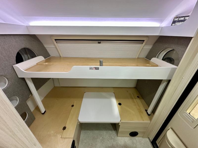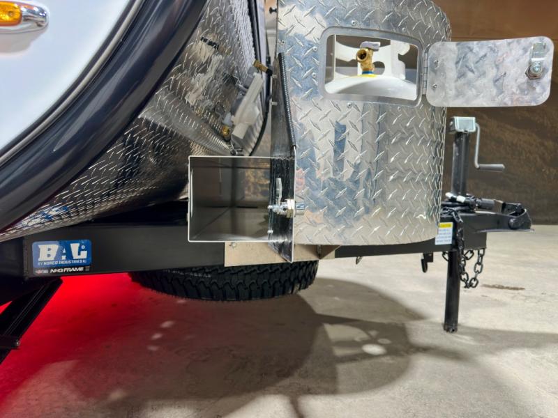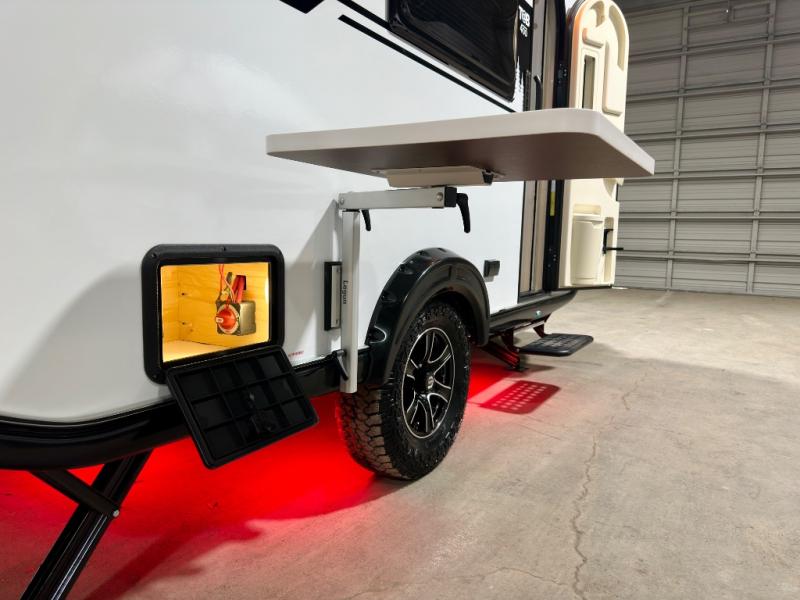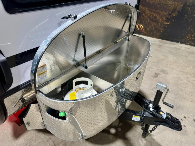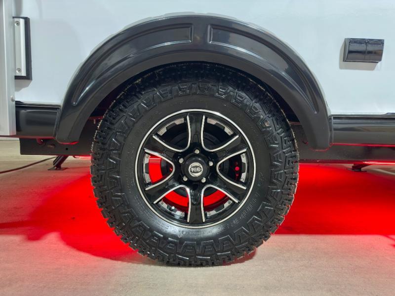 This teardrop trailer offers sleeping space for four with two sleeping areas; one up front and one in the rear plus a hidden bunk! The galley kitchen will give the cook a place to make warm meals and store leftovers in the 4.6 cu. ft. 12V compressor refrigerator. Everyone can watch the 24" TV through the Bluetooth media center before bedtime, or in the morning as you all plan your next activity. And the Alde central heating/hot water system, as well as central air conditioning will keep you comfortable wherever you set up. An optional Black Canyon Upgrade is available with an additional 310-watt solar panel, holding tank heaters, underglow lights, and an XL diamond plate storage tub.