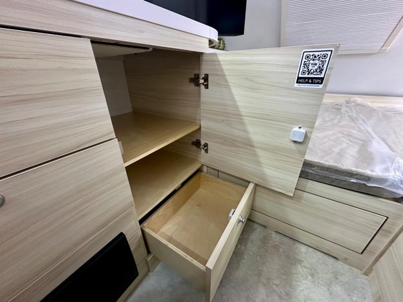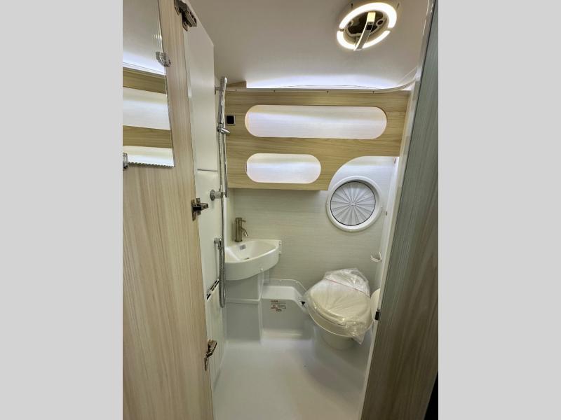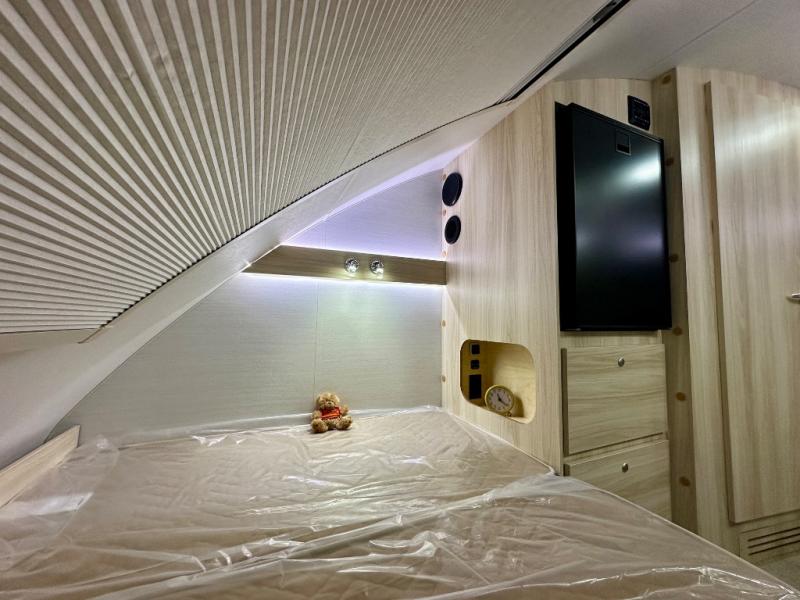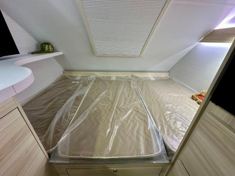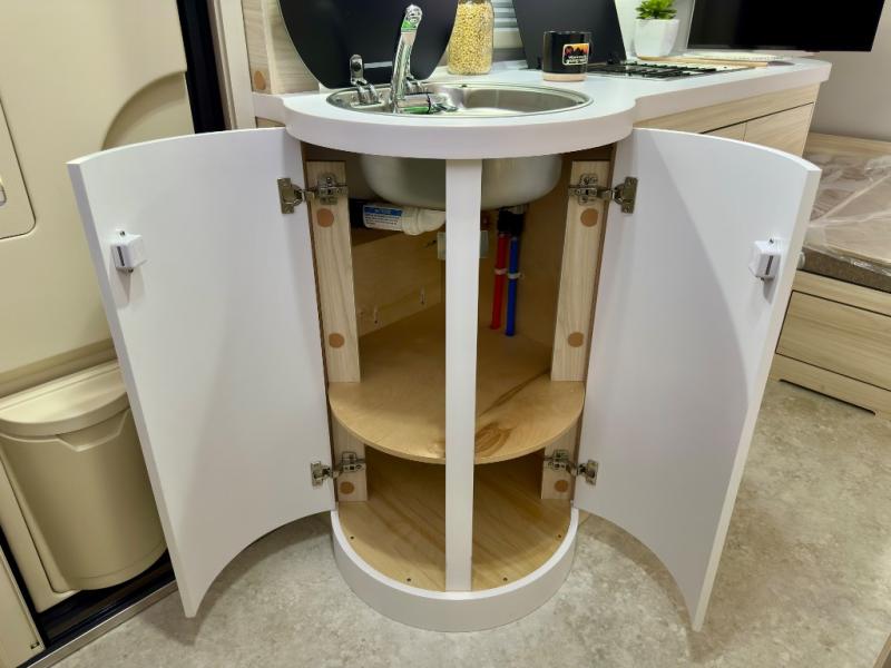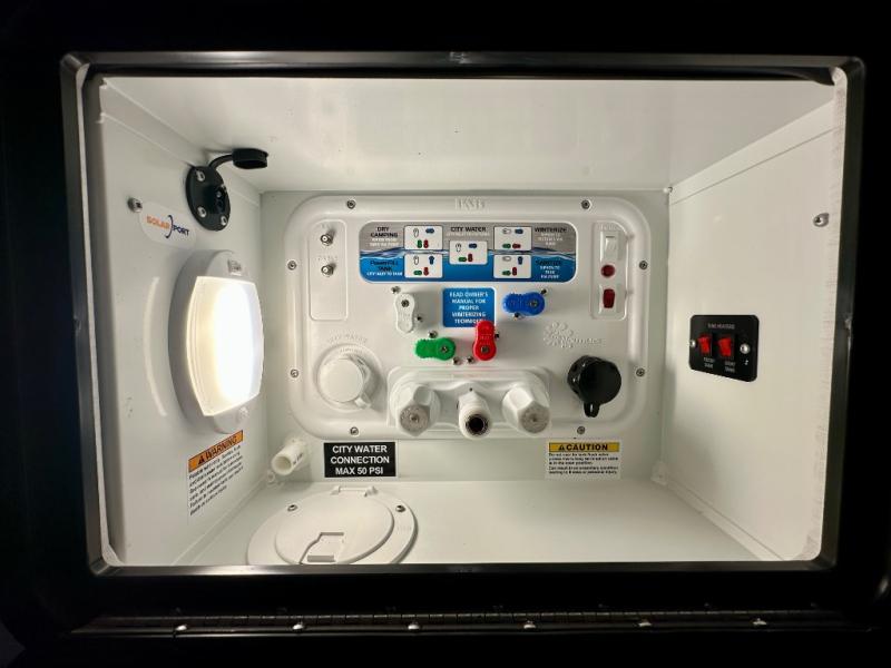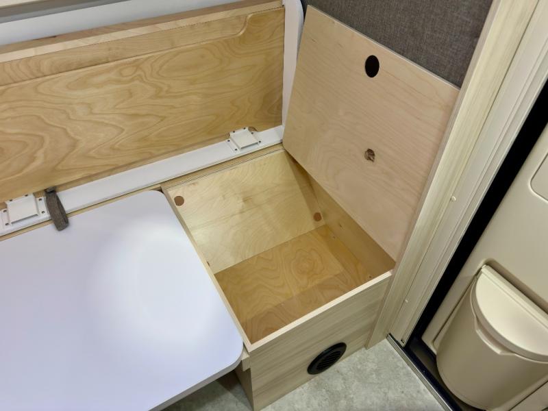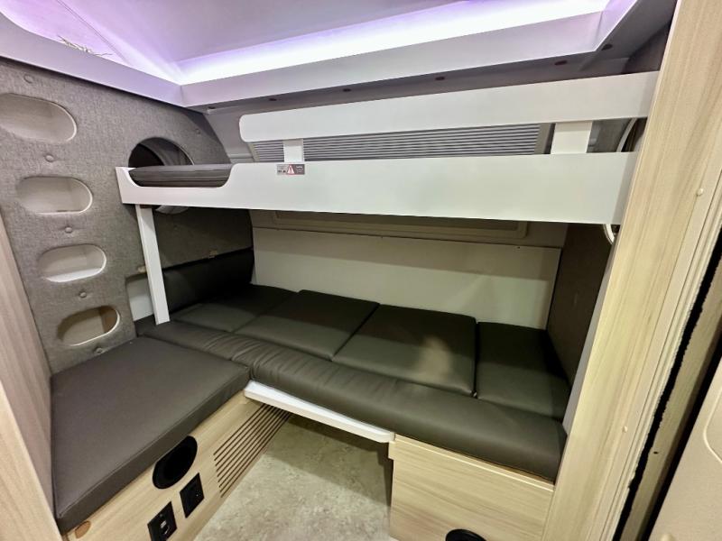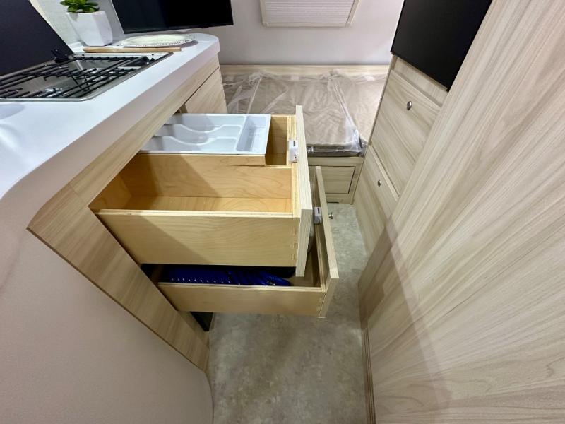 This teardrop trailer offers sleeping space for four with two sleeping areas; one up front and one in the rear plus a hidden bunk! The galley kitchen will give the cook a place to make warm meals and store leftovers in the 4.6 cu. ft. 12V compressor refrigerator. Everyone can watch the 24" TV through the Bluetooth media center before bedtime, or in the morning as you all plan your next activity. And the Alde central heating/hot water system, as well as central air conditioning will keep you comfortable wherever you set up. An optional Black Canyon Upgrade is available with an additional 310-watt solar panel, holding tank heaters, underglow lights, and an XL diamond plate storage tub.