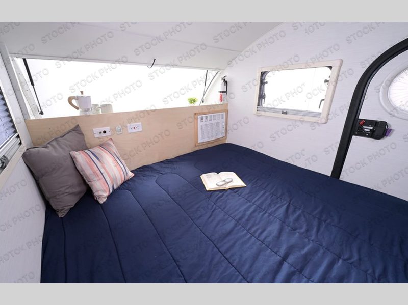 At the end of a long week, it will be easier than ever to hitch up this single axle teardrop trailer and head out! There are dual entry doors with porthole windows so you can see outdoors, plus there is a front stargazer window with a shade. The 3-speed fan and air conditioner will keep you comfortable all summer long, and there are 12-volt/110 USB outlets to keep your phone or camera charged. Once you've opened the rear hatch door, you can whip up some eggs on your electric griddle you brought along, and there is space under the countertop for your cooler or other essentials.