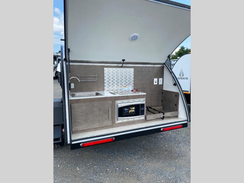 With any nuCamp RV TAG teardrop trailer, you can bring some of the comforts of home with you as you easily tow this lightweight trailer to the campgrounds. The outdoor kitchen includes a stainless steel sink and two-burner stove so you won't have to cook over a campfire each day. Inside, you'll find a composite floor, deluxe Amish cabinetry, sleeping accommodations, and a power roof fan to keep you comfortable. You will also appreciate the Convenience Package that comes with a 180-watt solar panel, a portable Bluetooth speaker, a 100 Ah 12-volt Lithium battery, and more!