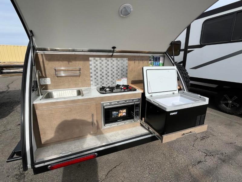 With any nuCamp RV TAG teardrop trailer, you can bring some of the comforts of home with you as you easily tow this lightweight trailer to the campgrounds. The outdoor kitchen includes a stainless steel sink and two-burner stove so you won't have to cook over a campfire each day. Inside, you'll find a composite floor, deluxe Amish cabinetry, sleeping accommodations, and a power roof fan to keep you comfortable. You will also appreciate the Convenience Package that comes with a 180-watt solar panel, a portable Bluetooth speaker, a 100 Ah 12-volt Lithium battery, and more!