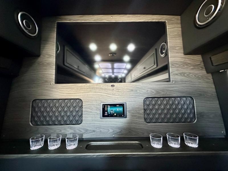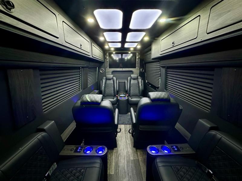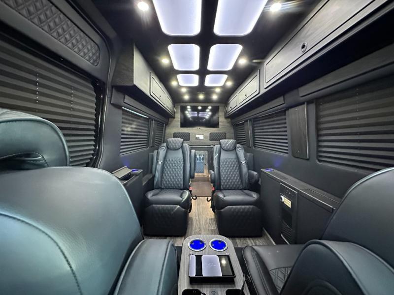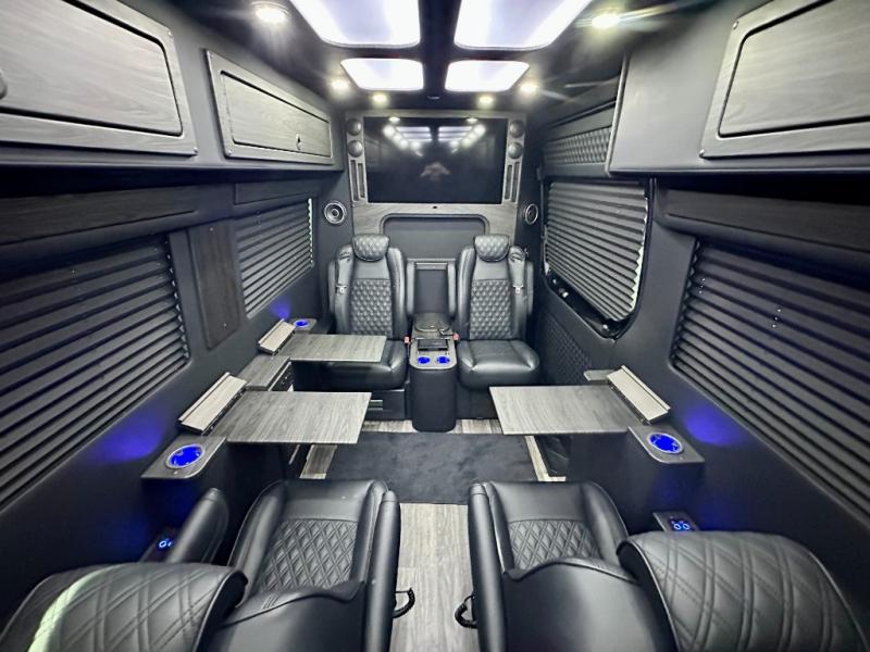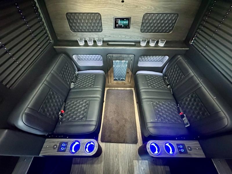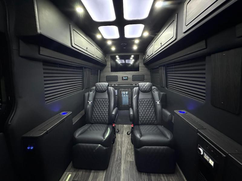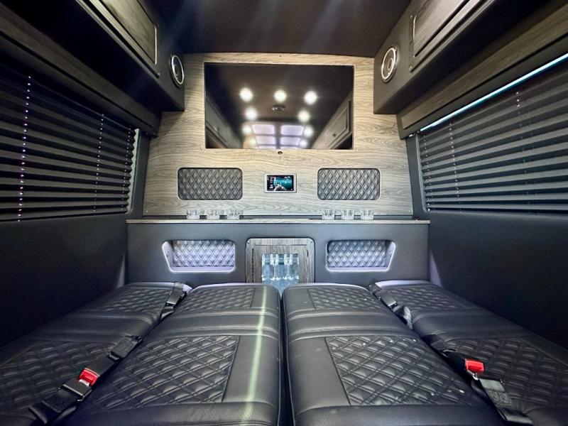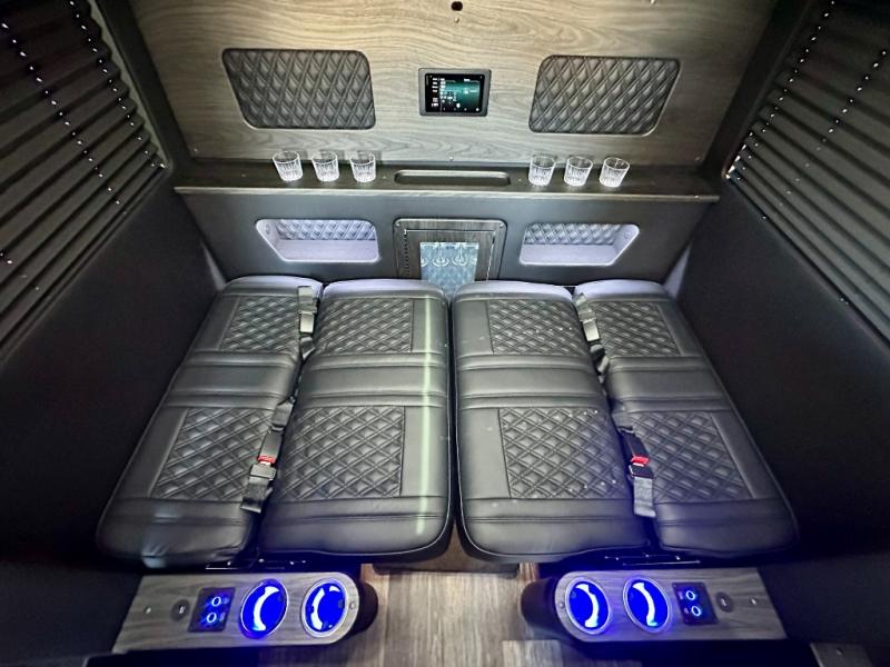 This luxurious van is designed for comfort and adventure! This coach will seat 10 passengers, plus, the rear offers ample storage, perfect for stashing gear, luggage, or supplies. Inside, enjoy premium entertainment with not one, but two LED TVs, providing endless entertainment options. Overhead cabinets keep essentials within reach, while the enter console and practical writing tables will make the ideal feature for working on the go or jotting down notes. Additional amenities include a trash can with a lid for keeping your space tidy and organized. Also, the opposing sofas/foldout bed will provide sleeping space for two once you drop your tag-along off.