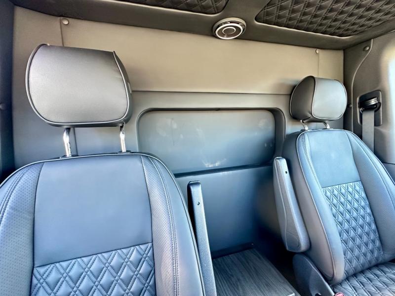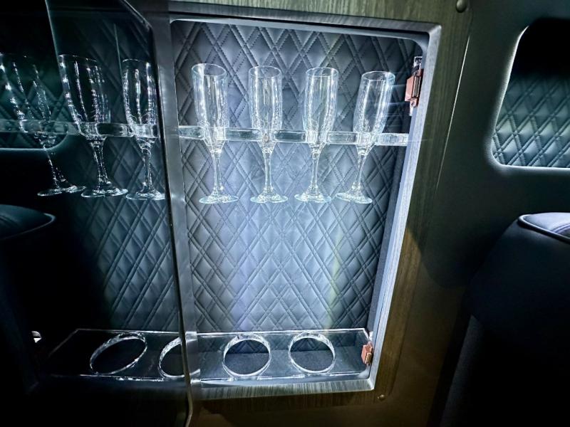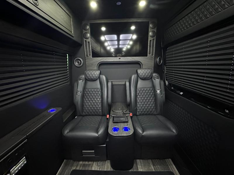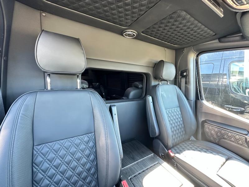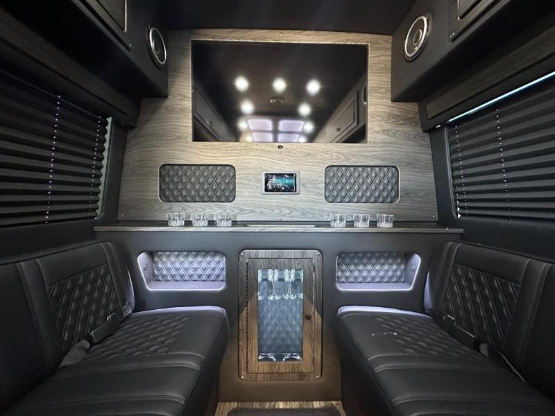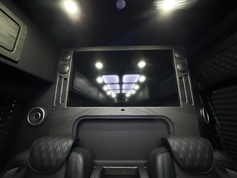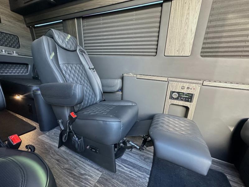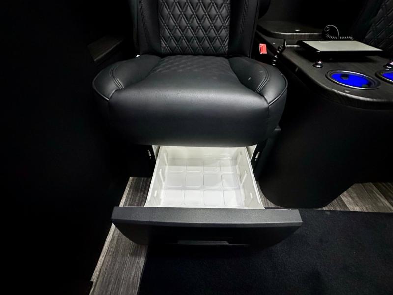 This luxurious van is designed for comfort and adventure! This coach will seat 10 passengers, plus, the rear offers ample storage, perfect for stashing gear, luggage, or supplies. Inside, enjoy premium entertainment with not one, but two LED TVs, providing endless entertainment options. Overhead cabinets keep essentials within reach, while the enter console and practical writing tables will make the ideal feature for working on the go or jotting down notes. Additional amenities include a trash can with a lid for keeping your space tidy and organized. Also, the opposing sofas/foldout bed will provide sleeping space for two once you drop your tag-along off.