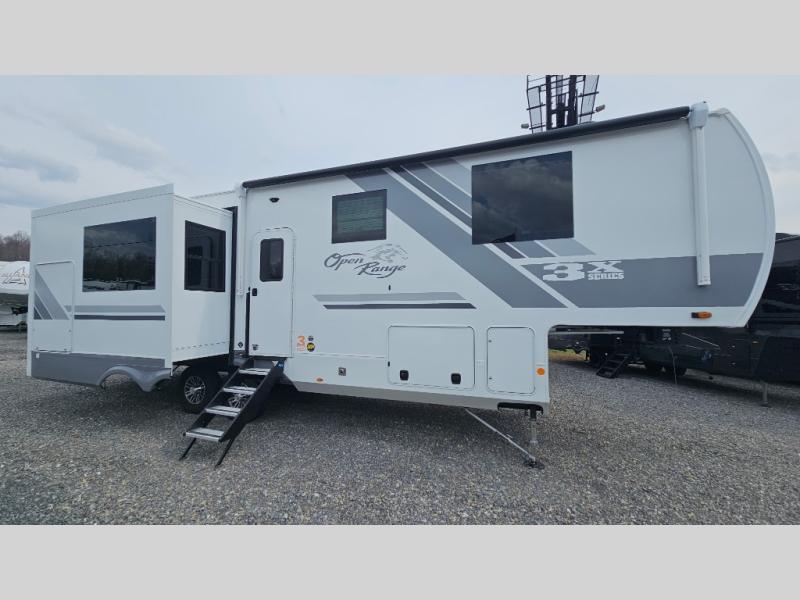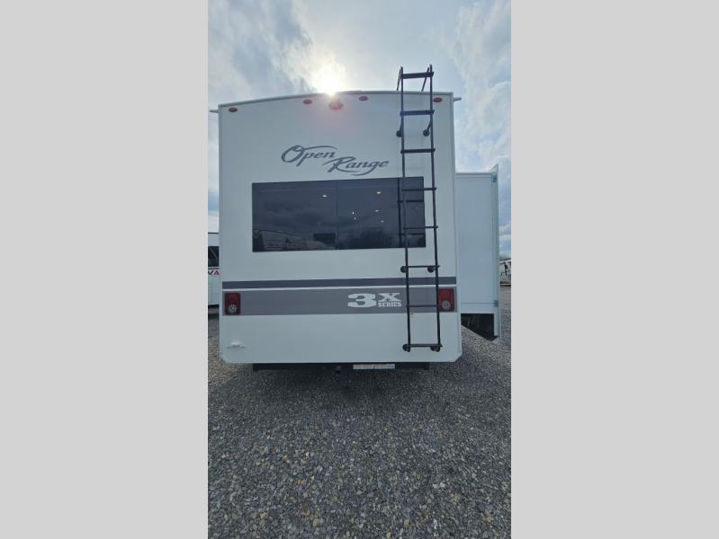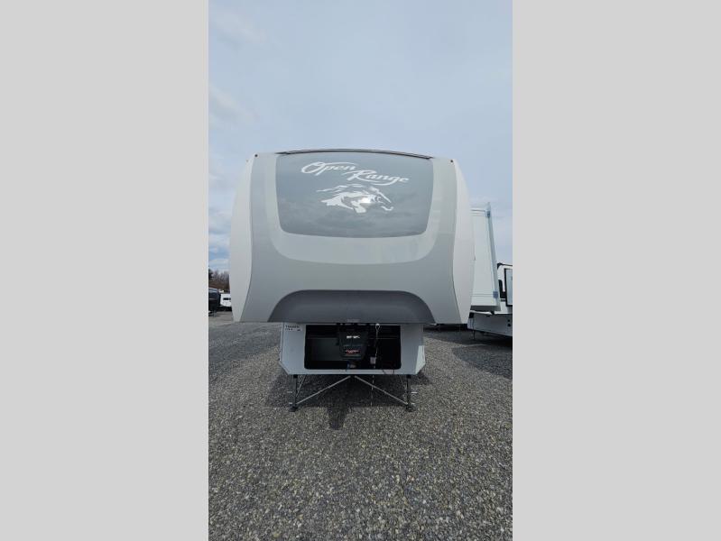 With any Open Range 3X fifth wheel by Open Range RV, you will enjoy residential luxuries and an exceptional build. The TuffShell construction includes vacuum bonded laminated fiberglass and welded aluminum frames for added strength, and the PVC roofing membrane is ultra durable. You can plan to camp year around or go full-time since there is a mandatory Four Season Package that includes a heated and enclosed underbelly, a 40K BTU high-performance furnace, double insulated baggage doors, and more. The residential features continue on with the mandatory Executive Package with the TravelLINK Smart RV system, Keyed-Alike entry and baggage doors, painted fiberglass front cap with LED lighting, and three 15,000 BTU A/C units with quiet residential return air. Inside, you'll enjoy GE kitchen appliances, sleek square windows with integrated blinds, ceramic subway tile backsplash, a glass shower door, and the list of amenities goes on!