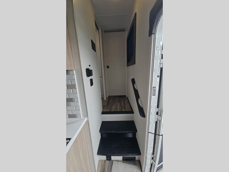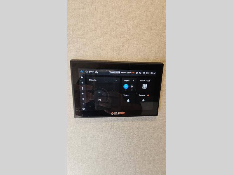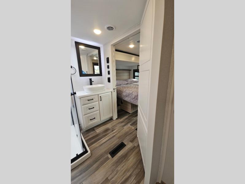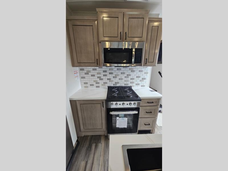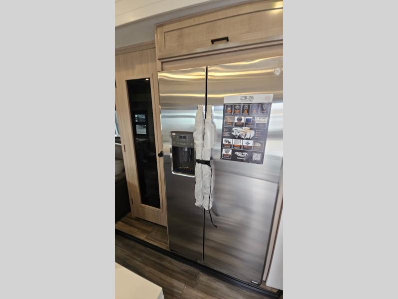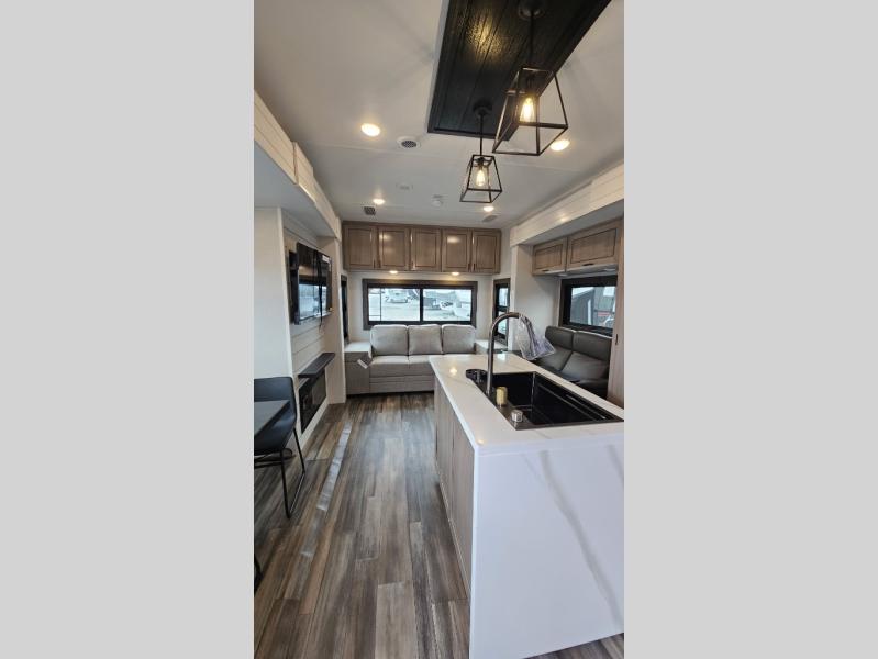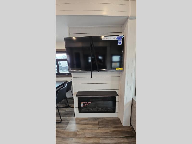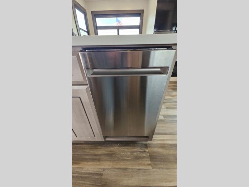 You will love the great space and layout in this amazing fifth wheel! The rear living area features theater seats as well as a tri-fold sofa with adjustable headrests. It's the perfect place to watch a movie on the Smart TV located in the entertainment center with fireplace! The kitchen includes a full suite of GE residential appliances, including a 4-burner range, 21 cu. ft. refrigerator, and over-the range microwave. Also, standard are a dishwasher and central vacuum system so cleaning up is easy! At night retire to the bedroom with its king bed with power base. A second TV lets you watch your favorite shows as you fall asleep. Storage abounds including a full wardrobe and dresser with a pull-out top. A dual-entry full bath is easily accessible and includes even more storage with a linen closet!
