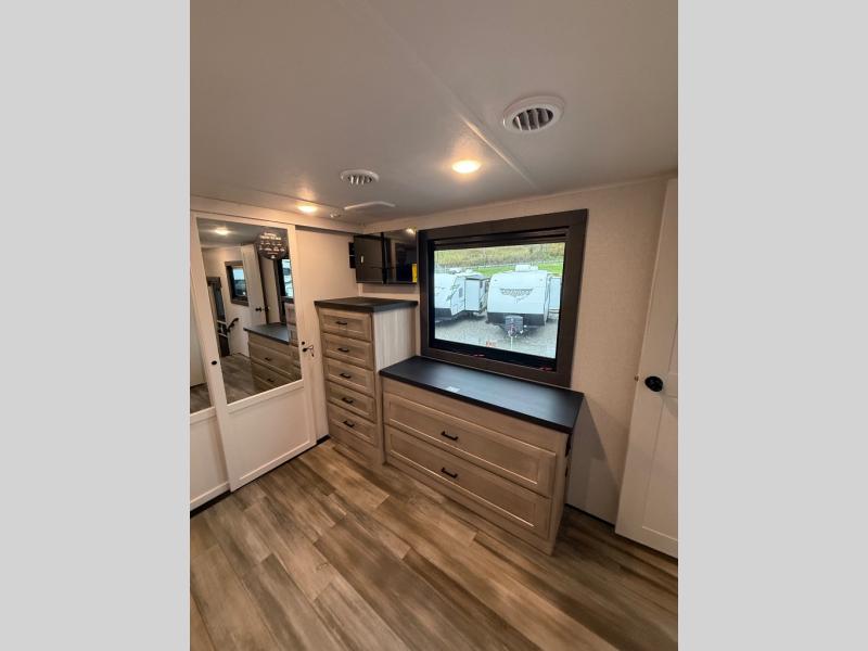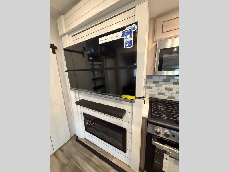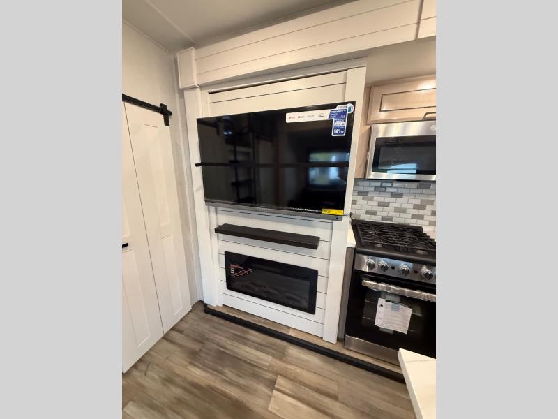 With any Open Range 3X fifth wheel by Open Range RV, you will enjoy residential luxuries and an exceptional build. The TuffShell construction includes vacuum bonded laminated fiberglass and welded aluminum frames for added strength, and the PVC roofing membrane is ultra durable. You can plan to camp year around or go full-time since there is a mandatory Four Season Package that includes a heated and enclosed underbelly, a 40K BTU high-performance furnace, double insulated baggage doors, and more. The residential features continue on with the mandatory Executive Package with the TravelLINK Smart RV system, Keyed-Alike entry and baggage doors, painted fiberglass front cap with LED lighting, and three 15,000 BTU A/C units with quiet residential return air. Inside, you'll enjoy GE kitchen appliances, sleek square windows with integrated blinds, ceramic subway tile backsplash, a glass shower door, and the list of amenities goes on!