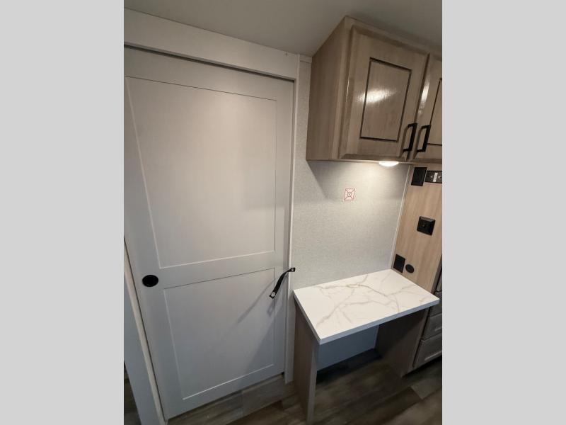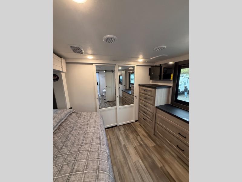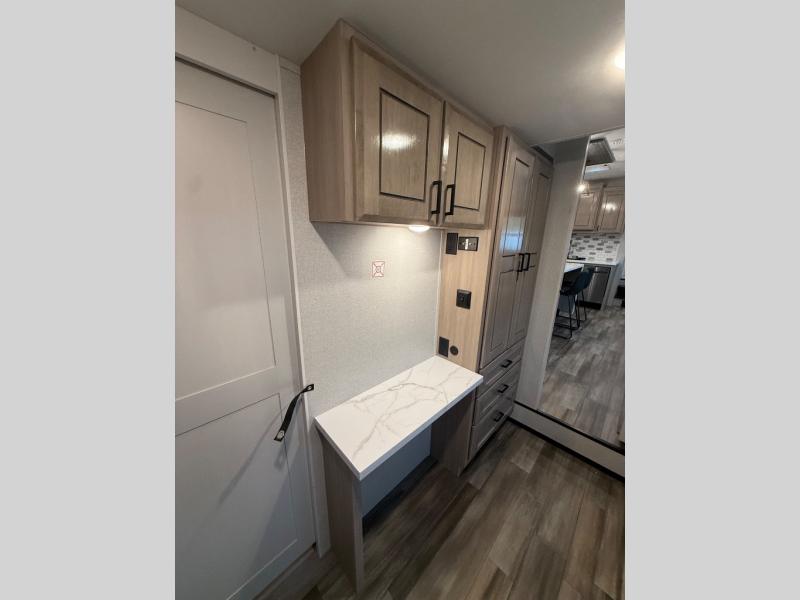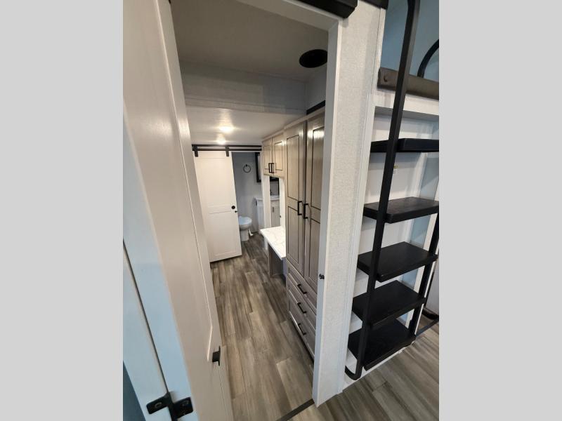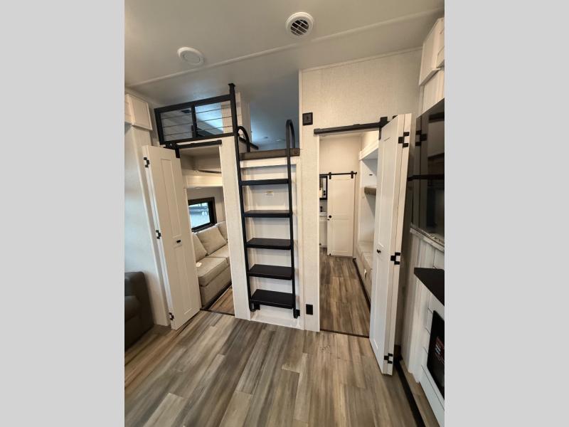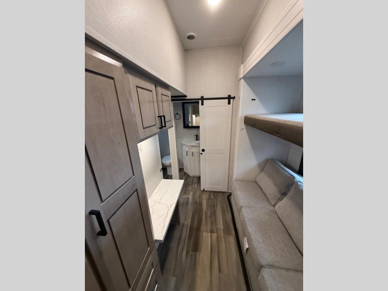 If you enjoy luxury camping or you're looking for a residential fifth wheel to go full-time in, this Open Range 3X is the one! The middle kitchen and living room is made open by the dual opposing slides, and your crew can get comfortable on the mega lounge with two tables. The chef of your group will love cooking on GE free-standing four burner range, or they can use the GE residential microwave to heat up leftovers. The standard dishwasher and central vacuum make cleanup a breeze. A waterfall island with four chairs will provide a place to dine and the hidden pantry behind the swing-out entertainment center can hold snacks galore. There is also a fireplace and smart HDTV to make movie nights cozy. The front master bedroom includes a slide out 72" x 78" king bed, two dressers, a large front closet, and a 32" TV to watch shows in bed. You even have your own entrance into the full bath, plus washer and dryer prep if you choose to add those appliances. The rear bunkhouse suite includes two separate sides that can be shut off from one another, perfect if you have older kids or more than one guest. Each side includes a bi-fold sofa, a desk with overhead storage, and a wardrobe with drawers. And one side even includes a flip-up bunk above the sofa for more sleeping space! The shared full rear bath includes a tub/shower to make bath time easier than ever, plus you'll find one of the dual entry doors here for added convenience!