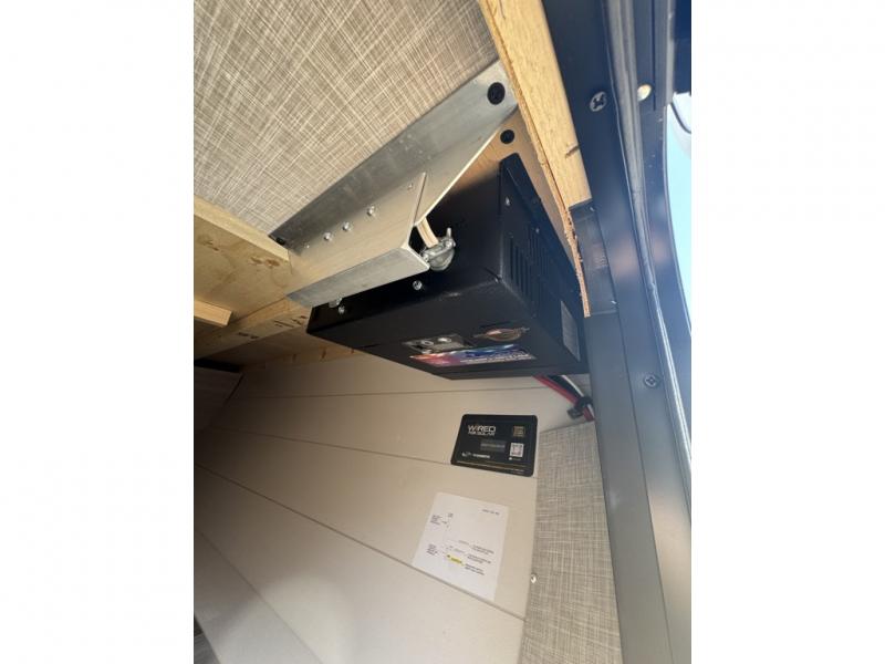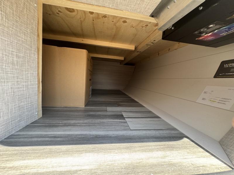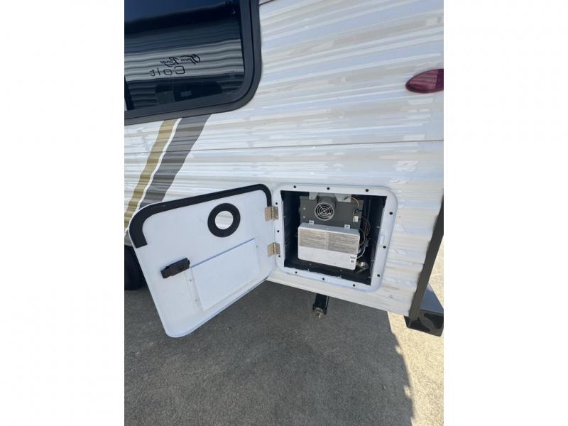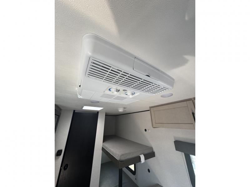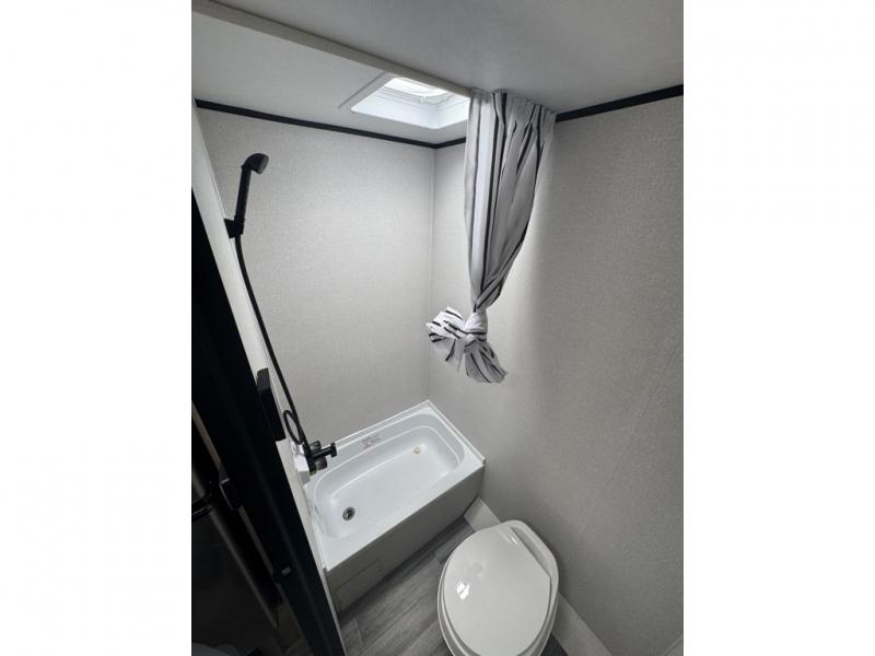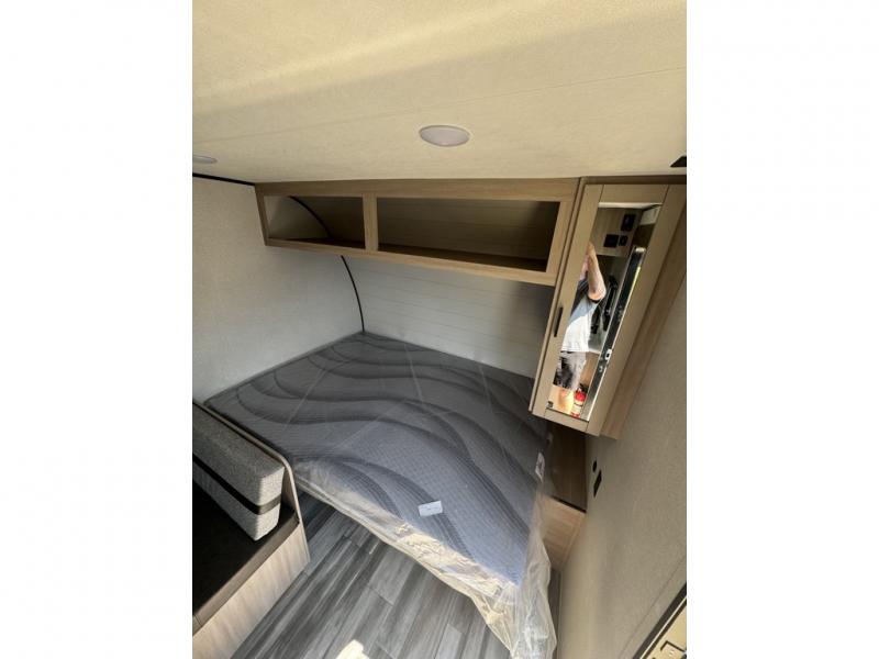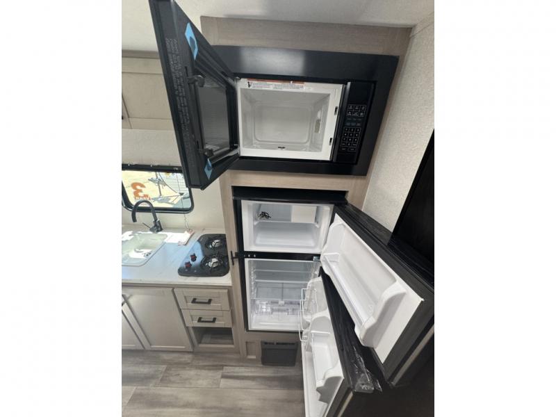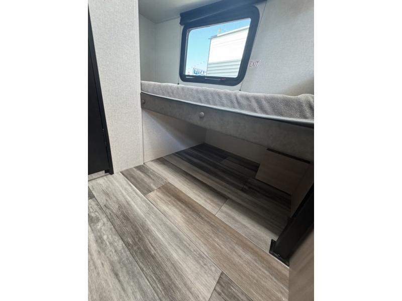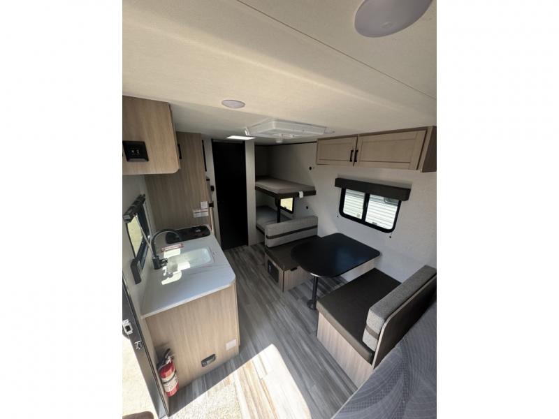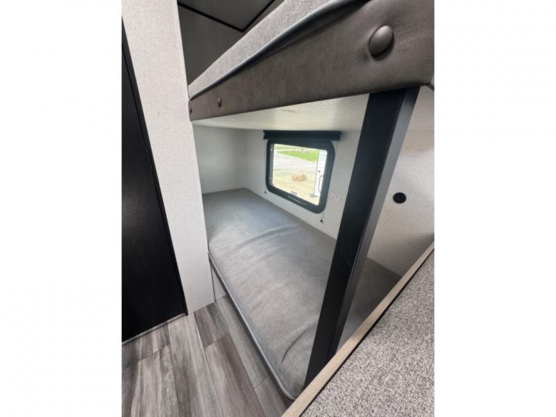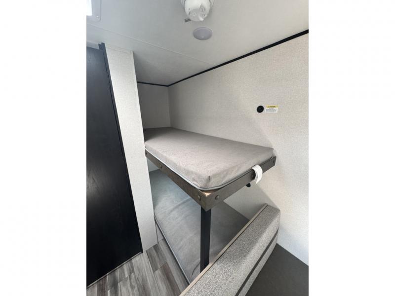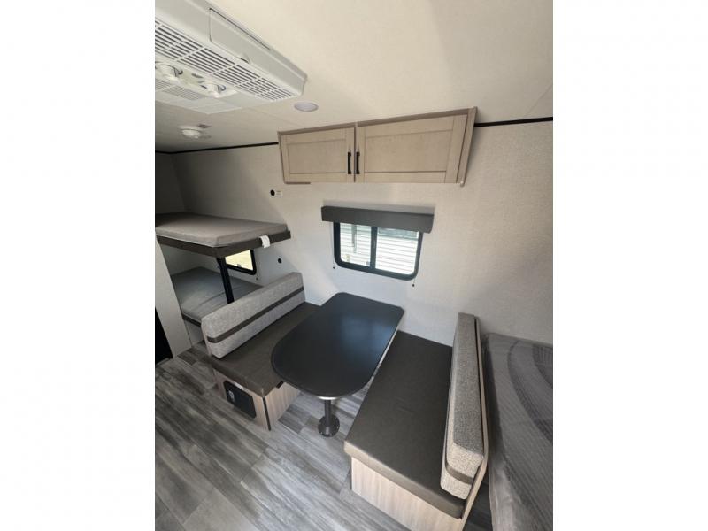 This easy to tow travel trailer features compact sleeping spaces thanks to the bunk beds in the rear corner, and the private bath is right next to the bunks for easy nighttime use! You'll have the front queen bed to yourselves, while another guest or two little ones convert the booth dinette to sleeping space. A two-burner cooktop and microwave oven will let you make meals each day, and there is a 12V refrigerator to keep your cold items fresh. Outside, you'll enjoy the 10' power awning for added shade, and there is exterior storage to keep fishing poles, hiking gear and more!