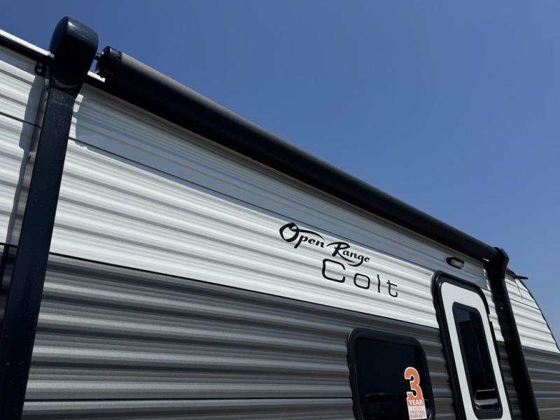 With any Colt travel trailer by Open Range RV, you can be sure you're getting a budget-friendly unit designed to fit your lifestyle! Each one is built to last with a PVC roofing membrane and built-in A-frame, plus there are nitrogen-filled radial tires and self-adjusting electric brakes for easy towing. You will appreciate the utilities that include 30-amp service, an A/C unit, and an on-demand tankless water heater. A few interior comforts include vinyl flooring throughout, solid hardwood cabinet doors, and residential grade kitchen countertops to make your space feel more like home. There are additional features available, depending on the edition you choose, along with available options to further customize your Colt travel trailer!