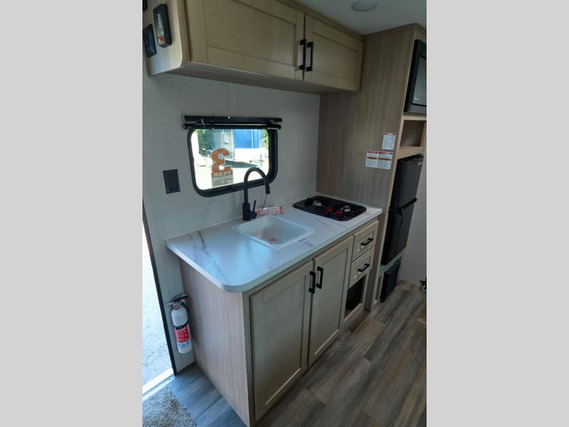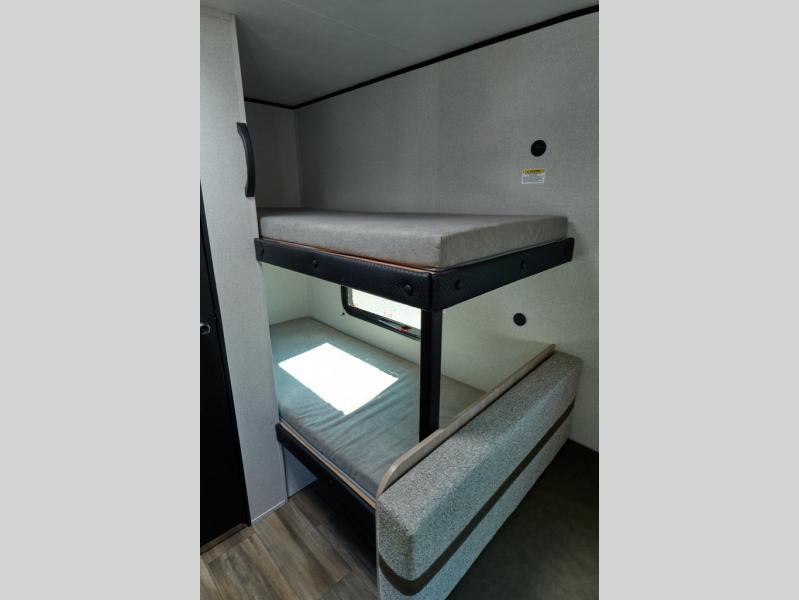 This easy to tow travel trailer features compact sleeping spaces thanks to the bunk beds in the rear corner, and the private bath is right next to the bunks for easy nighttime use! You'll have the front queen bed to yourselves, while another guest or two little ones convert the booth dinette to sleeping space. A two-burner cooktop and microwave oven will let you make meals each day, and there is a 12V refrigerator to keep your cold items fresh. Outside, you'll enjoy the 10' power awning for added shade, and there is exterior storage to keep fishing poles, hiking gear and more!