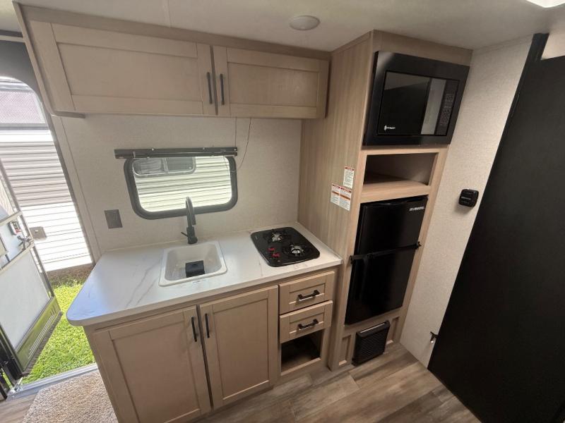 This easy to tow travel trailer features compact sleeping spaces thanks to the bunk beds in the rear corner, and the private bath is right next to the bunks for easy nighttime use! You'll have the front queen bed to yourselves, while another guest or two little ones convert the booth dinette to sleeping space. A two-burner cooktop and microwave oven will let you make meals each day, and there is a 12V refrigerator to keep your cold items fresh. Outside, you'll enjoy the 10' power awning for added shade, and there is exterior storage to keep fishing poles, hiking gear and more!