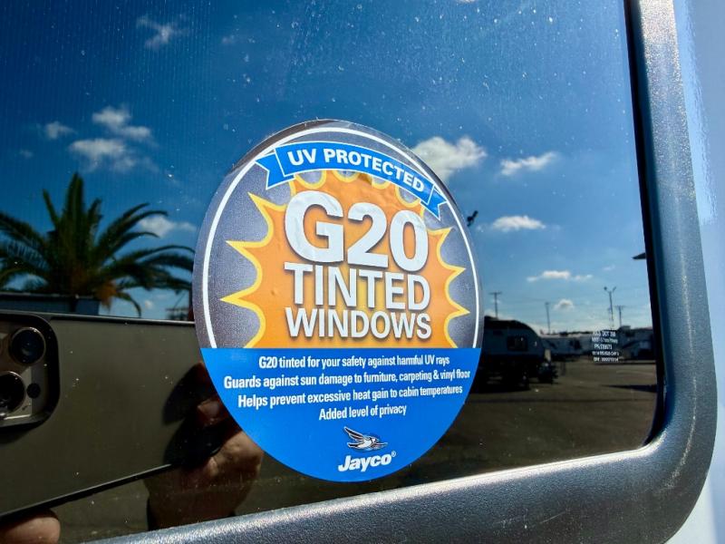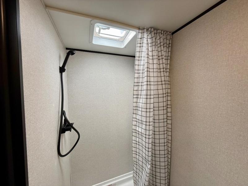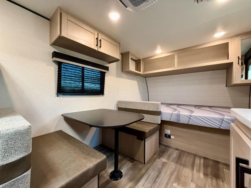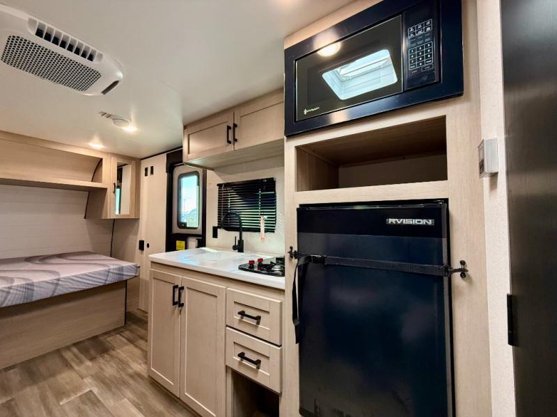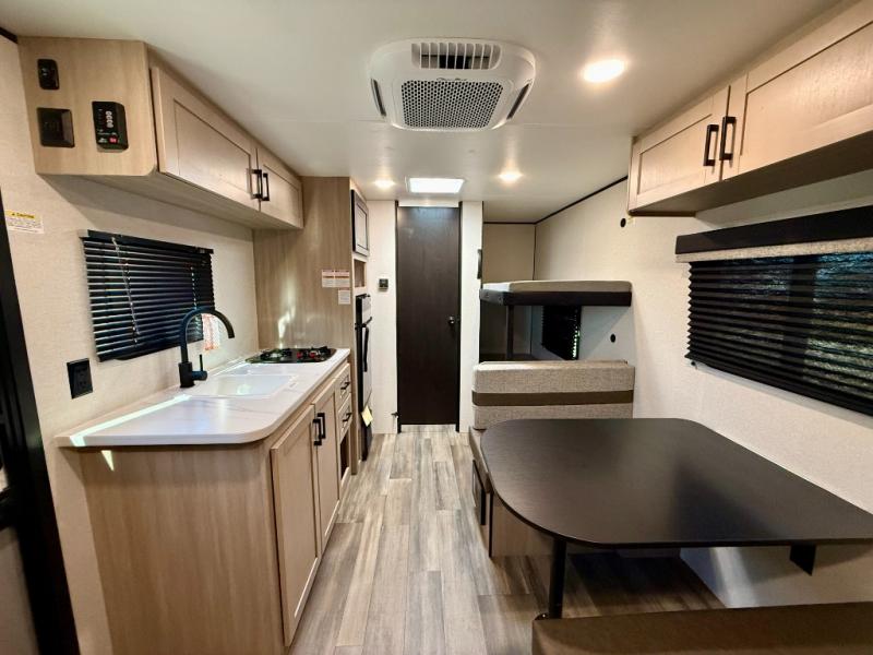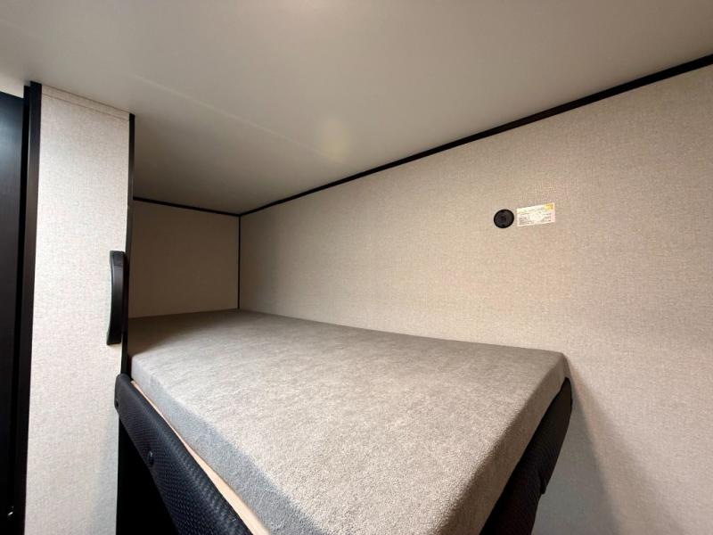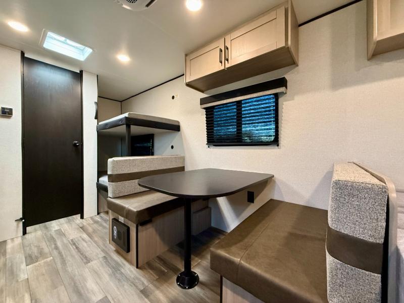 This easy to tow travel trailer features compact sleeping spaces thanks to the bunk beds in the rear corner, and the private bath is right next to the bunks for easy nighttime use! You'll have the front queen bed to yourselves, while another guest or two little ones convert the booth dinette to sleeping space. A two-burner cooktop and microwave oven will let you make meals each day, and there is a 12V refrigerator to keep your cold items fresh. Outside, you'll enjoy the 10' power awning for added shade, and there is exterior storage to keep fishing poles, hiking gear and more!