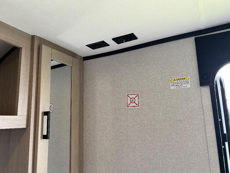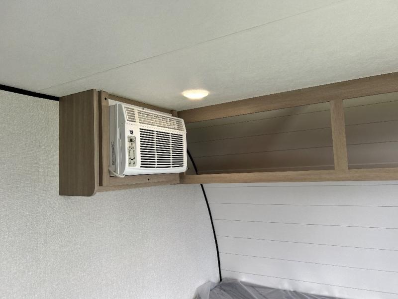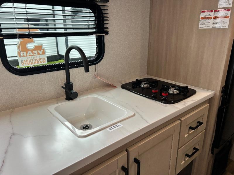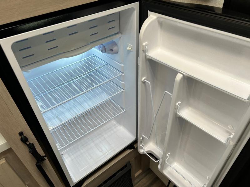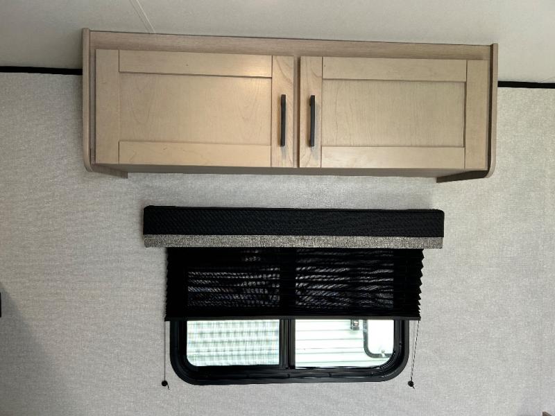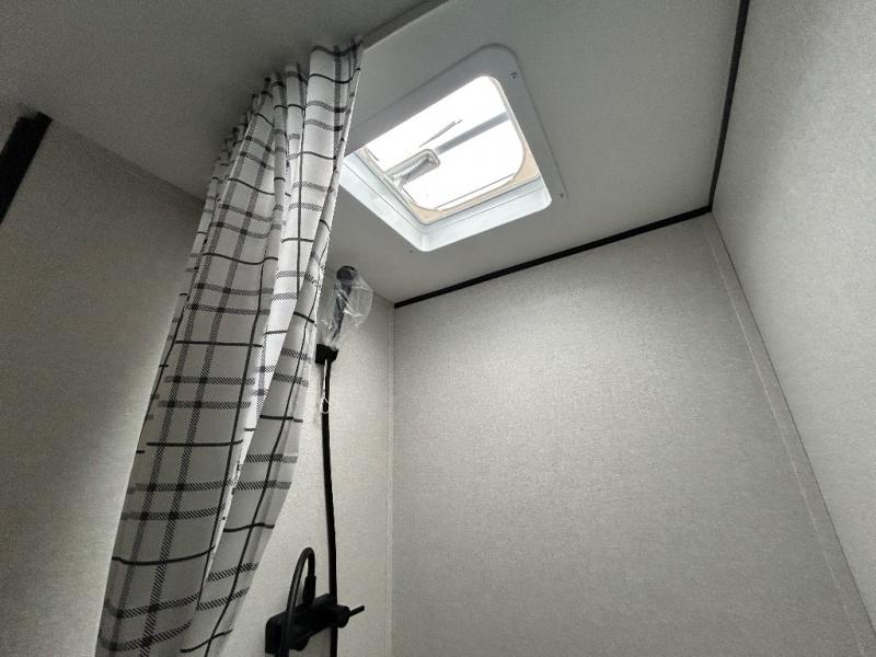 This easy to tow travel trailer features compact sleeping spaces thanks to the bunk beds in the rear corner, and the private bath is right next to the bunks for easy nighttime use! You'll have the front queen bed to yourselves, while another guest or two little ones convert the booth dinette to sleeping space. A two-burner cooktop and microwave oven will let you make meals each day, and there is a 12V refrigerator to keep your cold items fresh. Outside, you'll enjoy the 10' power awning for added shade, and there is exterior storage to keep fishing poles, hiking gear and more!