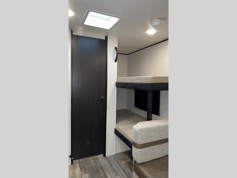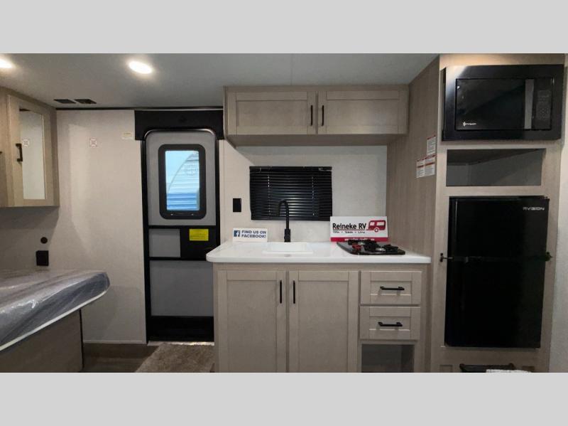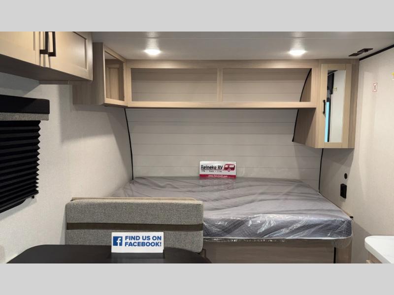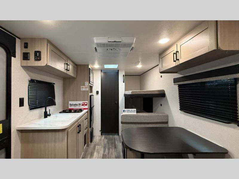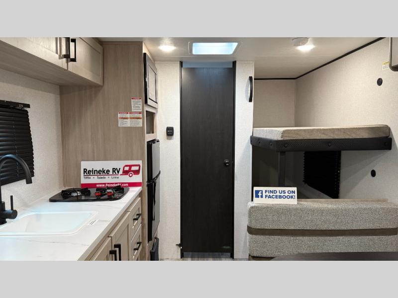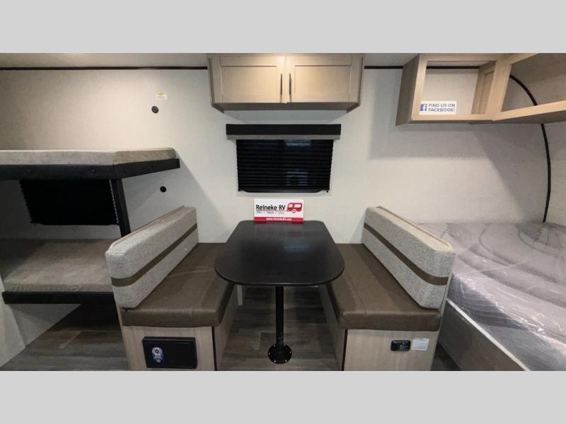 This easy to tow travel trailer features compact sleeping spaces thanks to the bunk beds in the rear corner, and the private bath is right next to the bunks for easy nighttime use! You'll have the front queen bed to yourselves, while another guest or two little ones convert the booth dinette to sleeping space. A two-burner cooktop and microwave oven will let you make meals each day, and there is a 12V refrigerator to keep your cold items fresh. Outside, you'll enjoy the 10' power awning for added shade, and there is exterior storage to keep fishing poles, hiking gear and more!