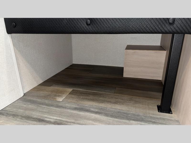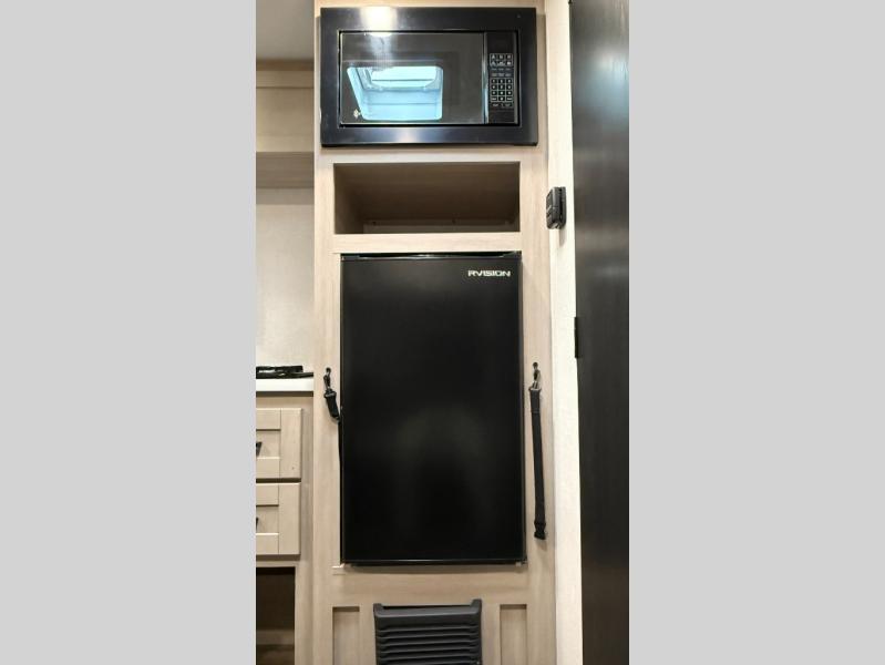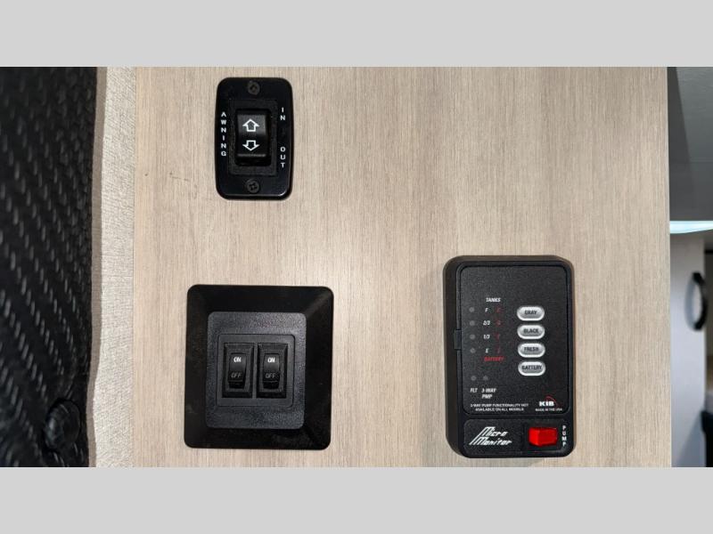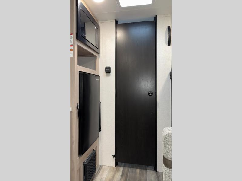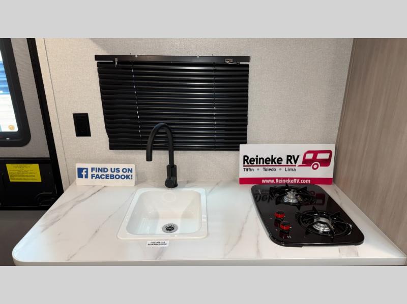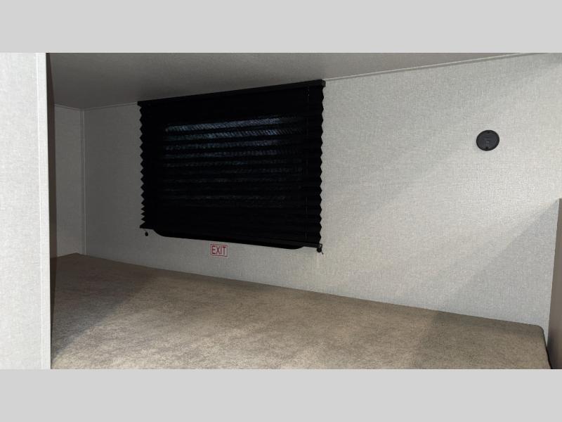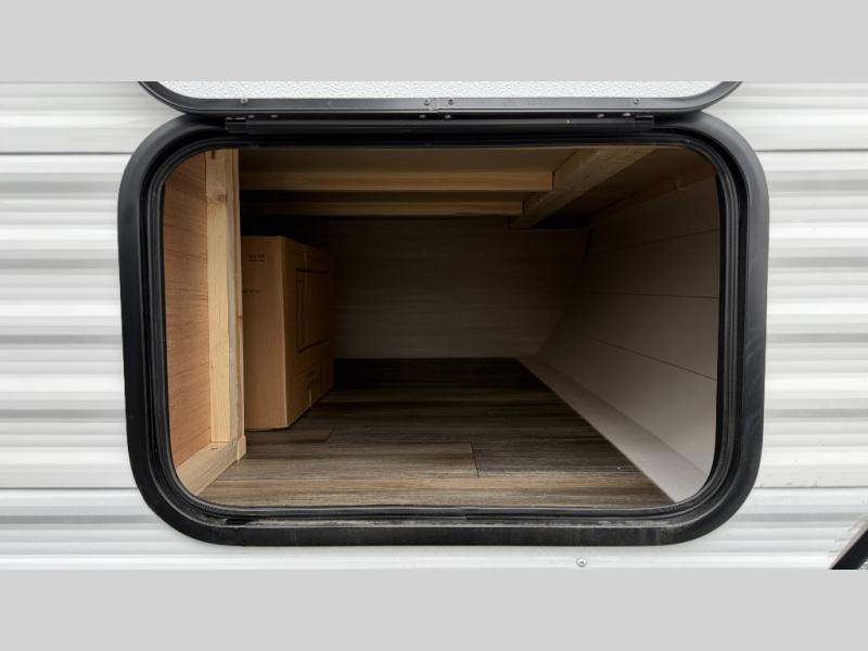 This easy to tow travel trailer features compact sleeping spaces thanks to the bunk beds in the rear corner, and the private bath is right next to the bunks for easy nighttime use! You'll have the front queen bed to yourselves, while another guest or two little ones convert the booth dinette to sleeping space. A two-burner cooktop and microwave oven will let you make meals each day, and there is a 12V refrigerator to keep your cold items fresh. Outside, you'll enjoy the 10' power awning for added shade, and there is exterior storage to keep fishing poles, hiking gear and more!