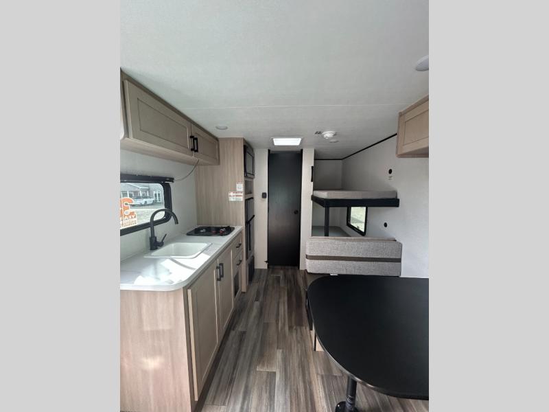 This easy to tow travel trailer features compact sleeping spaces thanks to the bunk beds in the rear corner, and the private bath is right next to the bunks for easy nighttime use! You'll have the front queen bed to yourselves, while another guest or two little ones convert the booth dinette to sleeping space. A two-burner cooktop and microwave oven will let you make meals each day, and there is a 12V refrigerator to keep your cold items fresh. Outside, you'll enjoy the 10' power awning for added shade, and there is exterior storage to keep fishing poles, hiking gear and more!