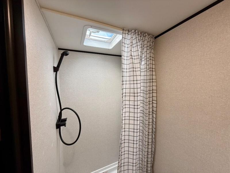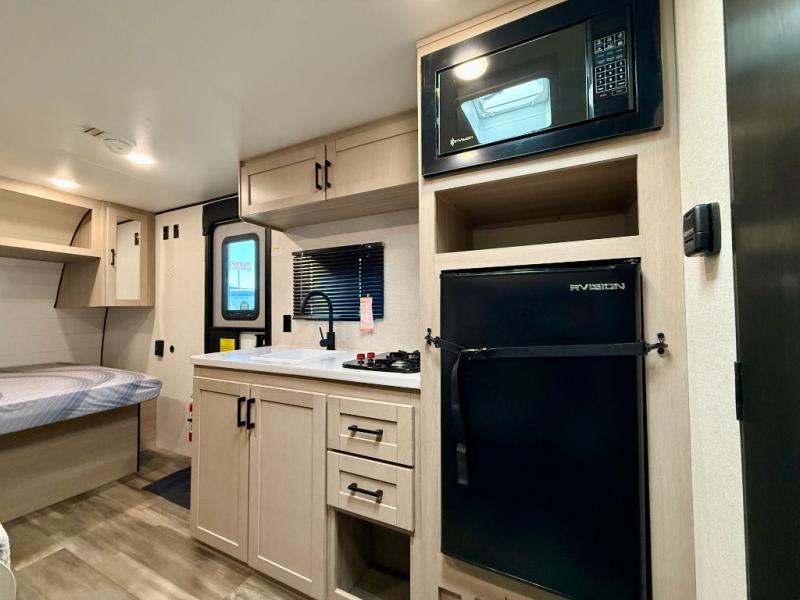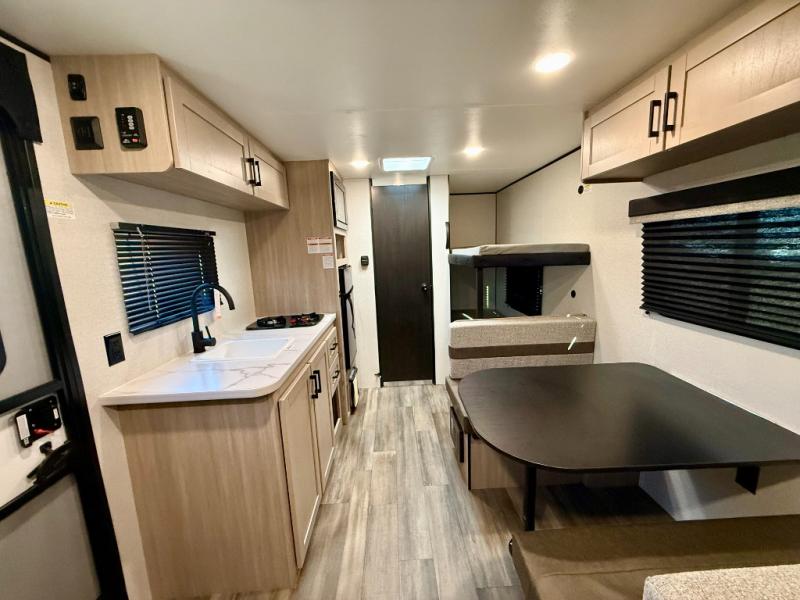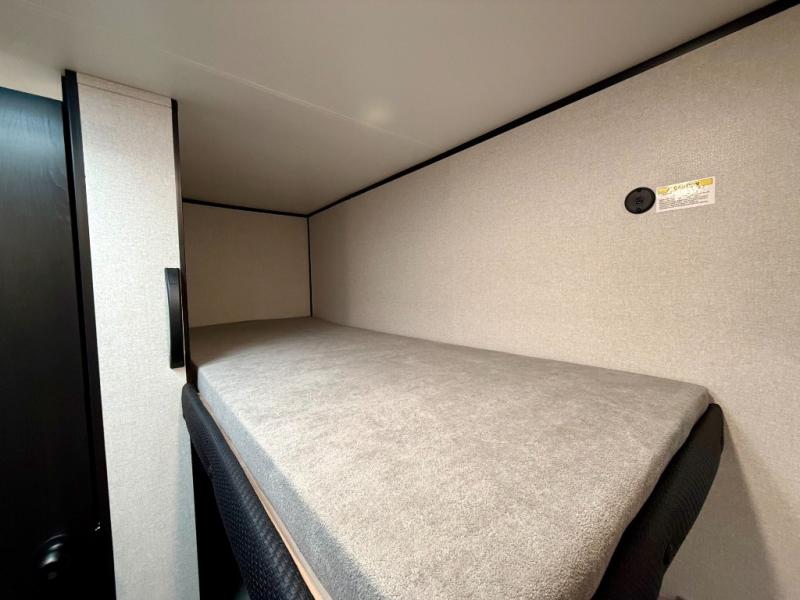 This easy to tow travel trailer features compact sleeping spaces thanks to the bunk beds in the rear corner, and the private bath is right next to the bunks for easy nighttime use! You'll have the front queen bed to yourselves, while another guest or two little ones convert the booth dinette to sleeping space. A two-burner cooktop and microwave oven will let you make meals each day, and there is a 12V refrigerator to keep your cold items fresh. Outside, you'll enjoy the 10' power awning for added shade, and there is exterior storage to keep fishing poles, hiking gear and more!