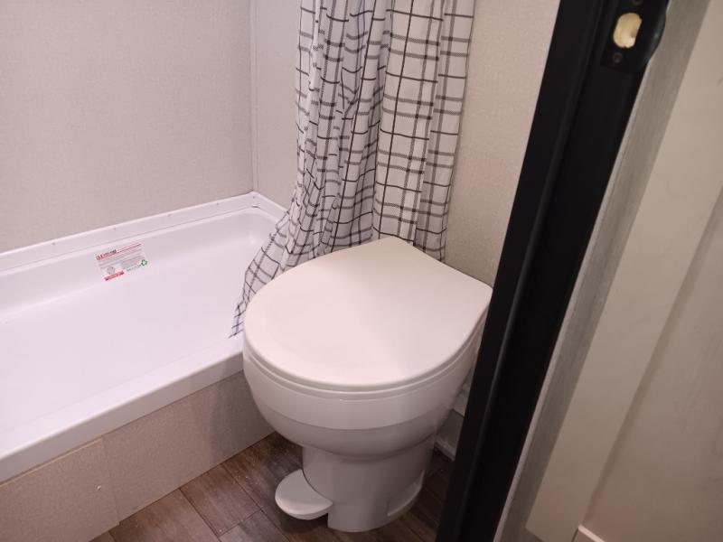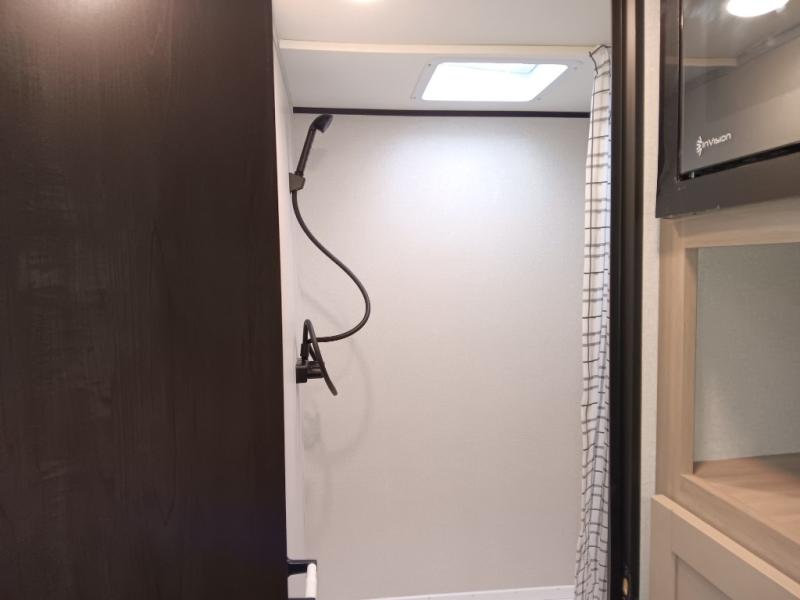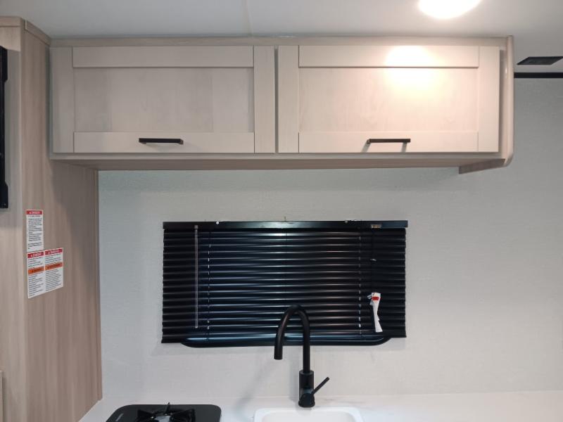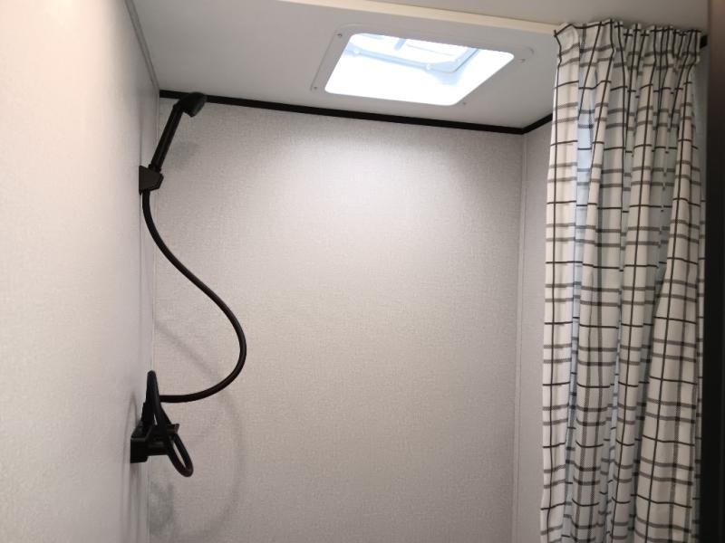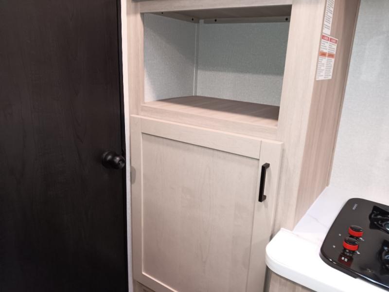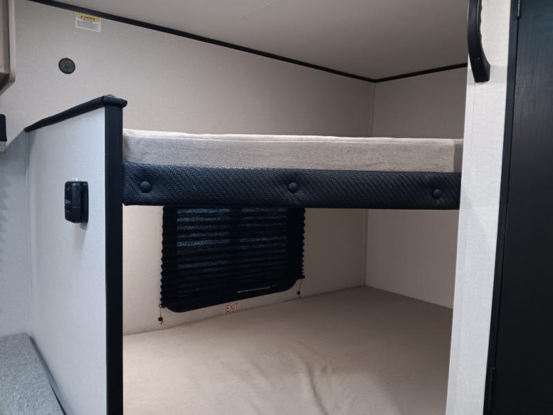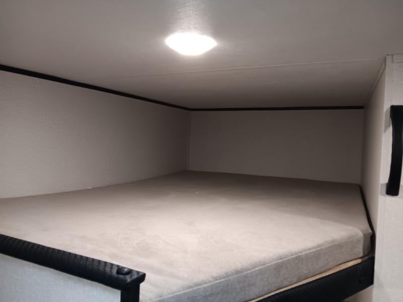 This easy to tow travel trailer features compact sleeping spaces thanks to the double-size bunk beds in the rear corner, and the private bath is right next to the bunks for easy nighttime use! You'll have the front queen bed to yourselves, along with a wardrobe, nightstand, and overhead shelf for your things. A two-burner cooktop and microwave oven will let you make meals each day, and there is a 12V refrigerator to keep your cold items fresh. Outside, you'll enjoy the 10' power awning for added shade, and there are two exterior storage compartments to keep fishing poles, hiking gear and more!