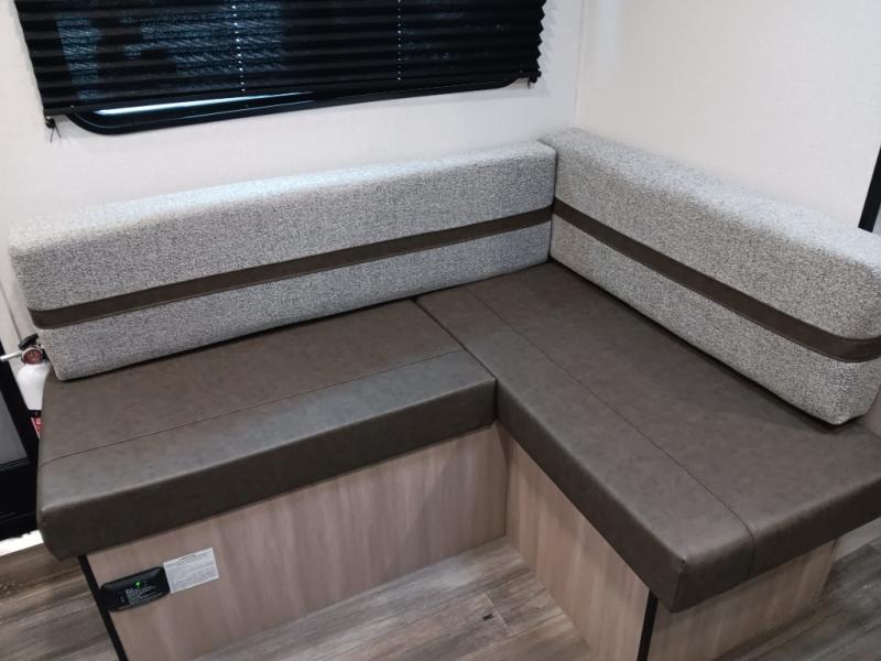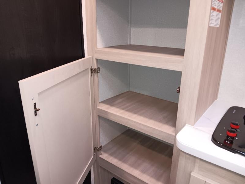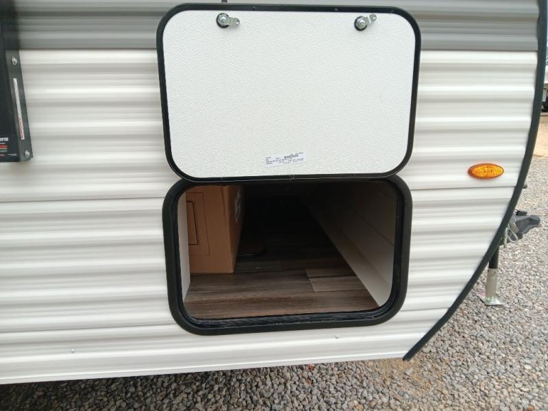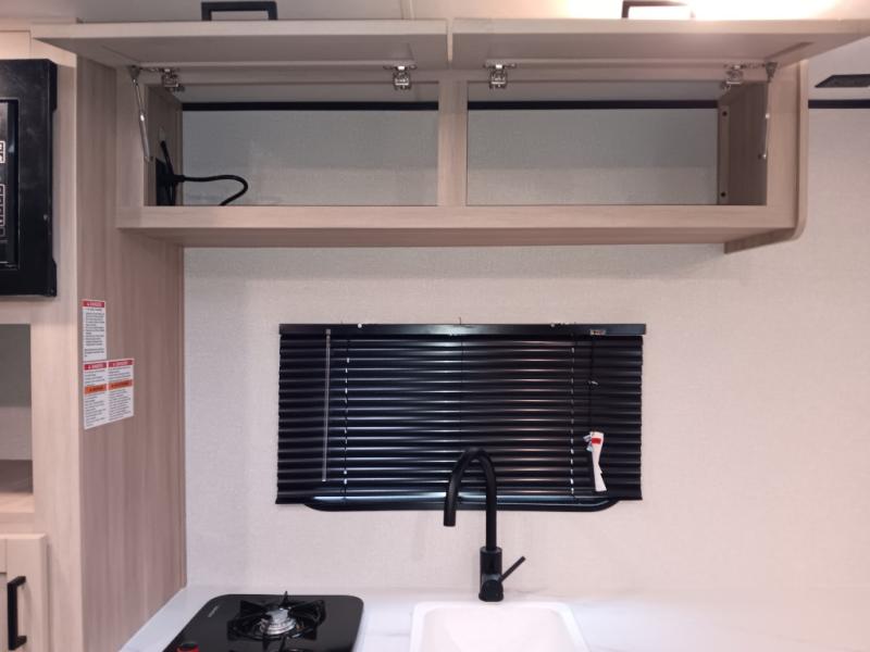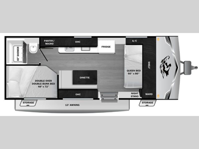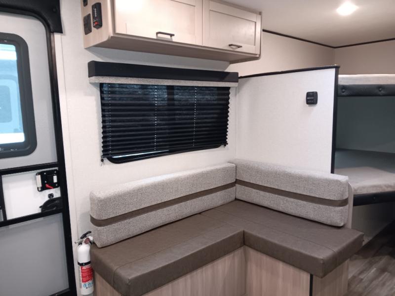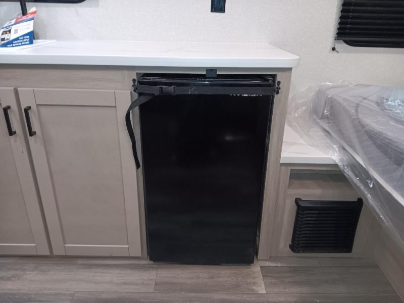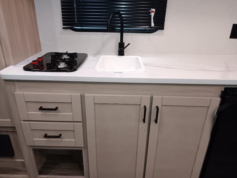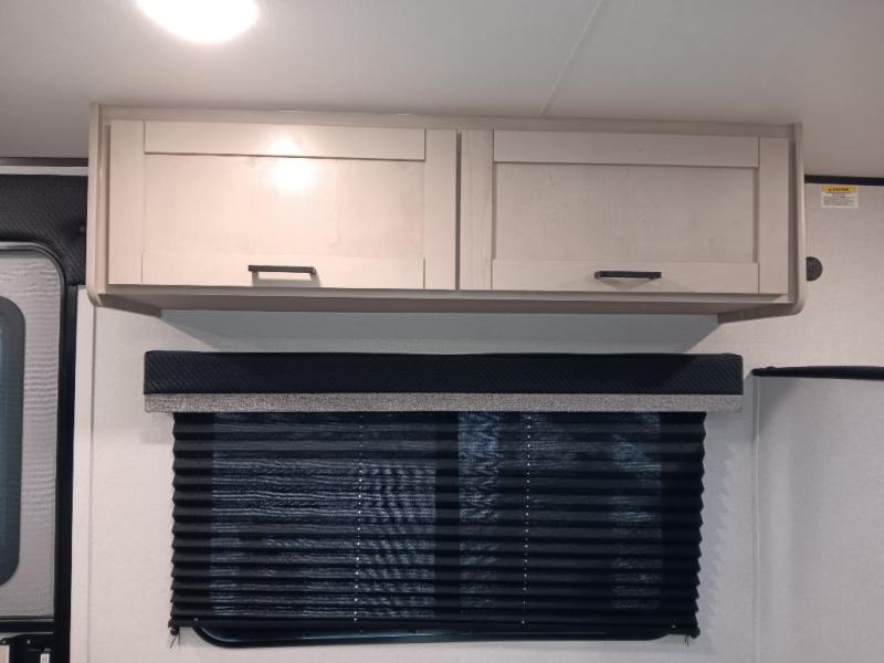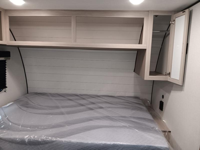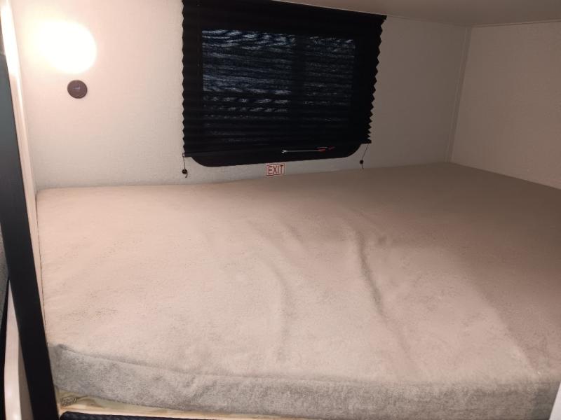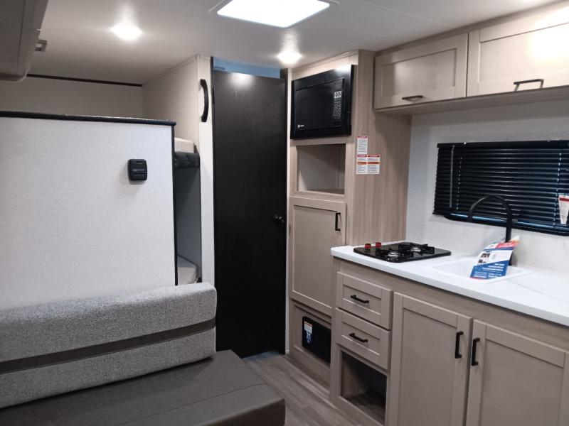 This easy to tow travel trailer features compact sleeping spaces thanks to the double-size bunk beds in the rear corner, and the private bath is right next to the bunks for easy nighttime use! You'll have the front queen bed to yourselves, along with a wardrobe, nightstand, and overhead shelf for your things. A two-burner cooktop and microwave oven will let you make meals each day, and there is a 12V refrigerator to keep your cold items fresh. Outside, you'll enjoy the 10' power awning for added shade, and there are two exterior storage compartments to keep fishing poles, hiking gear and more!