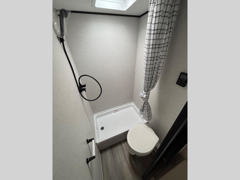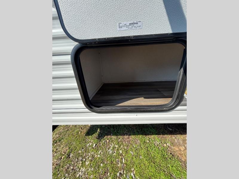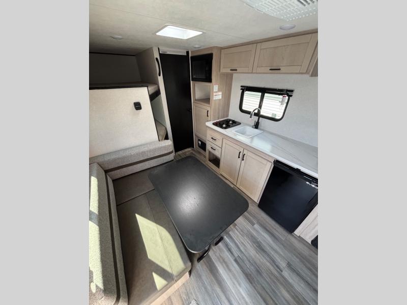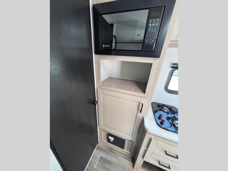 This easy to tow travel trailer features compact sleeping spaces thanks to the double-size bunk beds in the rear corner, and the private bath is right next to the bunks for easy nighttime use! You'll have the front queen bed to yourselves, along with a wardrobe, nightstand, and overhead shelf for your things. A two-burner cooktop and microwave oven will let you make meals each day, and there is a 12V refrigerator to keep your cold items fresh. Outside, you'll enjoy the 10' power awning for added shade, and there are two exterior storage compartments to keep fishing poles, hiking gear and more!