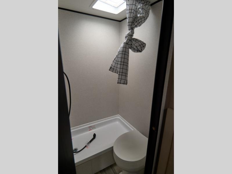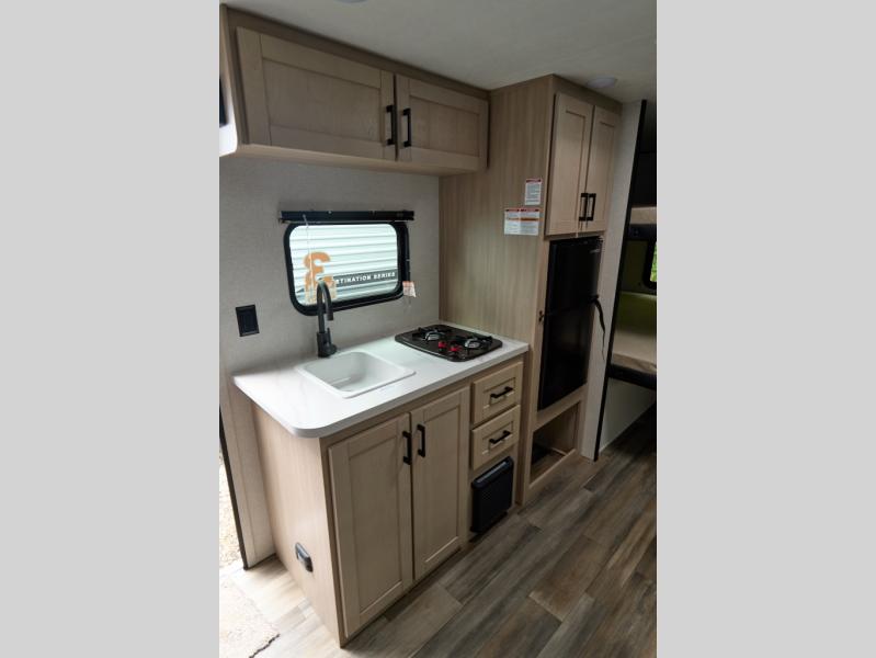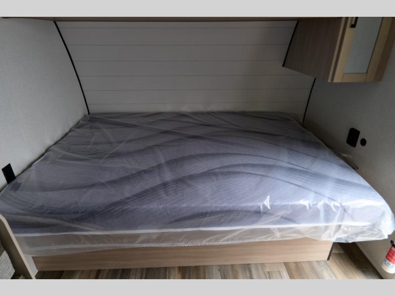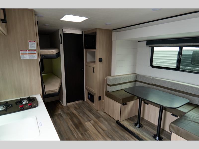 This easy to tow travel trailer features compact sleeping spaces thanks to the double-size bunk beds in the rear corner, and the private bath is right next to the bunks for easy nighttime use! You'll have the front queen bed to yourselves, along with a wardrobe, nightstand, and overhead shelf for your things. And any other guests can convert the U-shaped dinette to sleeping space, allowing you to sleep eight total in this unit! A two-burner cooktop and microwave oven will let you make meals each day, and there is a 12V refrigerator to keep your cold items fresh. Outside, you'll enjoy the 10' power awning for added shade, and there are two exterior storage compartments to keep fishing poles, hiking gear and more!