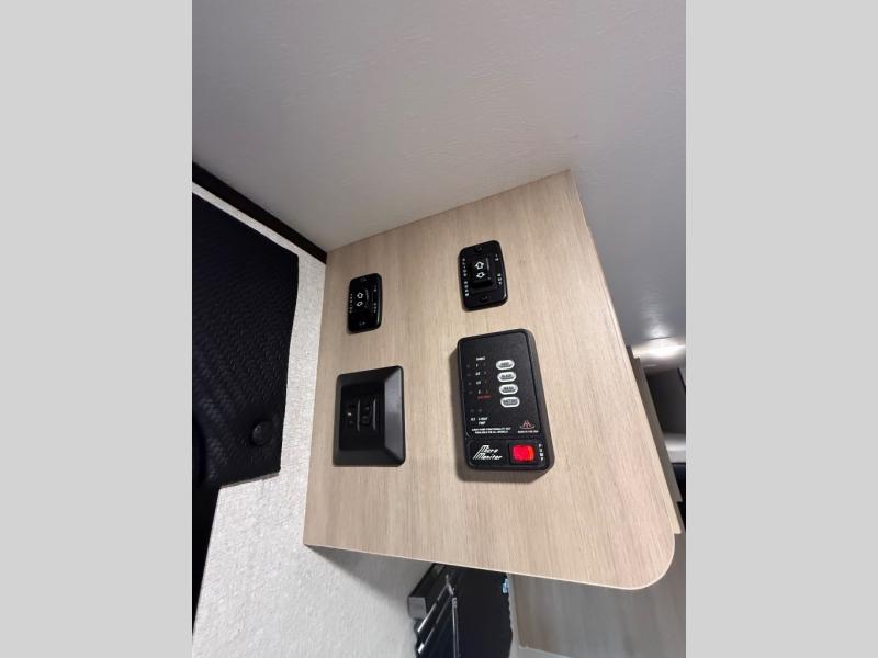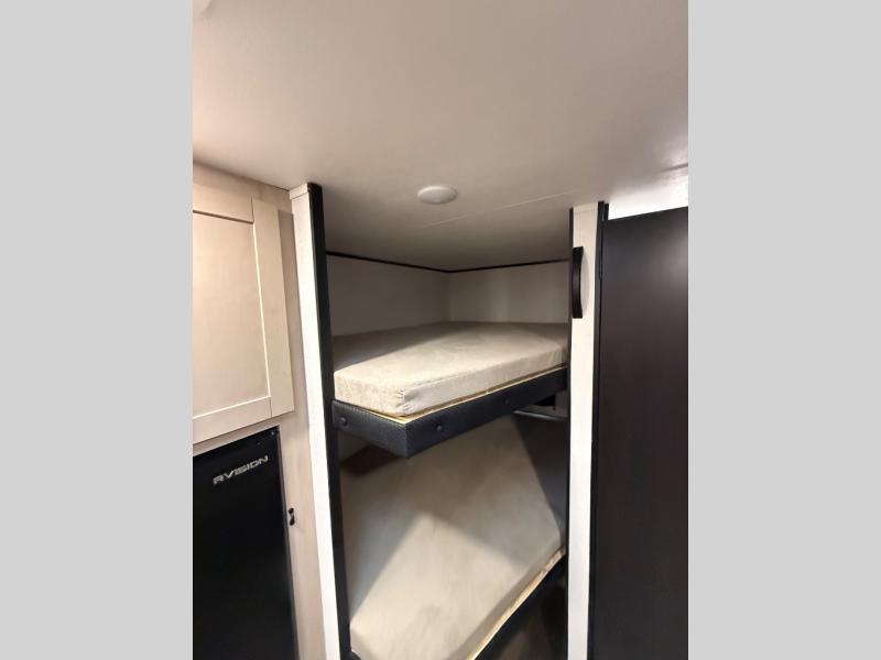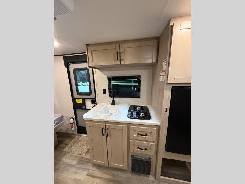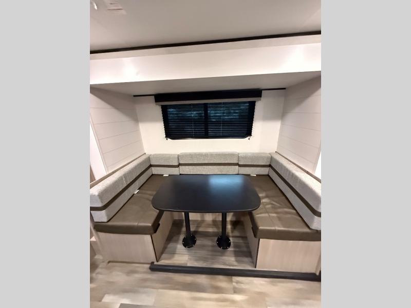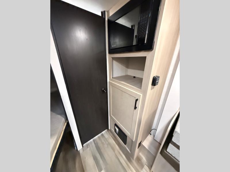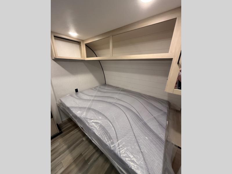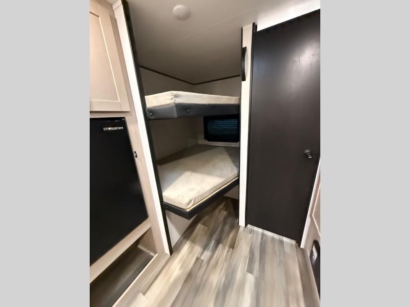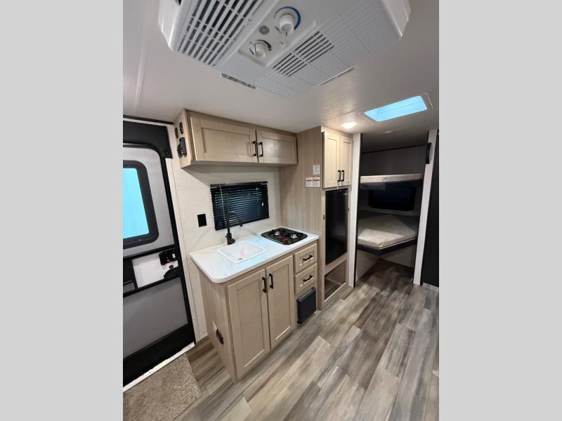 This easy to tow travel trailer features compact sleeping spaces thanks to the double-size bunk beds in the rear corner, and the private bath is right next to the bunks for easy nighttime use! You'll have the front queen bed to yourselves, along with a wardrobe, nightstand, and overhead shelf for your things. And any other guests can convert the U-shaped dinette to sleeping space, allowing you to sleep eight total in this unit! A two-burner cooktop and microwave oven will let you make meals each day, and there is a 12V refrigerator to keep your cold items fresh. Outside, you'll enjoy the 10' power awning for added shade, and there are two exterior storage compartments to keep fishing poles, hiking gear and more!