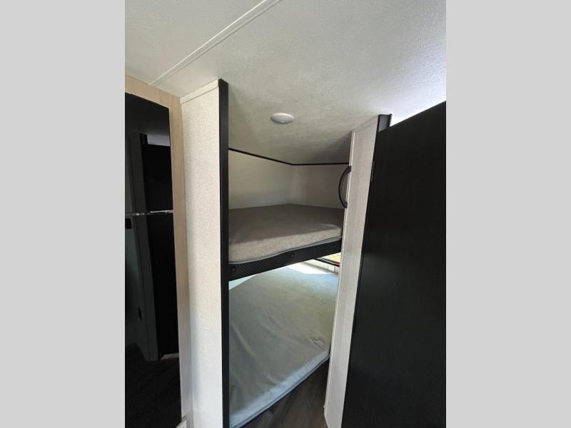 This travel trailer features compact sleeping spaces thanks to the double-size bunk beds in the rear corner, and the private full bath is right next to the bunks for easy nighttime use! You'll have the front Murphy bed all to yourselves, and in the morning, you can fold it away to sit on the jack-knife sofa. A cooktop and microwave oven will let you make meals each day, and there is a 12V refrigerator to keep your cold items fresh. Outside, you'll enjoy the 13' power awning for added shade, and there are two exterior storage compartments to keep fishing poles, hiking gear and more!
