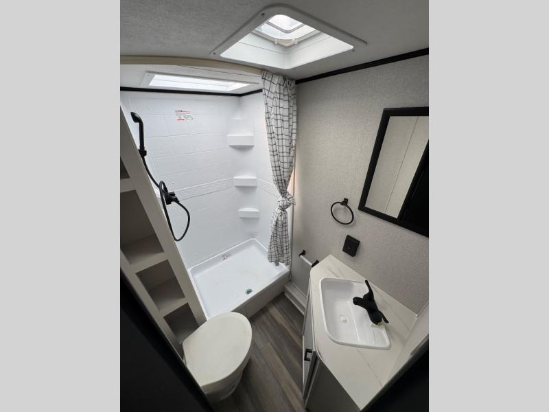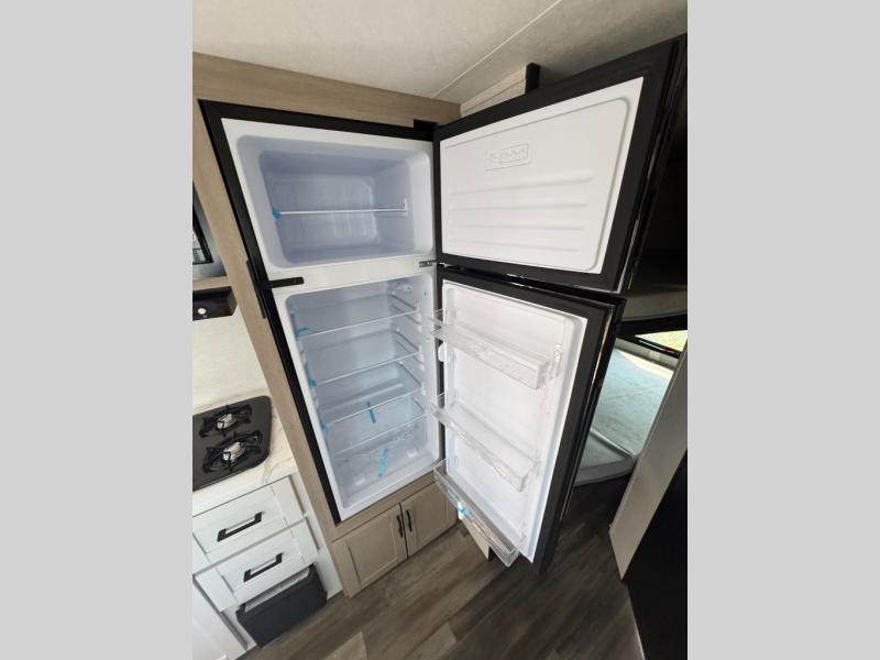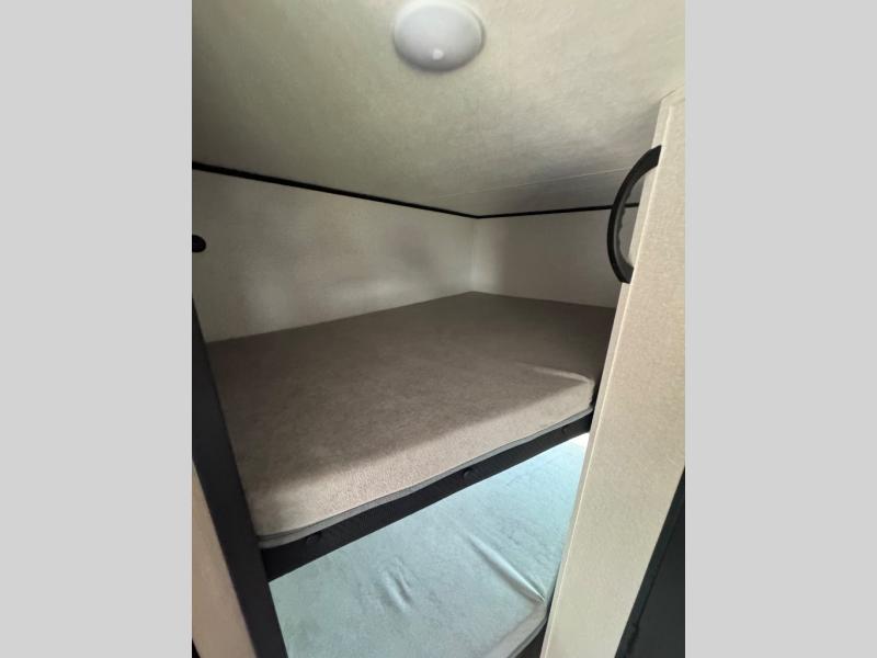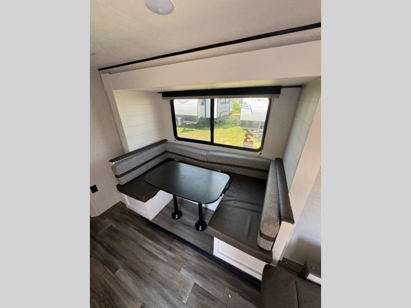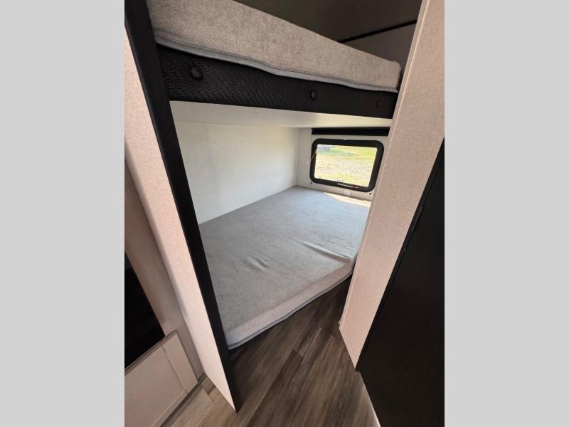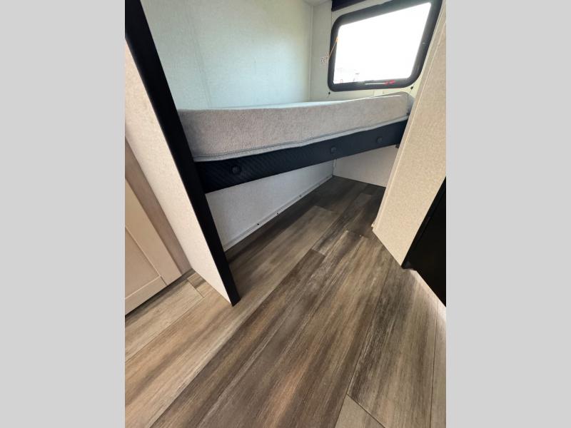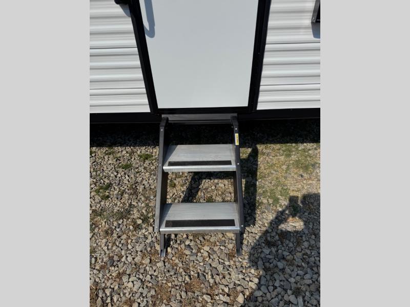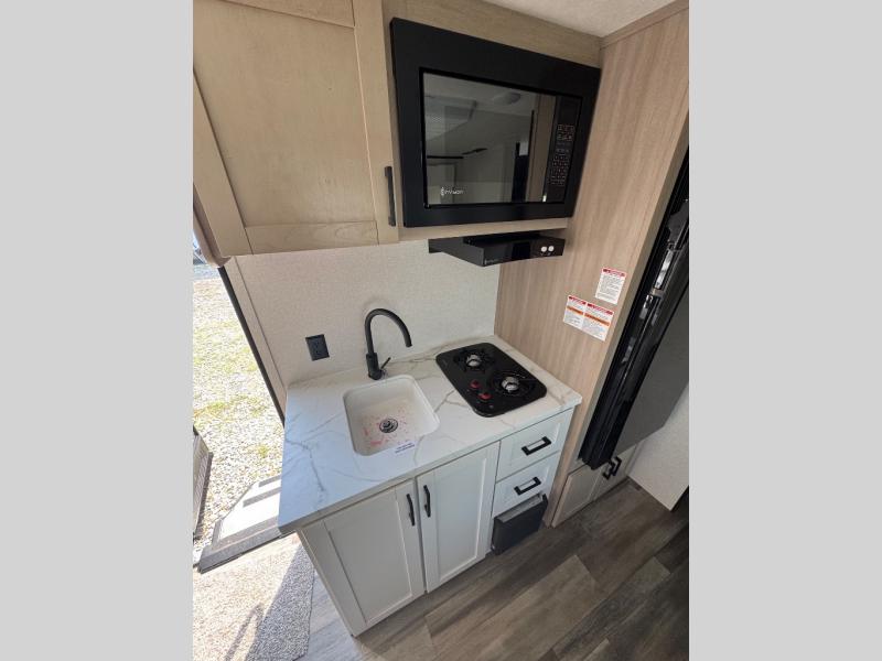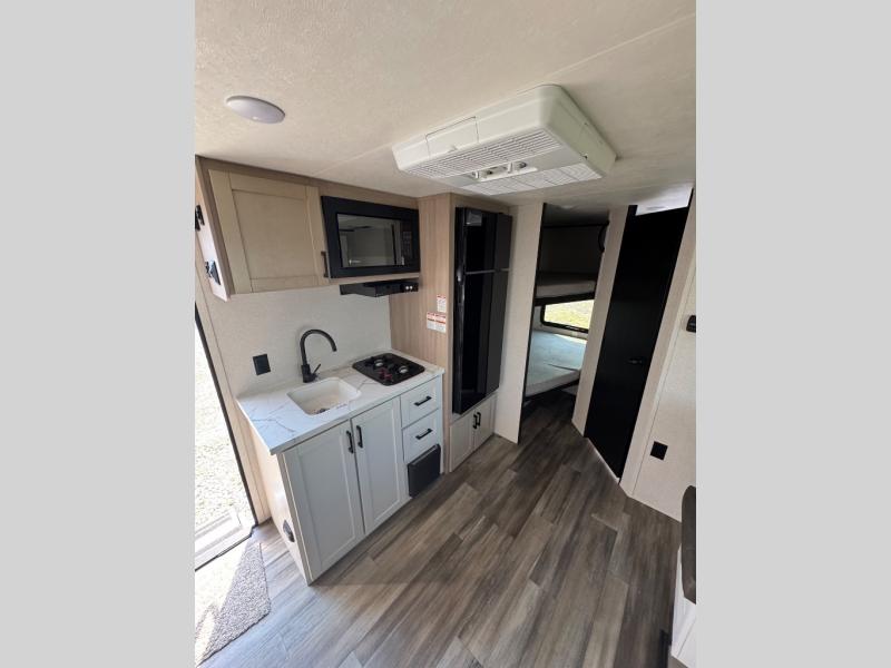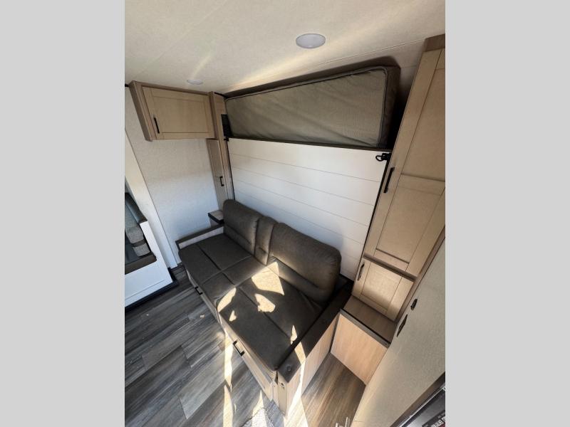 This travel trailer features compact sleeping spaces thanks to the double-size bunk beds in the rear corner, and the private full bath is right next to the bunks for easy nighttime use! You'll have the front Murphy bed all to yourselves, and in the morning, you can fold it away to sit on the jack-knife sofa. A cooktop and microwave oven will let you make meals each day, and there is a 12V refrigerator to keep your cold items fresh. Outside, you'll enjoy the 13' power awning for added shade, and there are two exterior storage compartments to keep fishing poles, hiking gear and more!