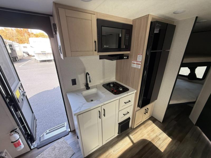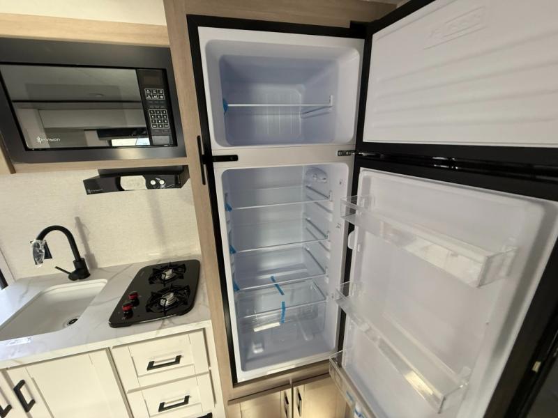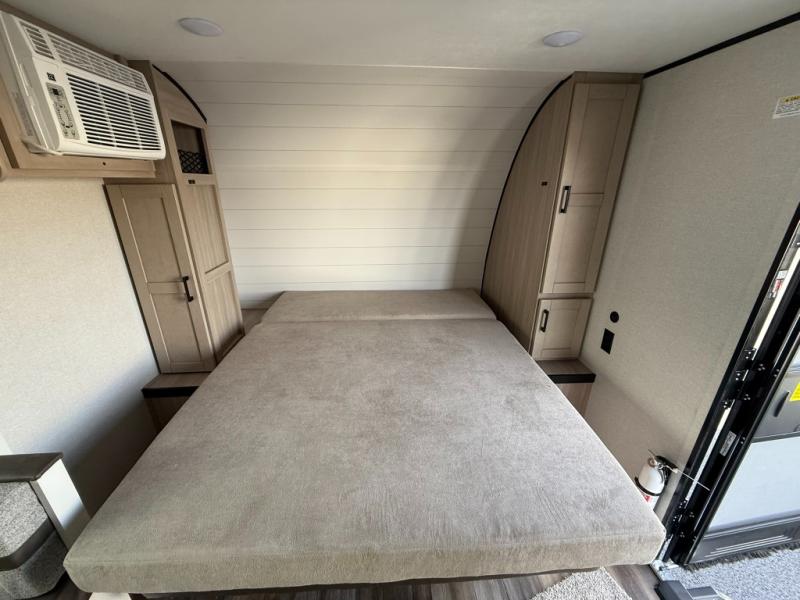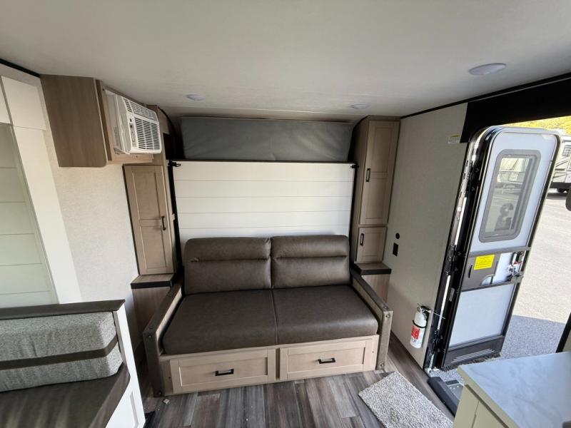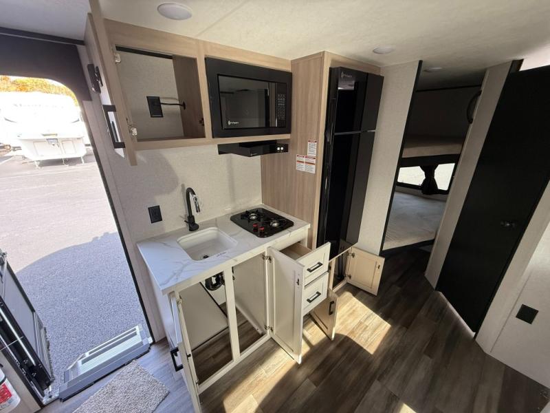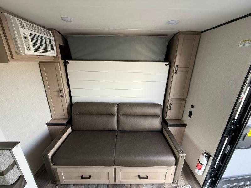 This travel trailer features compact sleeping spaces thanks to the double-size bunk beds in the rear corner, and the private full bath is right next to the bunks for easy nighttime use! You'll have the front Murphy bed all to yourselves, and in the morning, you can fold it away to sit on the jack-knife sofa. A cooktop and microwave oven will let you make meals each day, and there is a 12V refrigerator to keep your cold items fresh. Outside, you'll enjoy the 13' power awning for added shade, and there are two exterior storage compartments to keep fishing poles, hiking gear and more!