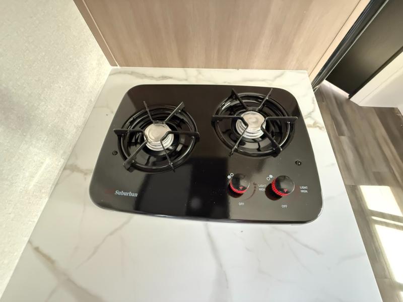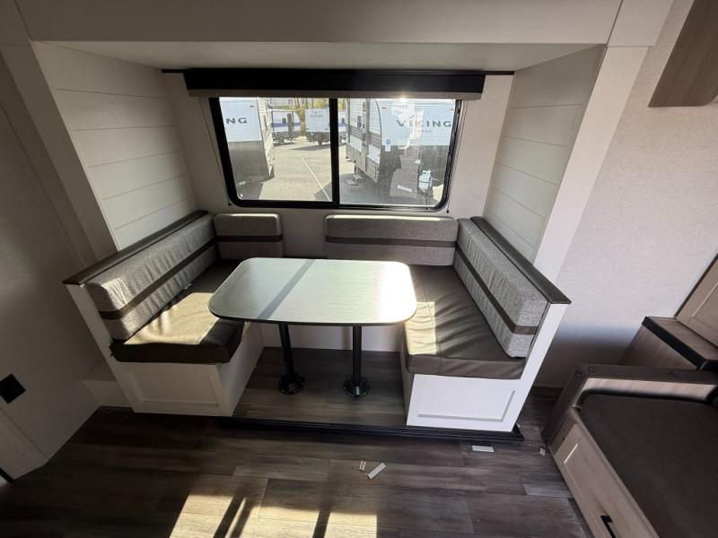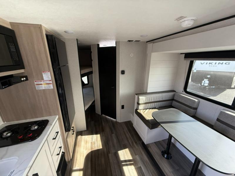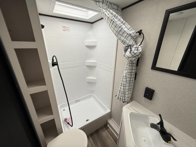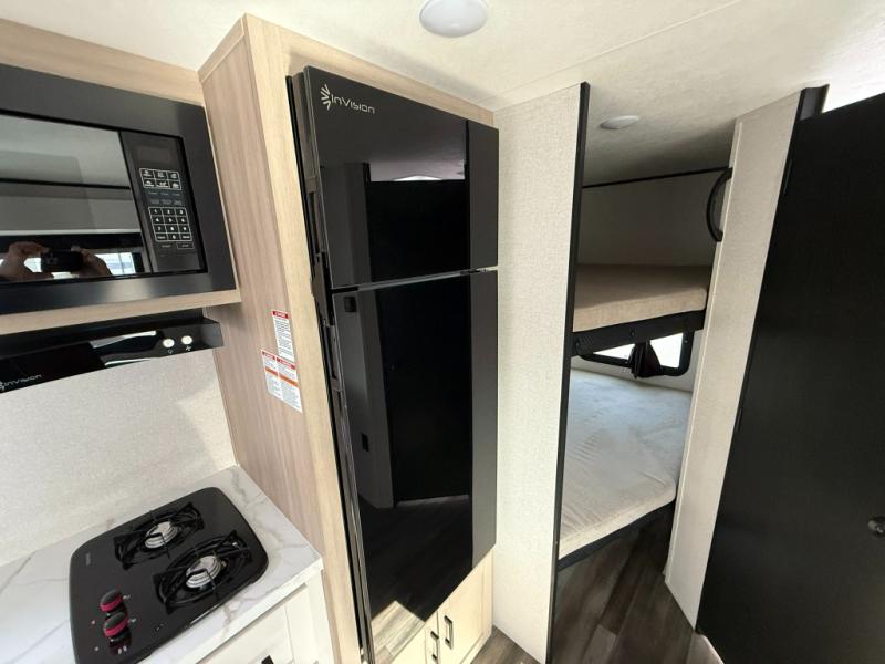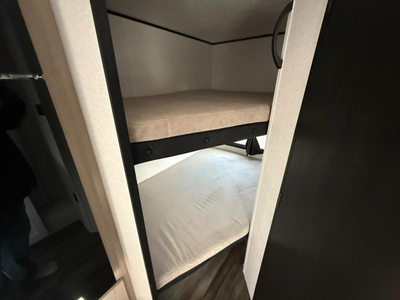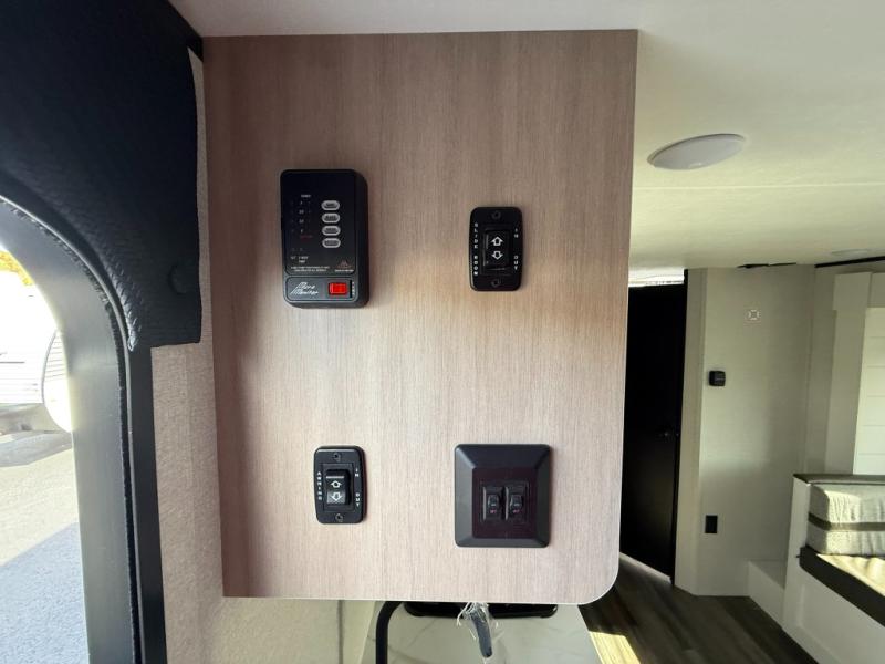 This travel trailer features compact sleeping spaces thanks to the double-size bunk beds in the rear corner, and the private full bath is right next to the bunks for easy nighttime use! You'll have the front Murphy bed all to yourselves, and in the morning, you can fold it away to sit on the jack-knife sofa. A cooktop and microwave oven will let you make meals each day, and there is a 12V refrigerator to keep your cold items fresh. Outside, you'll enjoy the 13' power awning for added shade, and there are two exterior storage compartments to keep fishing poles, hiking gear and more!