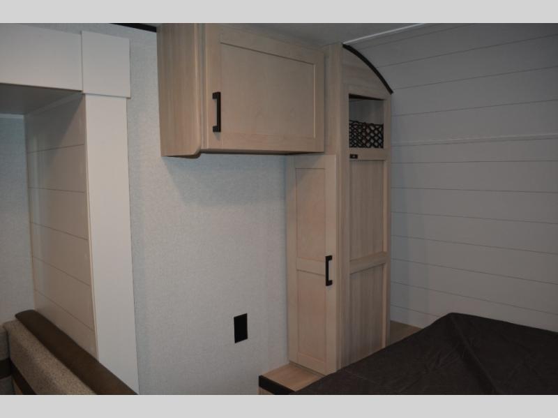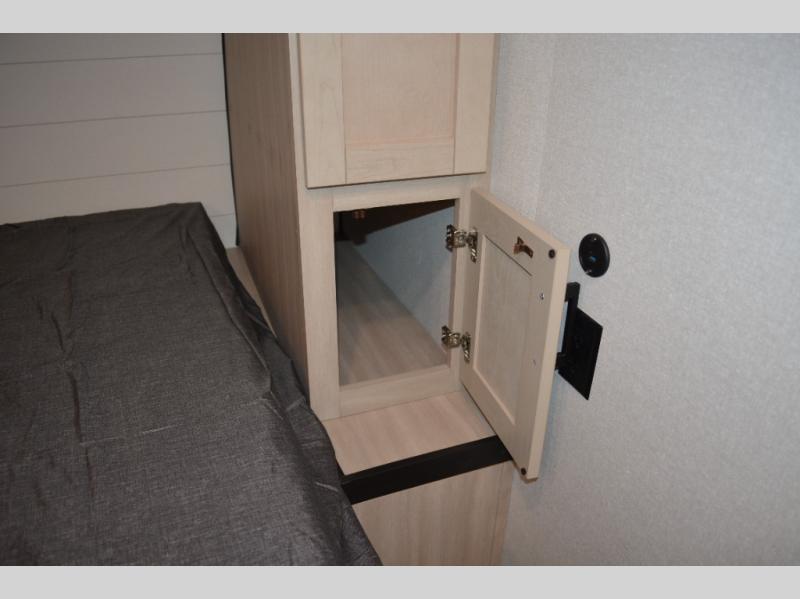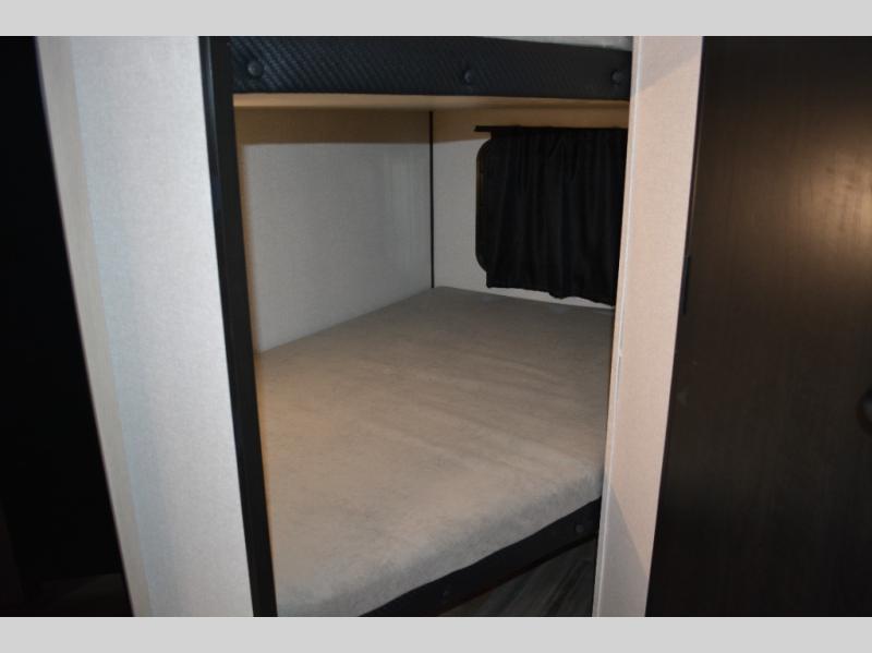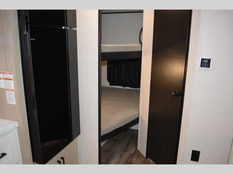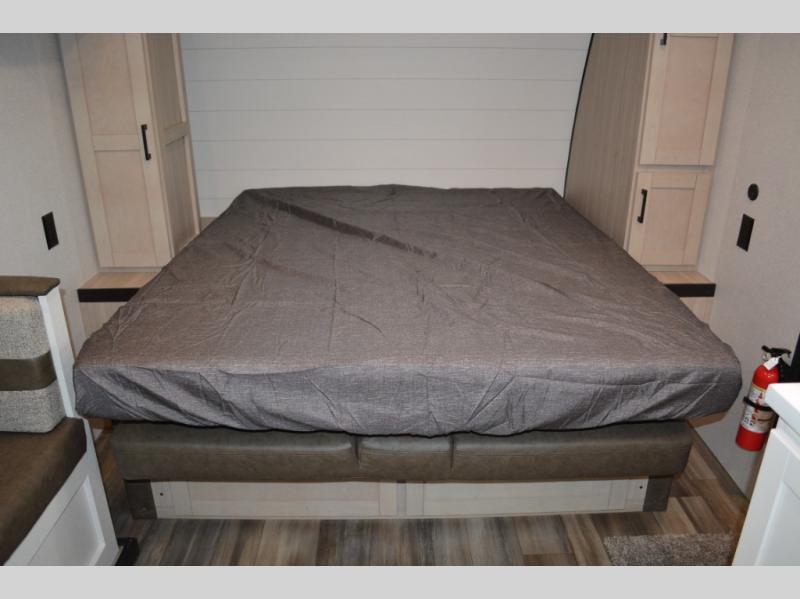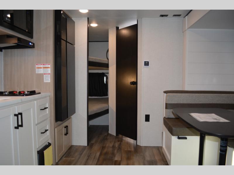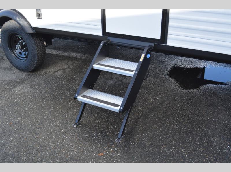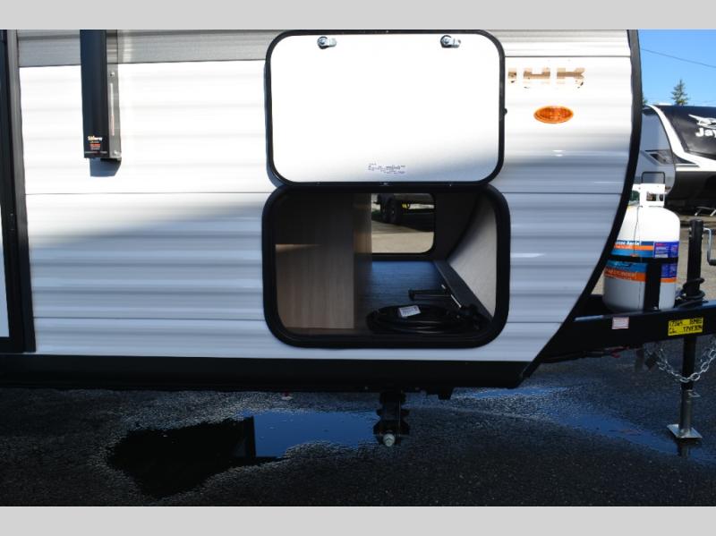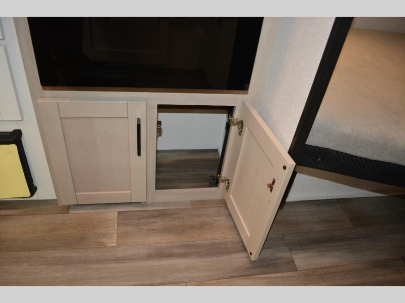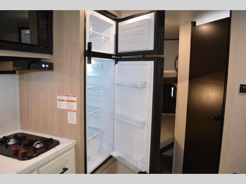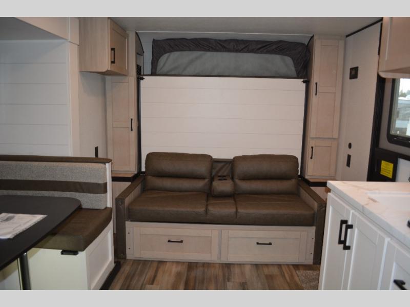 This travel trailer features compact sleeping spaces thanks to the double-size bunk beds in the rear corner, and the private full bath is right next to the bunks for easy nighttime use! You'll have the front Murphy bed all to yourselves, and in the morning, you can fold it away to sit on the jack-knife sofa. A cooktop and microwave oven will let you make meals each day, and there is a 12V refrigerator to keep your cold items fresh. Outside, you'll enjoy the 13' power awning for added shade, and there are two exterior storage compartments to keep fishing poles, hiking gear and more!