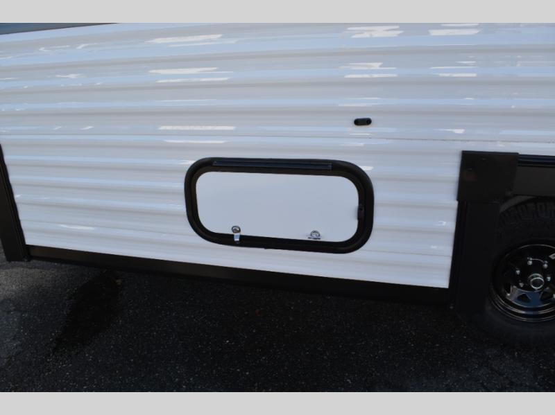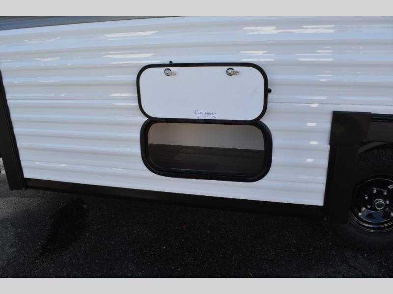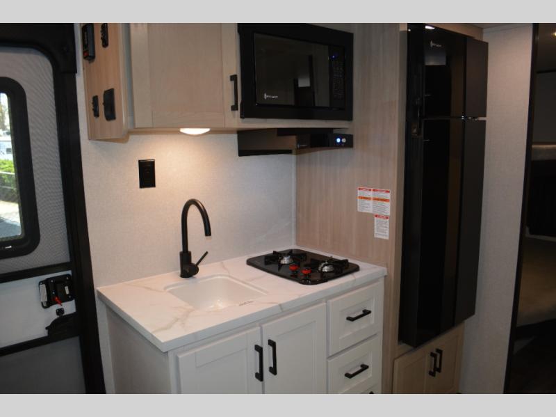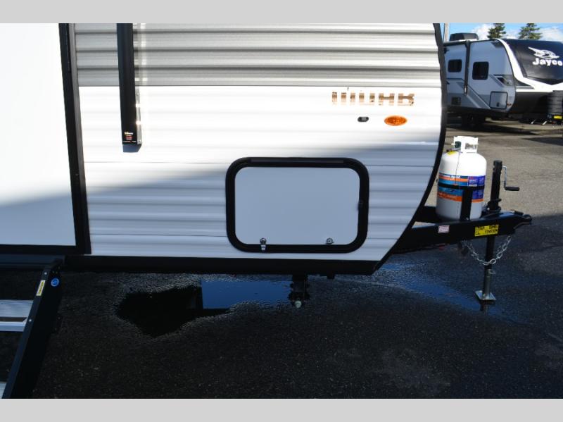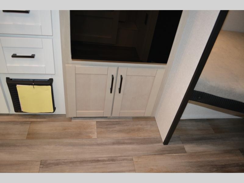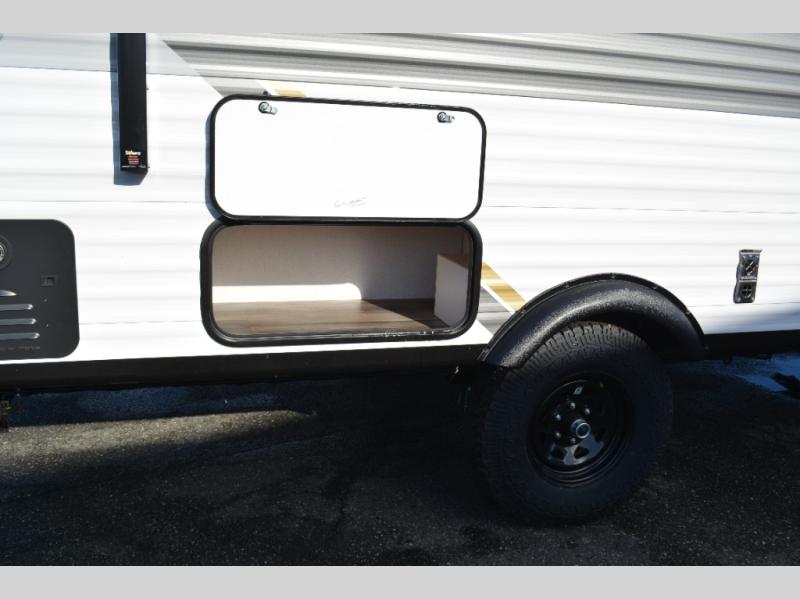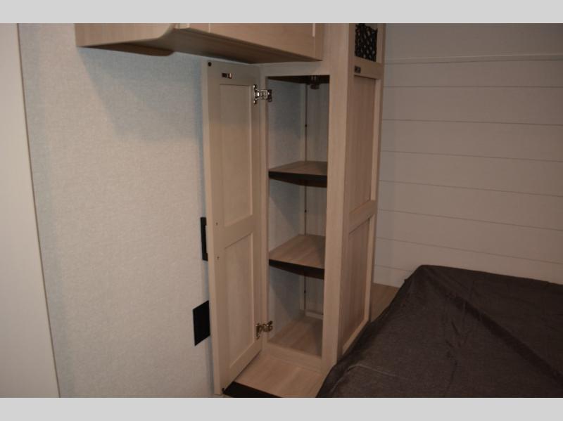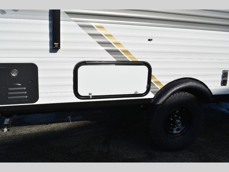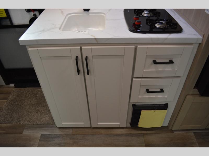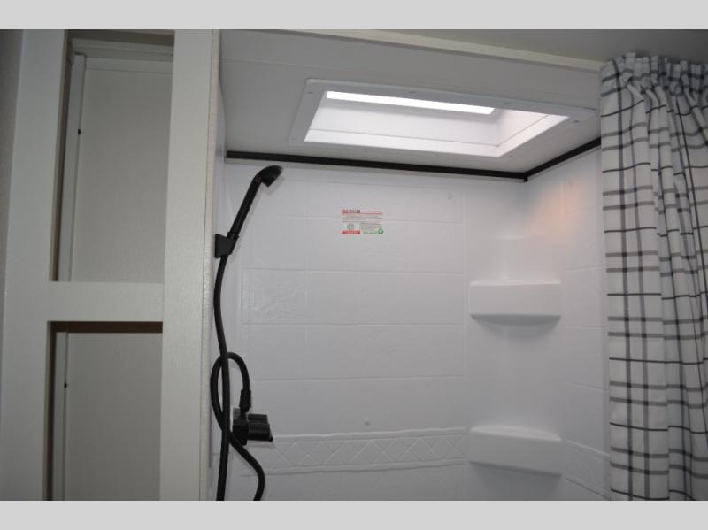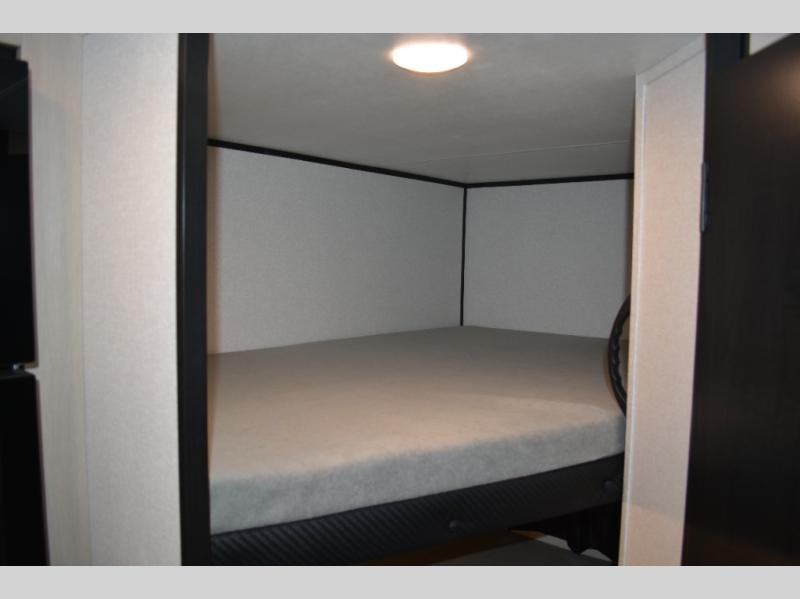 This travel trailer features compact sleeping spaces thanks to the double-size bunk beds in the rear corner, and the private full bath is right next to the bunks for easy nighttime use! You'll have the front Murphy bed all to yourselves, and in the morning, you can fold it away to sit on the jack-knife sofa. A cooktop and microwave oven will let you make meals each day, and there is a 12V refrigerator to keep your cold items fresh. Outside, you'll enjoy the 13' power awning for added shade, and there are two exterior storage compartments to keep fishing poles, hiking gear and more!