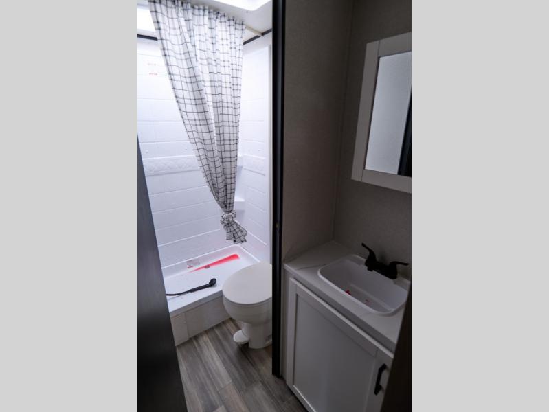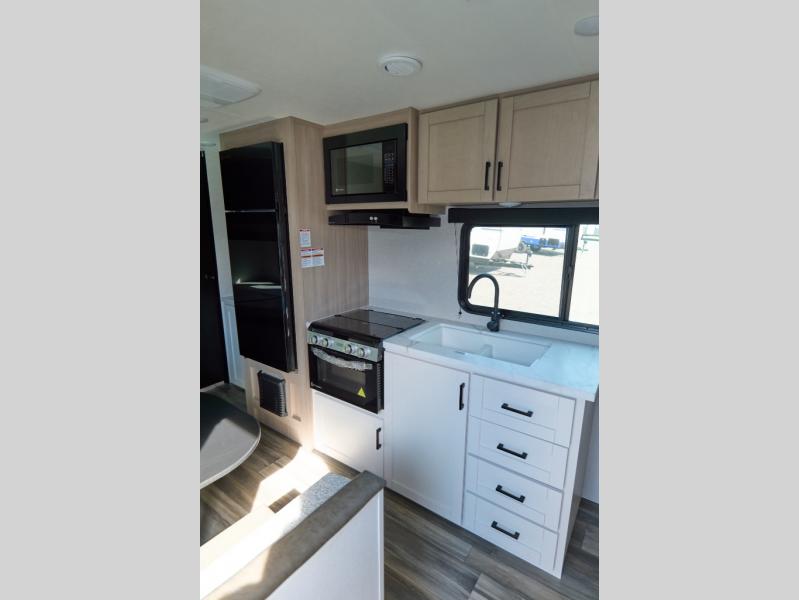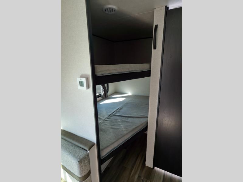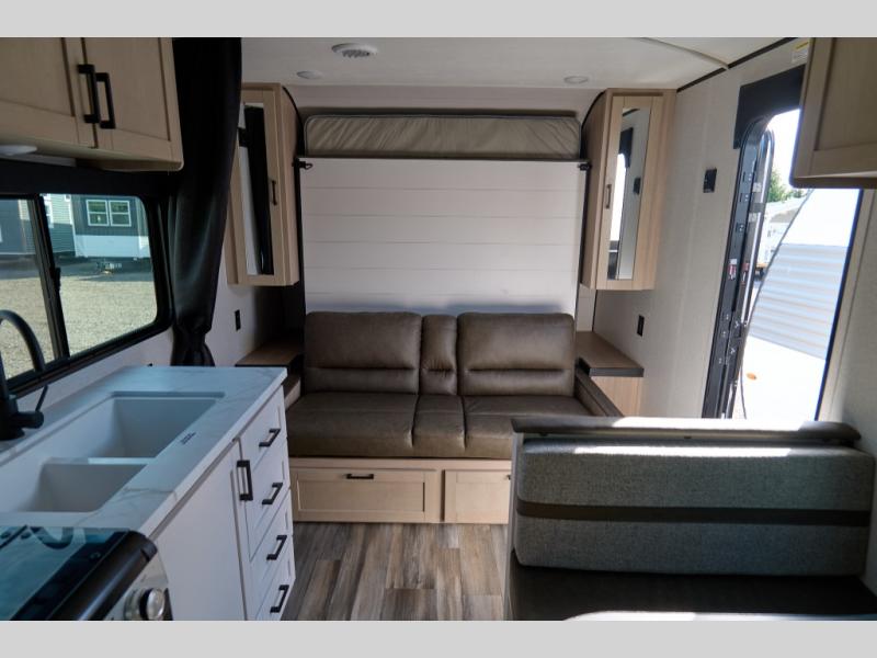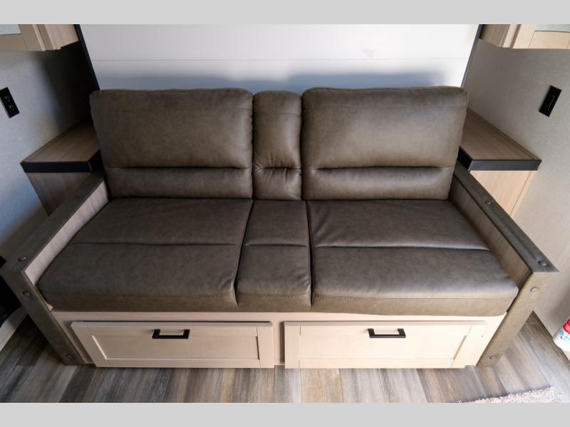 This travel trailer features compact sleeping spaces thanks to the double-size bunk beds in the rear corner, and the private full bath is right next to the bunks for easy nighttime use! You'll have the front Murphy bed all to yourselves, and in the morning, you can fold it away to sit on the jack-knife sofa. A three-burner cooktop and microwave oven will let you make meals each day, and there is a 12V refrigerator to keep your cold items fresh. Outside, you'll enjoy the 13' power awning with LED lights for added shade, and there are two exterior storage compartments to keep fishing poles, hiking gear and more!