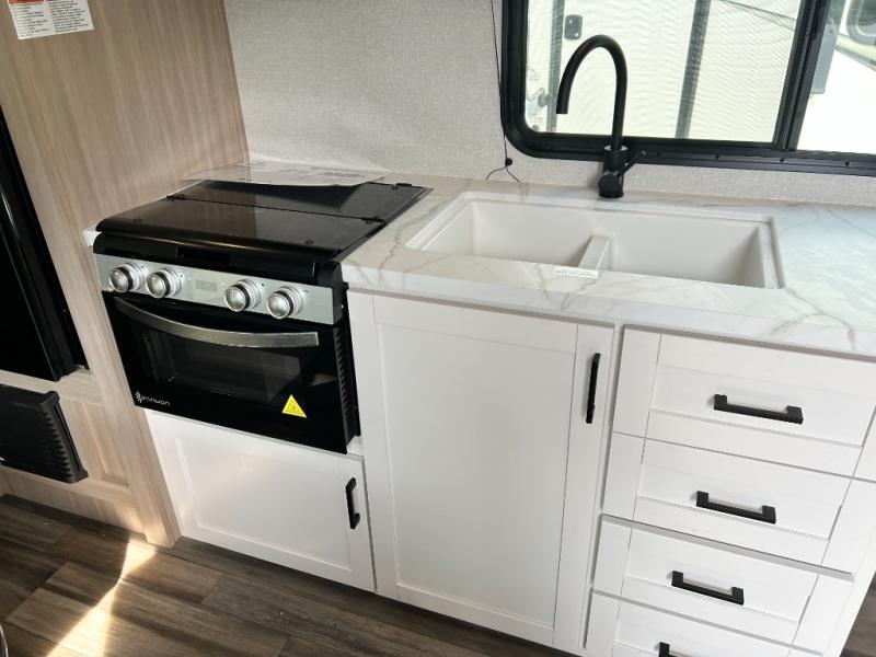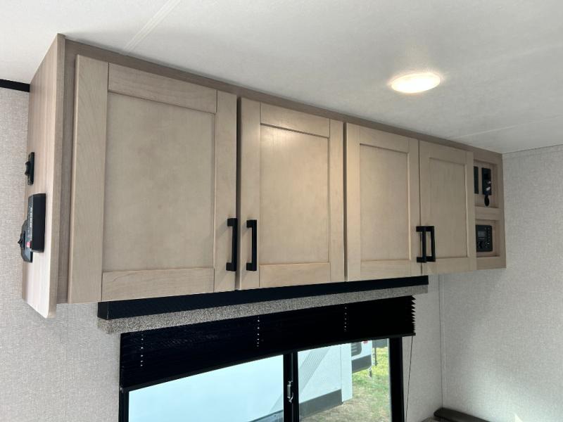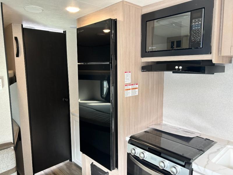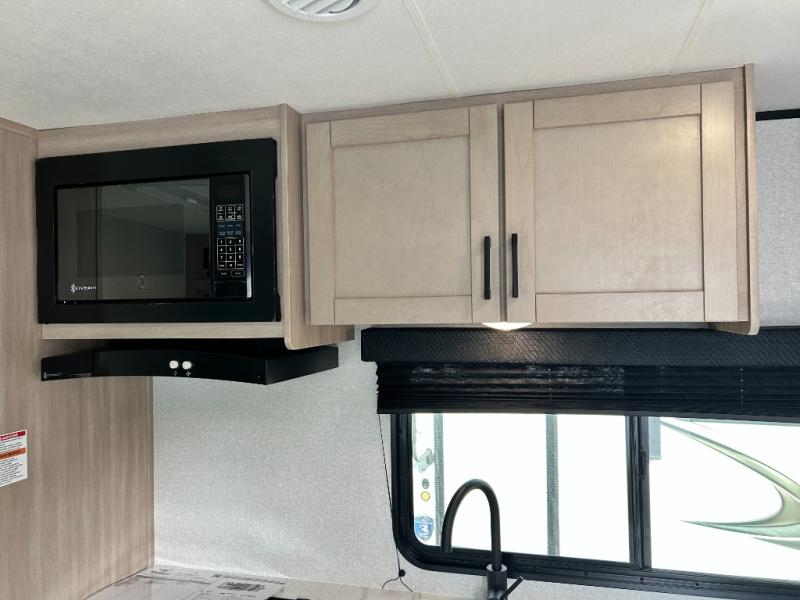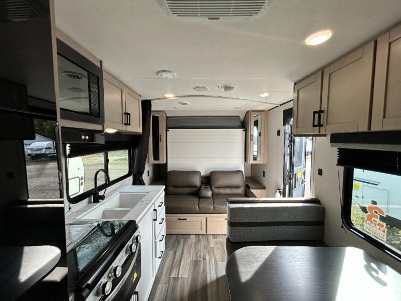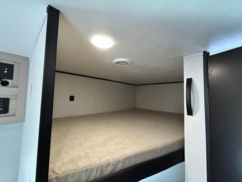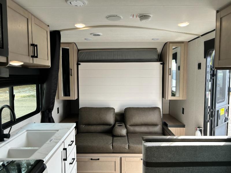 This travel trailer features compact sleeping spaces thanks to the double-size bunk beds in the rear corner, and the private full bath is right next to the bunks for easy nighttime use! You'll have the front Murphy bed all to yourselves, and in the morning, you can fold it away to sit on the jack-knife sofa. A three-burner cooktop and microwave oven will let you make meals each day, and there is a 12V refrigerator to keep your cold items fresh. Outside, you'll enjoy the 13' power awning with LED lights for added shade, and there are two exterior storage compartments to keep fishing poles, hiking gear and more!