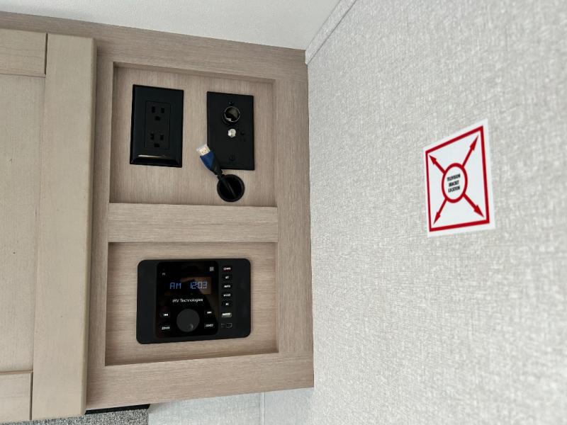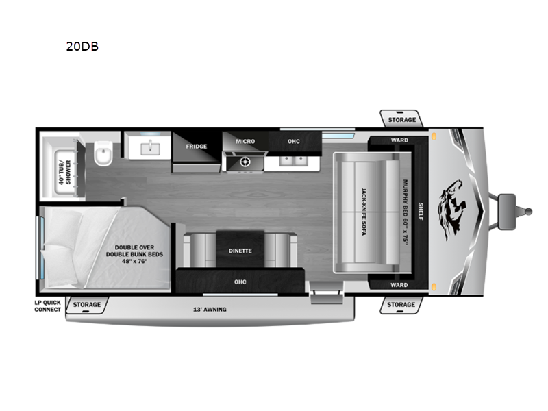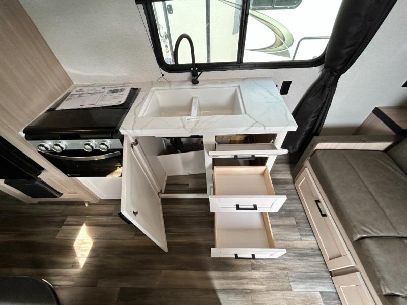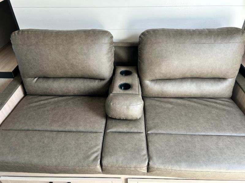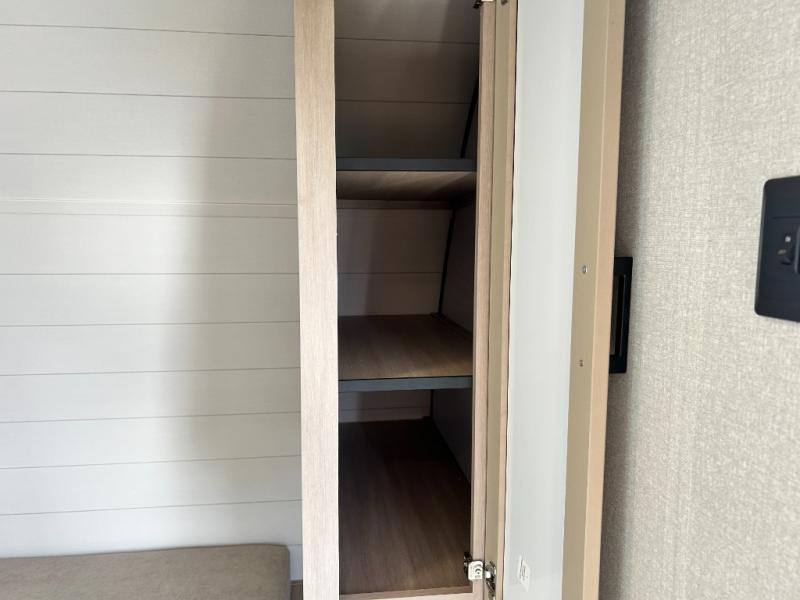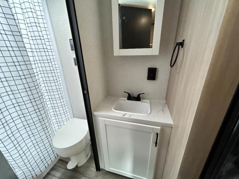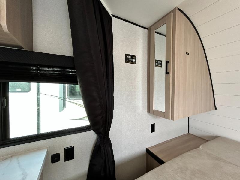 This travel trailer features compact sleeping spaces thanks to the double-size bunk beds in the rear corner, and the private full bath is right next to the bunks for easy nighttime use! You'll have the front Murphy bed all to yourselves, and in the morning, you can fold it away to sit on the jack-knife sofa. A three-burner cooktop and microwave oven will let you make meals each day, and there is a 12V refrigerator to keep your cold items fresh. Outside, you'll enjoy the 13' power awning with LED lights for added shade, and there are two exterior storage compartments to keep fishing poles, hiking gear and more!