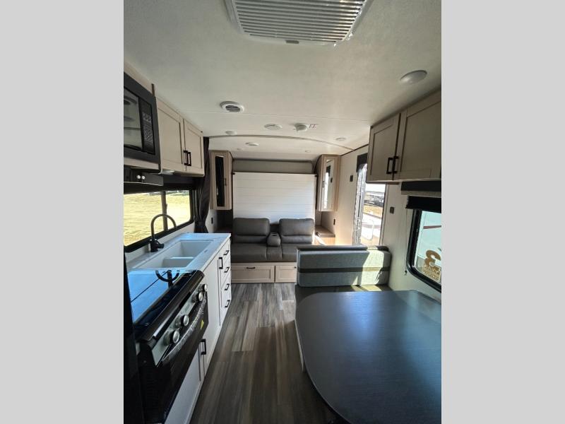 This travel trailer features compact sleeping spaces thanks to the double-size bunk beds in the rear corner, and the private full bath is right next to the bunks for easy nighttime use! You'll have the front Murphy bed all to yourselves, and in the morning, you can fold it away to sit on the jack-knife sofa. A three-burner cooktop and microwave oven will let you make meals each day, and there is a 12V refrigerator to keep your cold items fresh. Outside, you'll enjoy the 13' power awning with LED lights for added shade, and there are two exterior storage compartments to keep fishing poles, hiking gear and more!