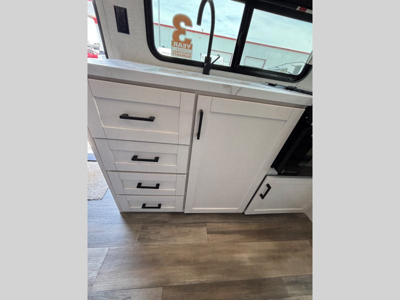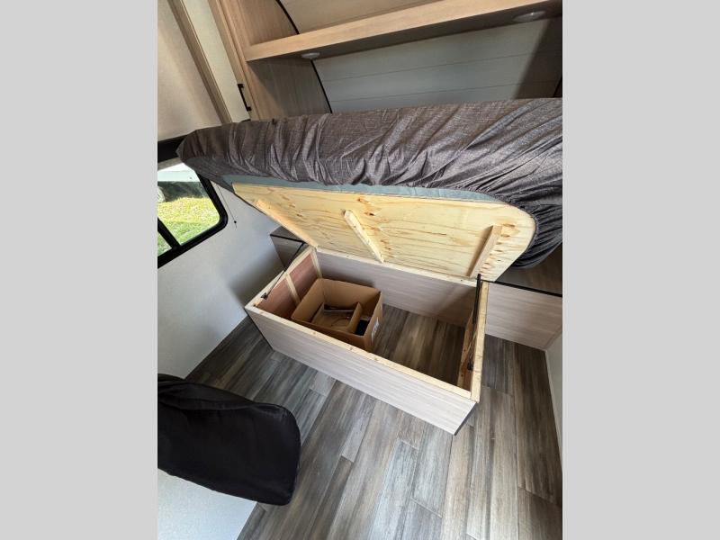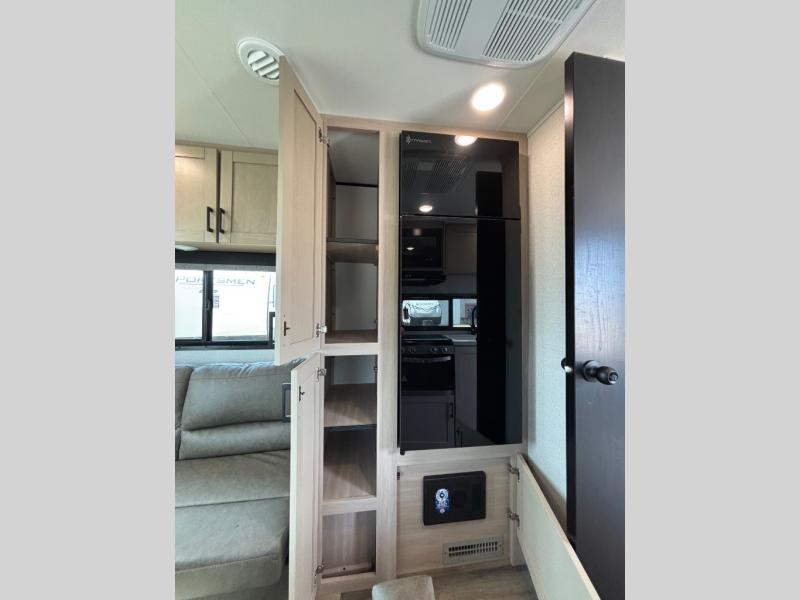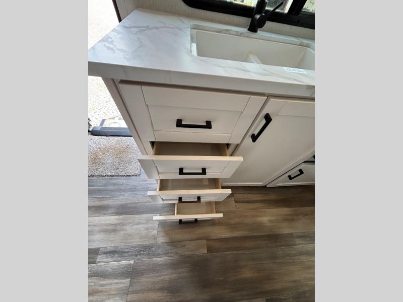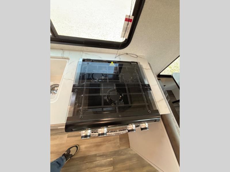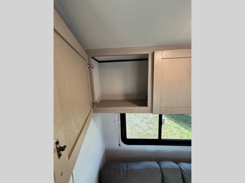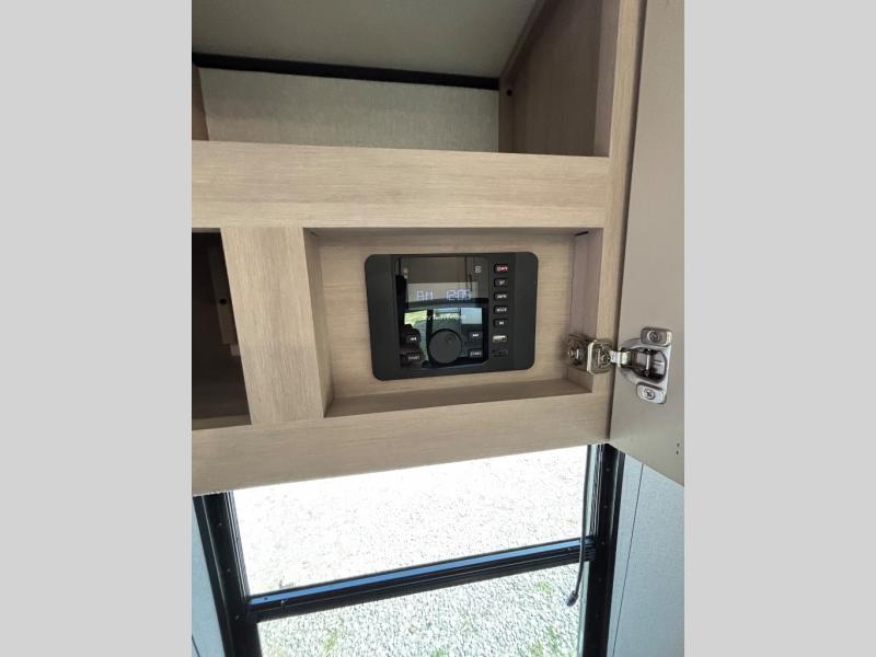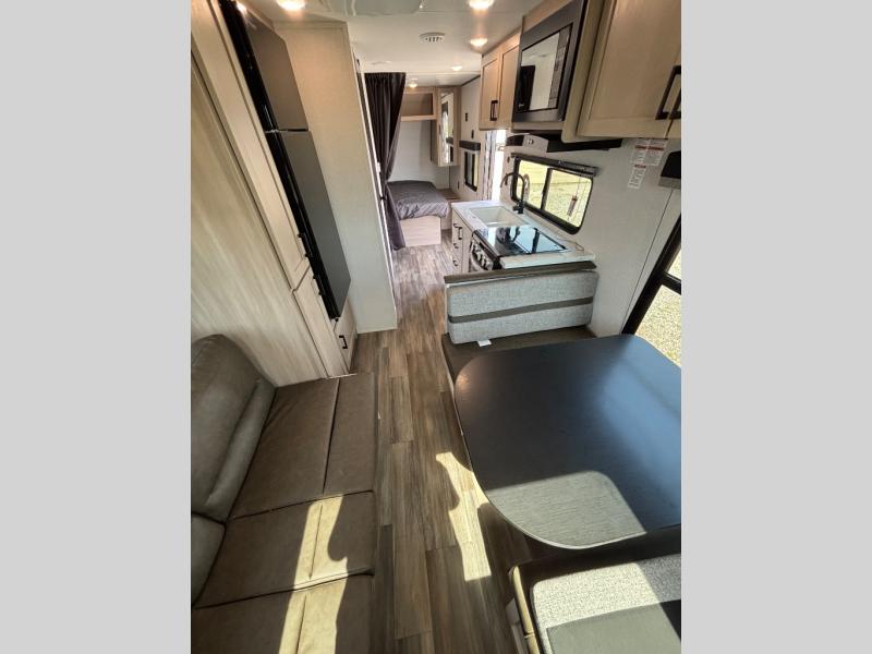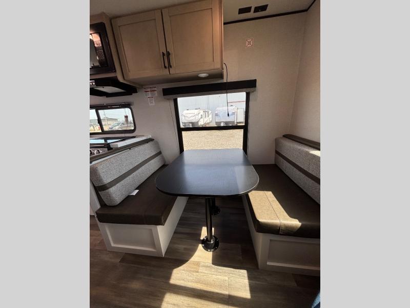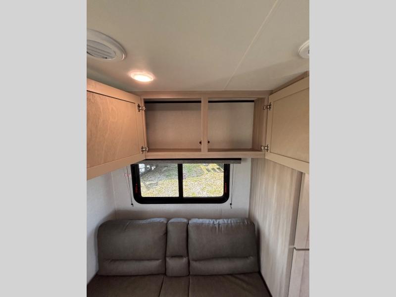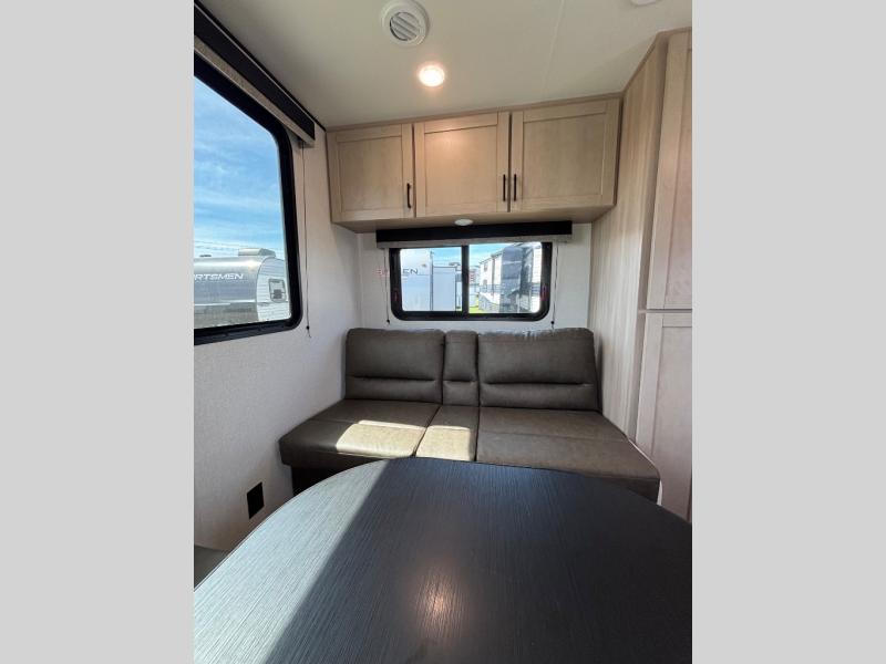 Make each camping trip count in this travel trailer that can sleep four to five each night. You'll wake up feeling refreshed on the front RV queen bed, and there are dual bedside wardrobes to keep your things organized. A middle bath includes a 40" tub/shower, which will make bath time easier if you have little ones. Once breakfast is made on the three-burner cooktop, you can dine at the booth dinette or take your plate outdoors to sit under the 16' power awning with LED lights. This unit also includes a jack-knife sofa, which can be used for sleeping space, along with the dinette!