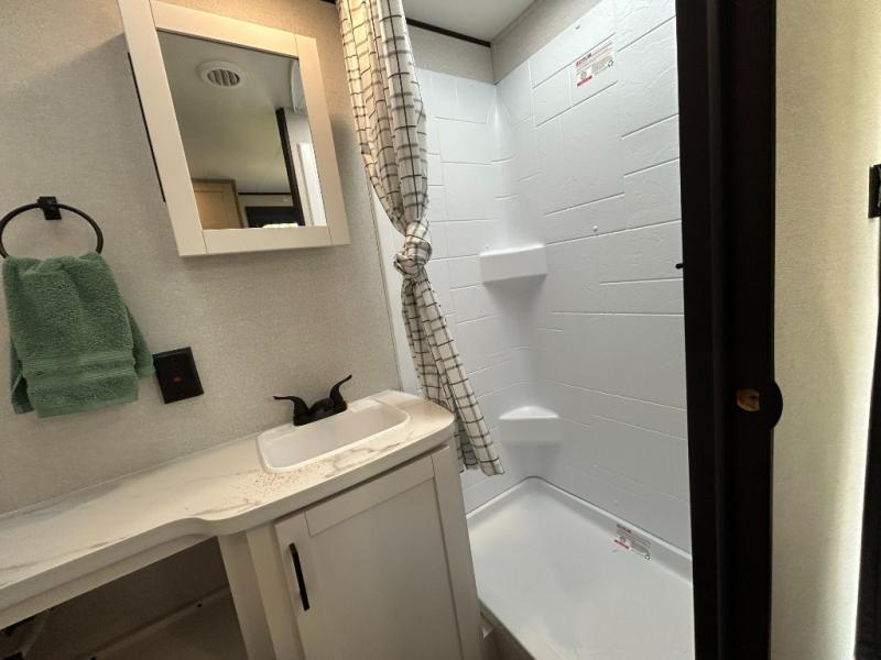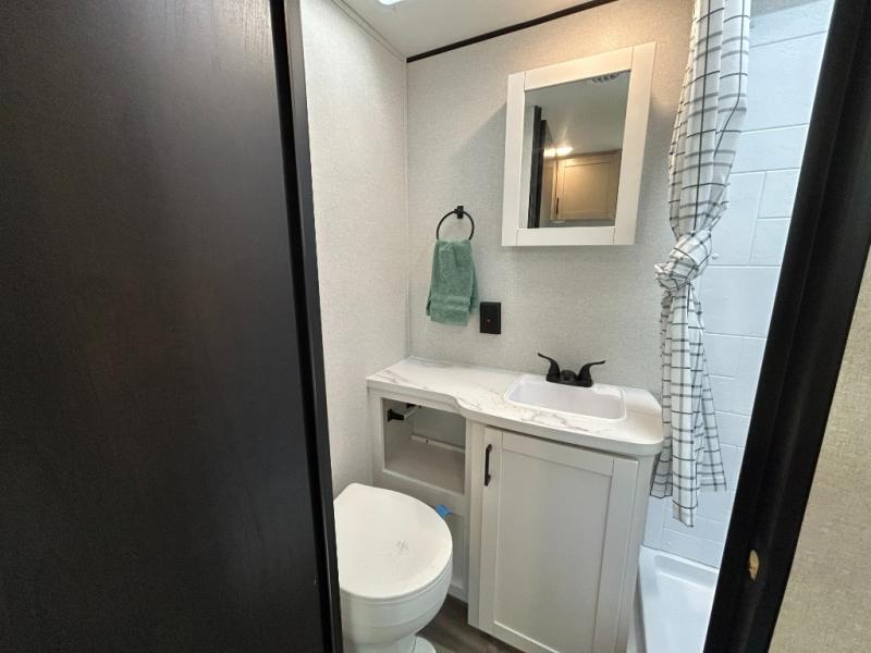 Make each camping trip count in this travel trailer that can sleep four to five each night. You'll wake up feeling refreshed on the front RV queen bed, and there are dual bedside wardrobes to keep your things organized. A middle bath includes a 40" tub/shower, which will make bath time easier if you have little ones. Once breakfast is made on the three-burner cooktop, you can dine at the booth dinette or take your plate outdoors to sit under the 16' power awning with LED lights. This unit also includes a jack-knife sofa, which can be used for sleeping space, along with the dinette!