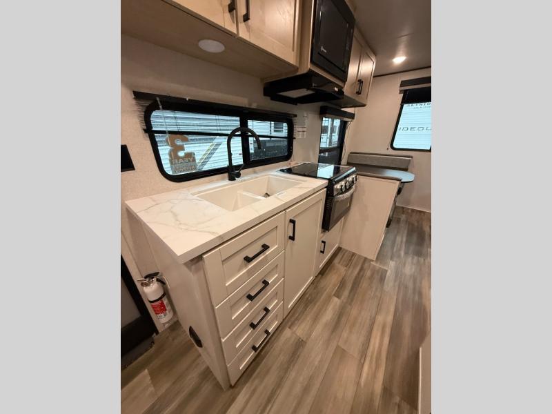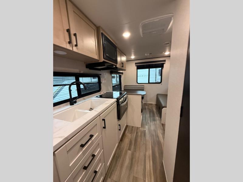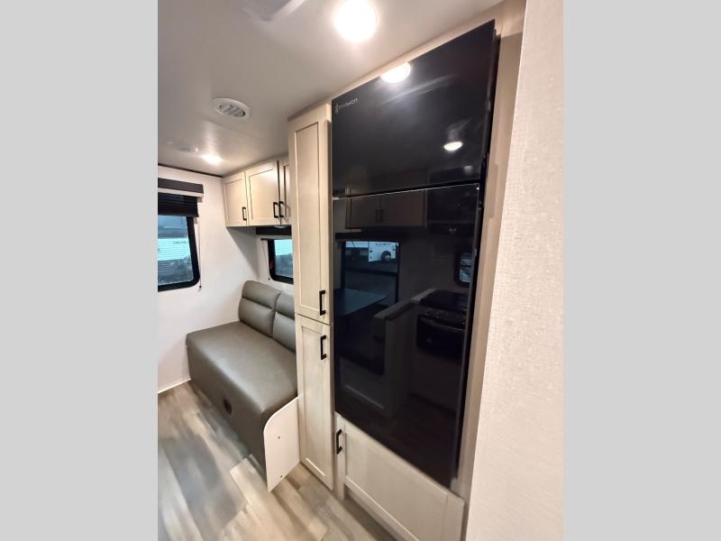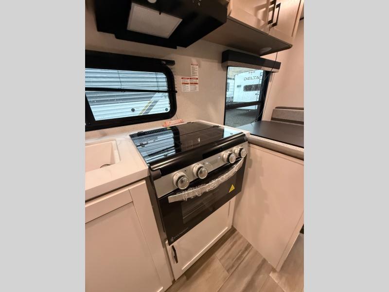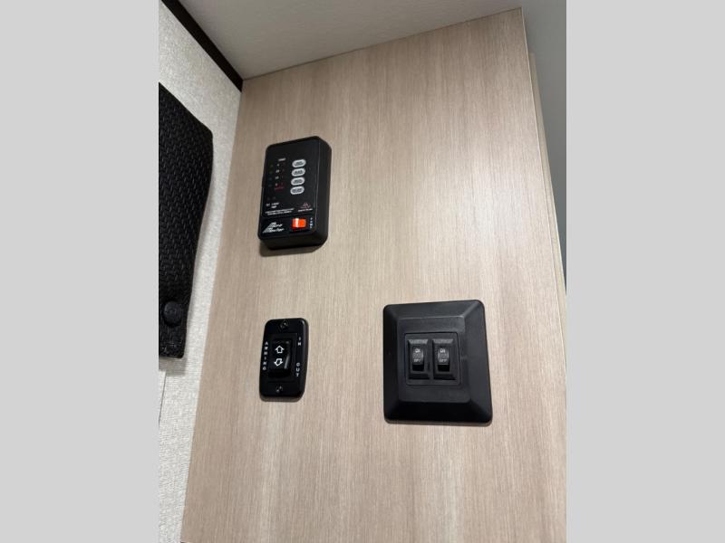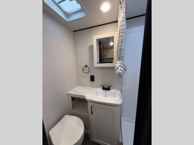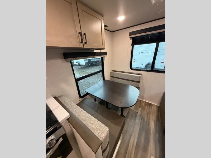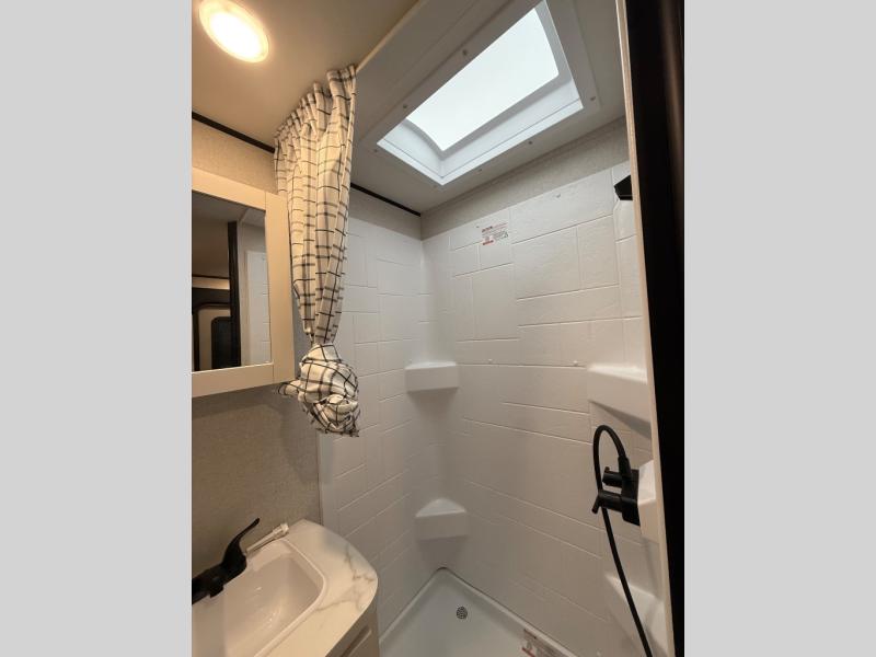 Make each camping trip count in this travel trailer that can sleep four to five each night. You'll wake up feeling refreshed on the front RV queen bed, and there are dual bedside wardrobes to keep your things organized. A middle bath includes a 40" tub/shower, which will make bath time easier if you have little ones. Once breakfast is made on the three-burner cooktop, you can dine at the booth dinette or take your plate outdoors to sit under the 16' power awning with LED lights. This unit also includes a jack-knife sofa, which can be used for sleeping space, along with the dinette!