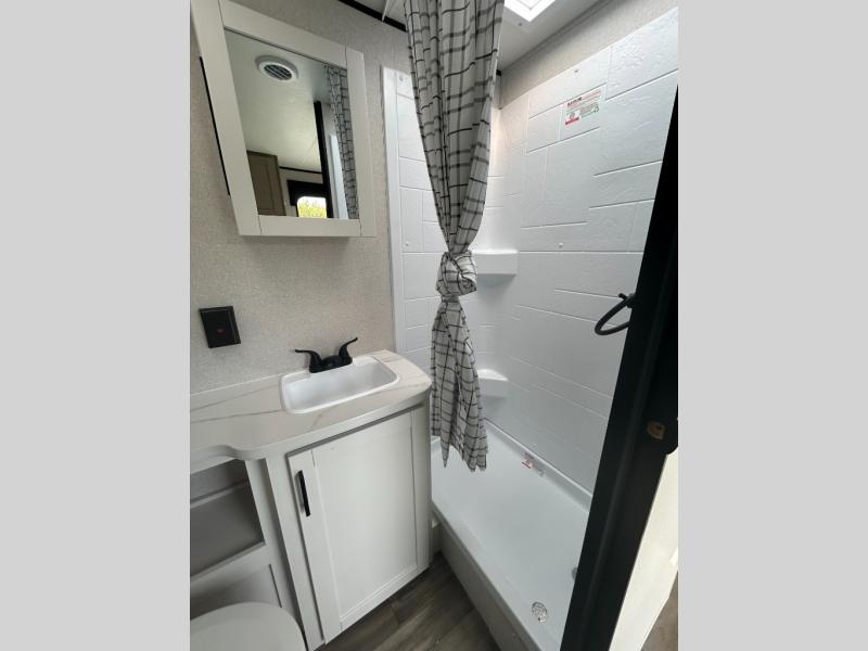 Make each camping trip count in this travel trailer that can sleep four to five each night. You'll wake up feeling refreshed on the front RV queen bed, and there are dual bedside wardrobes to keep your things organized. A middle bath includes a 40" tub/shower, which will make bath time easier if you have little ones. Once breakfast is made on the three-burner cooktop, you can dine at the booth dinette or take your plate outdoors to sit under the 16' power awning with LED lights. This unit also includes a jack-knife sofa, which can be used for sleeping space, along with the dinette!