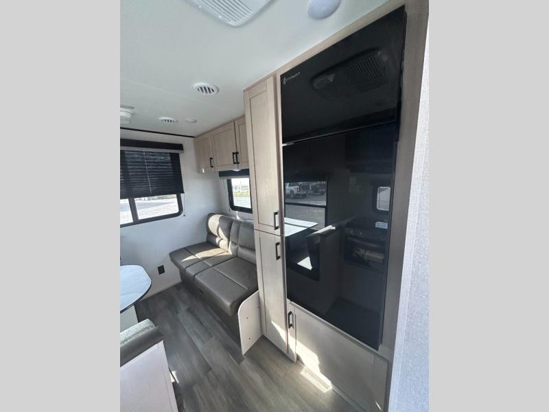 Make each camping trip count in this travel trailer that can sleep four to five each night. You'll wake up feeling refreshed on the front RV queen bed, and there are dual bedside wardrobes to keep your things organized. A middle bath includes a 40" tub/shower, which will make bath time easier if you have little ones. Once breakfast is made on the three-burner cooktop, you can dine at the booth dinette or take your plate outdoors to sit under the 16' power awning with LED lights. This unit also includes a jack-knife sofa, which can be used for sleeping space, along with the dinette!