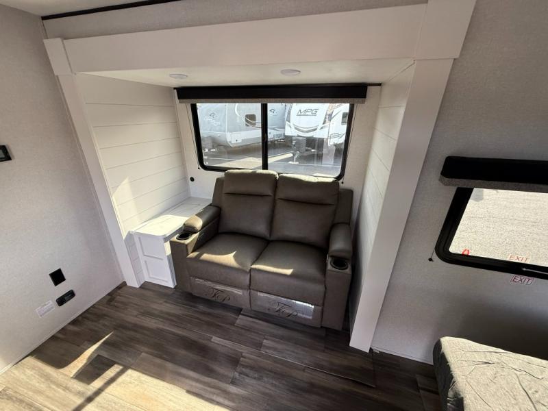 This couple's travel trailer is perfect for weekend trips to the lake! Once you arrive at the campground, you can unload the exterior storage, put out the 17' power awning with LED lights, then relax in your camp chairs. Head inside to make lunch on the three-burner cooktop in the rear corner kitchen, and you'll be pleased to find ample counter space here. The theater seat includes swivel tables where you can dine together, and the front queen bed is sure to bring a great night's rest!