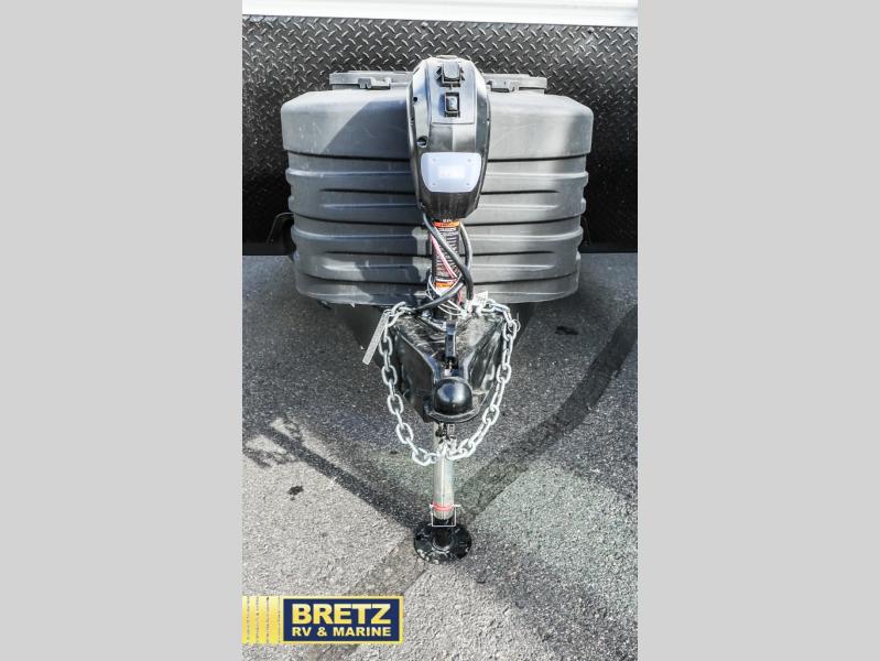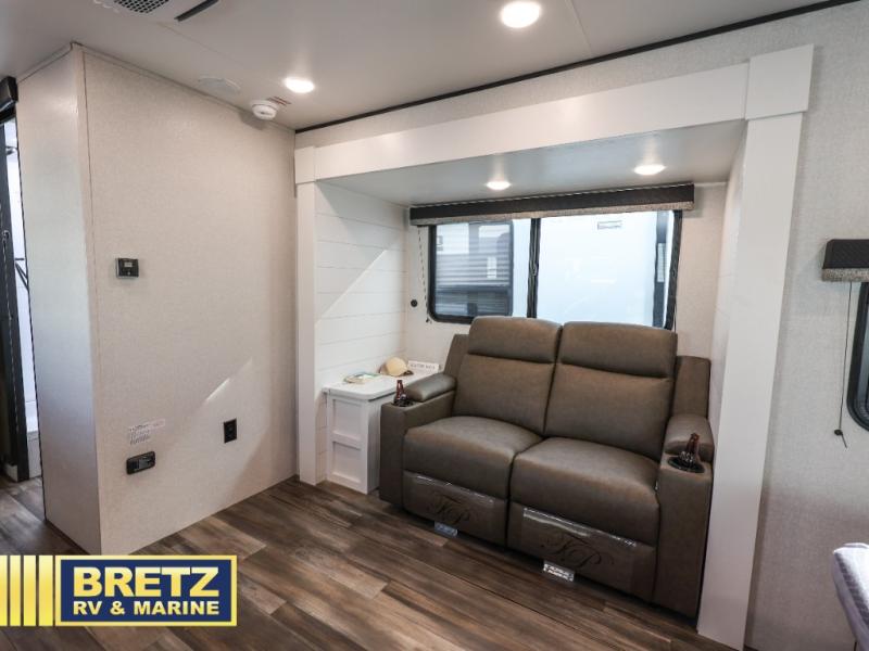 This couple's travel trailer is perfect for weekend trips to the lake! Once you arrive at the campground, you can unload the exterior storage, put out the 17' power awning with LED lights, then relax in your camp chairs. Head inside to make lunch on the three-burner cooktop in the rear corner kitchen, and you'll be pleased to find ample counter space here. The theater seat includes swivel tables where you can dine together, and the front queen bed is sure to bring a great night's rest!