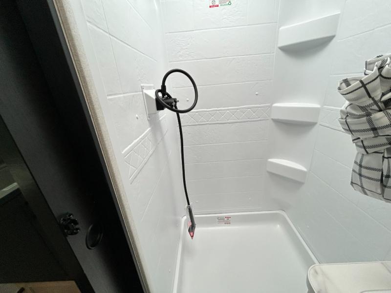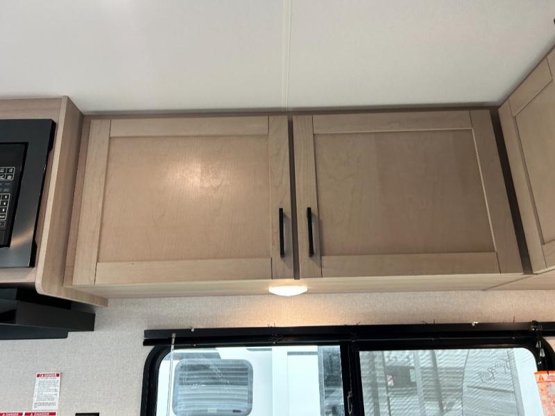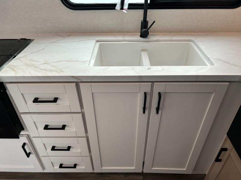 This couple's travel trailer is perfect for weekend trips to the lake! Once you arrive at the campground, you can unload the exterior storage, put out the 17' power awning with LED lights, then relax in your camp chairs. Head inside to make lunch on the three-burner cooktop in the rear corner kitchen, and you'll be pleased to find ample counter space here. The theater seat includes swivel tables where you can dine together, and the front queen bed is sure to bring a great night's rest!