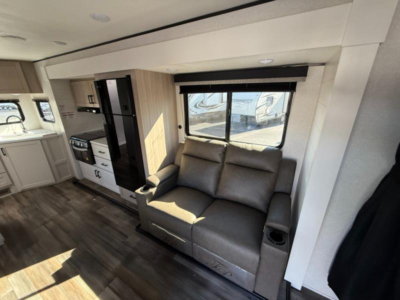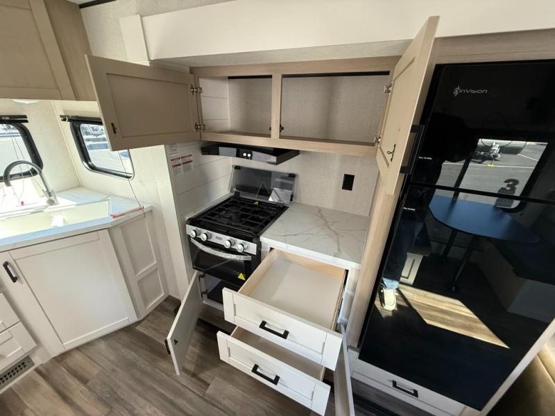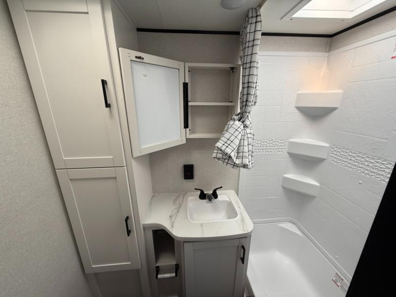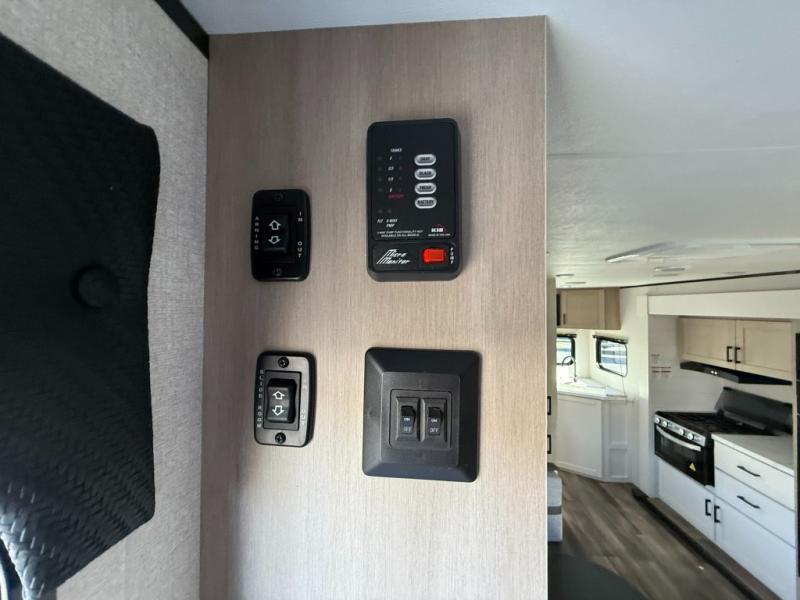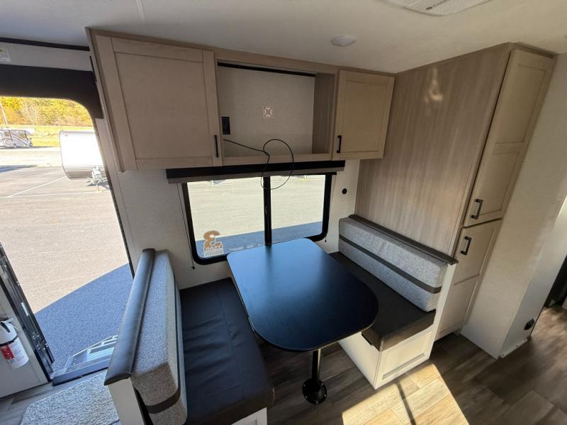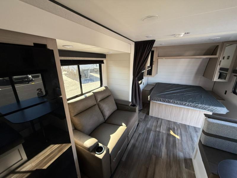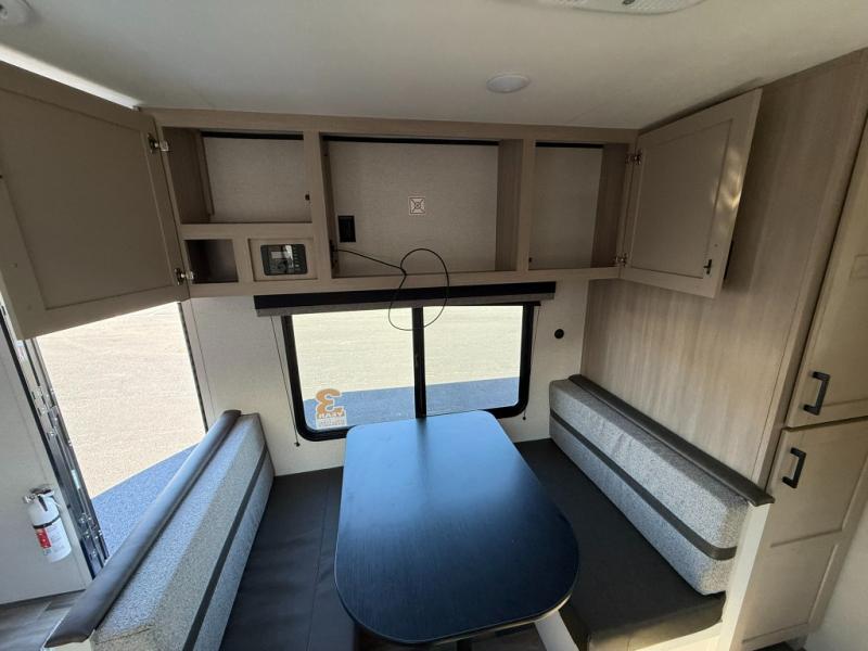 This travel trailer is perfect for weekend trips to the lake! Once you arrive at the campground, you can unload the exterior storage, put out the 18' power awning with LED lights, then relax in your camp chairs. Head inside to make lunch on the three-burner cooktop in the rear corner kitchen, and you'll find the full bath in the other rear corner for quick access. A booth dinette provides a place to dine together, and a theater seat within the large slide out is sure to bring comfort. This unit includes a queen bed in the front semi-private bedroom with a privacy curtain and dual wardrobes for your things!